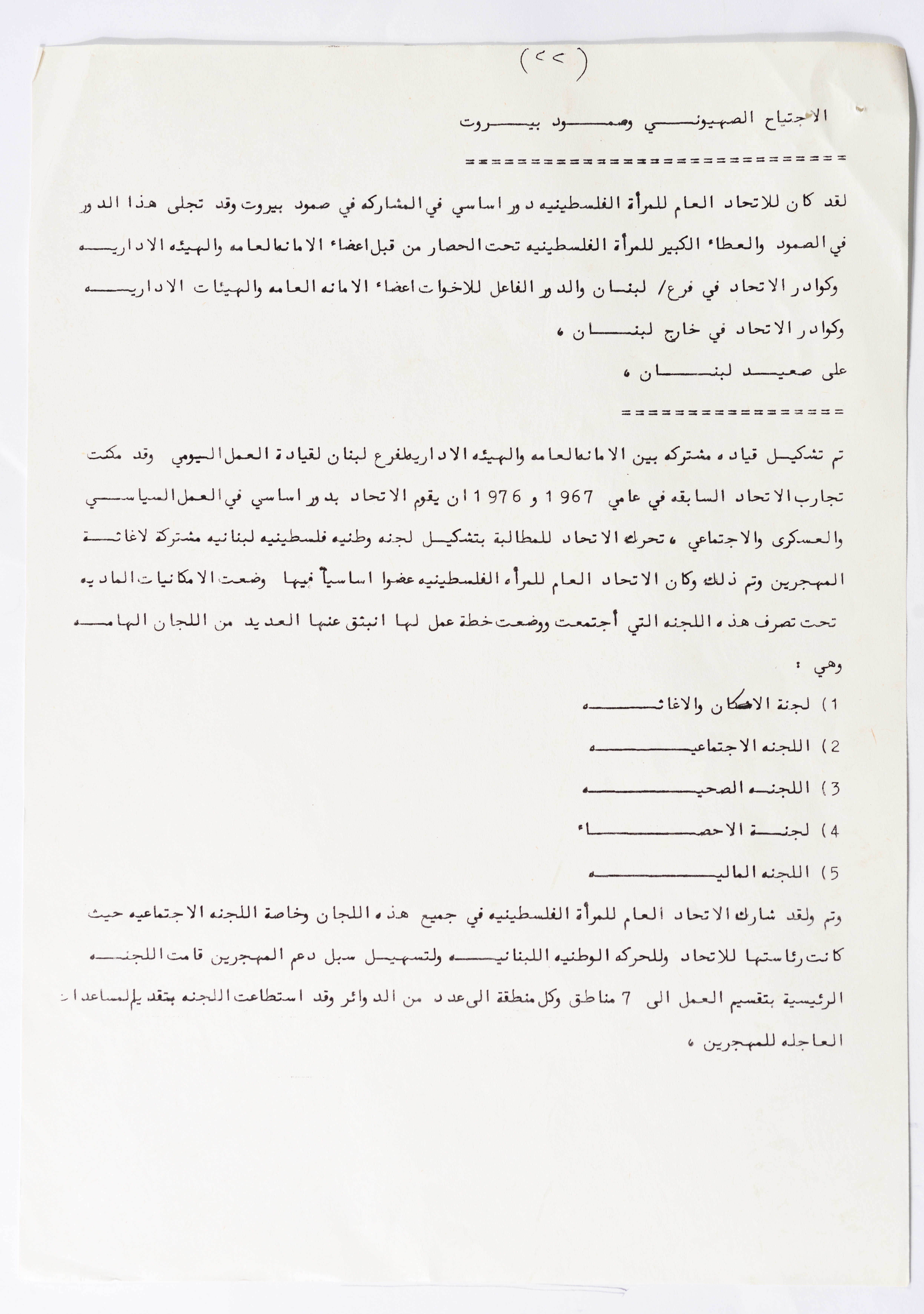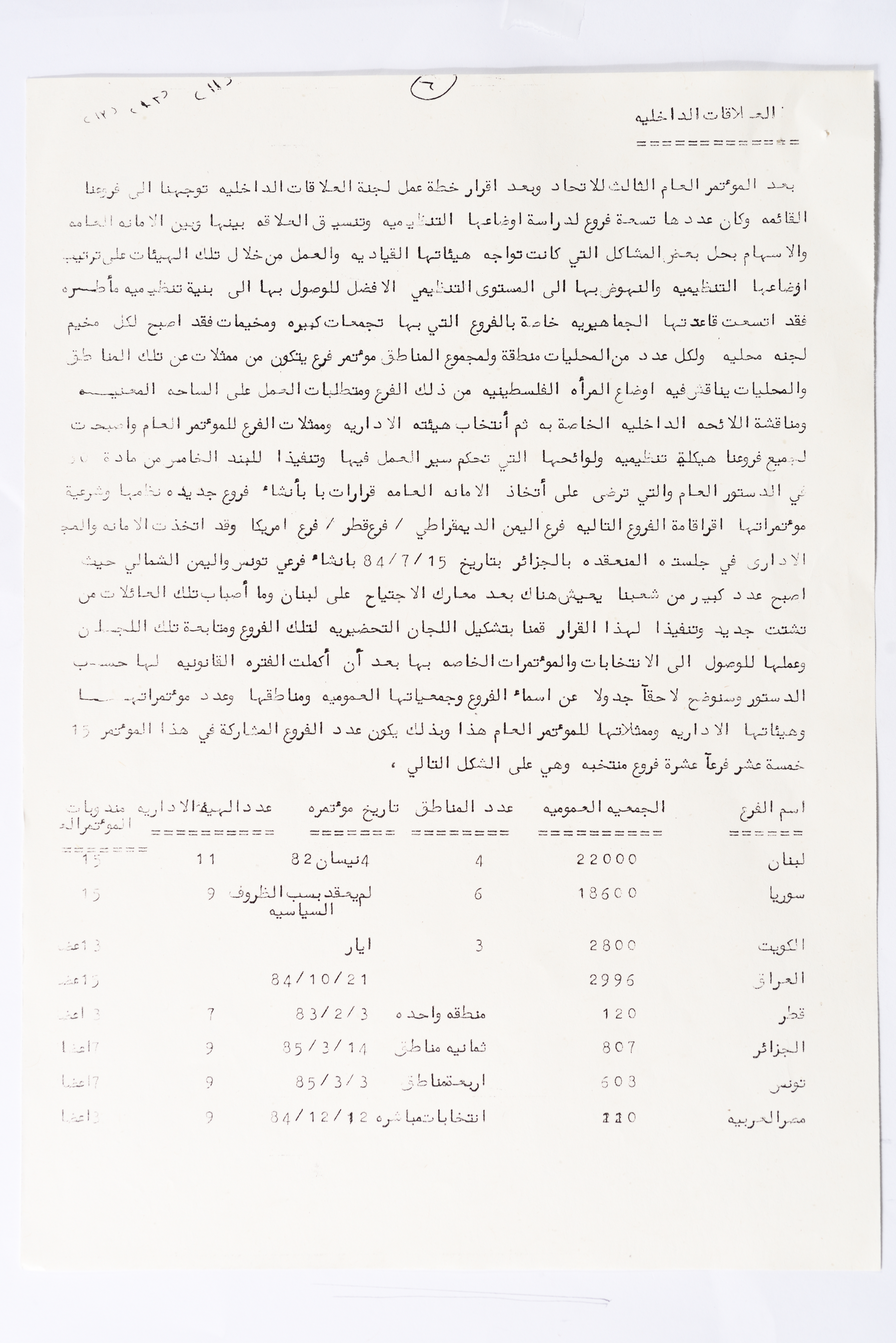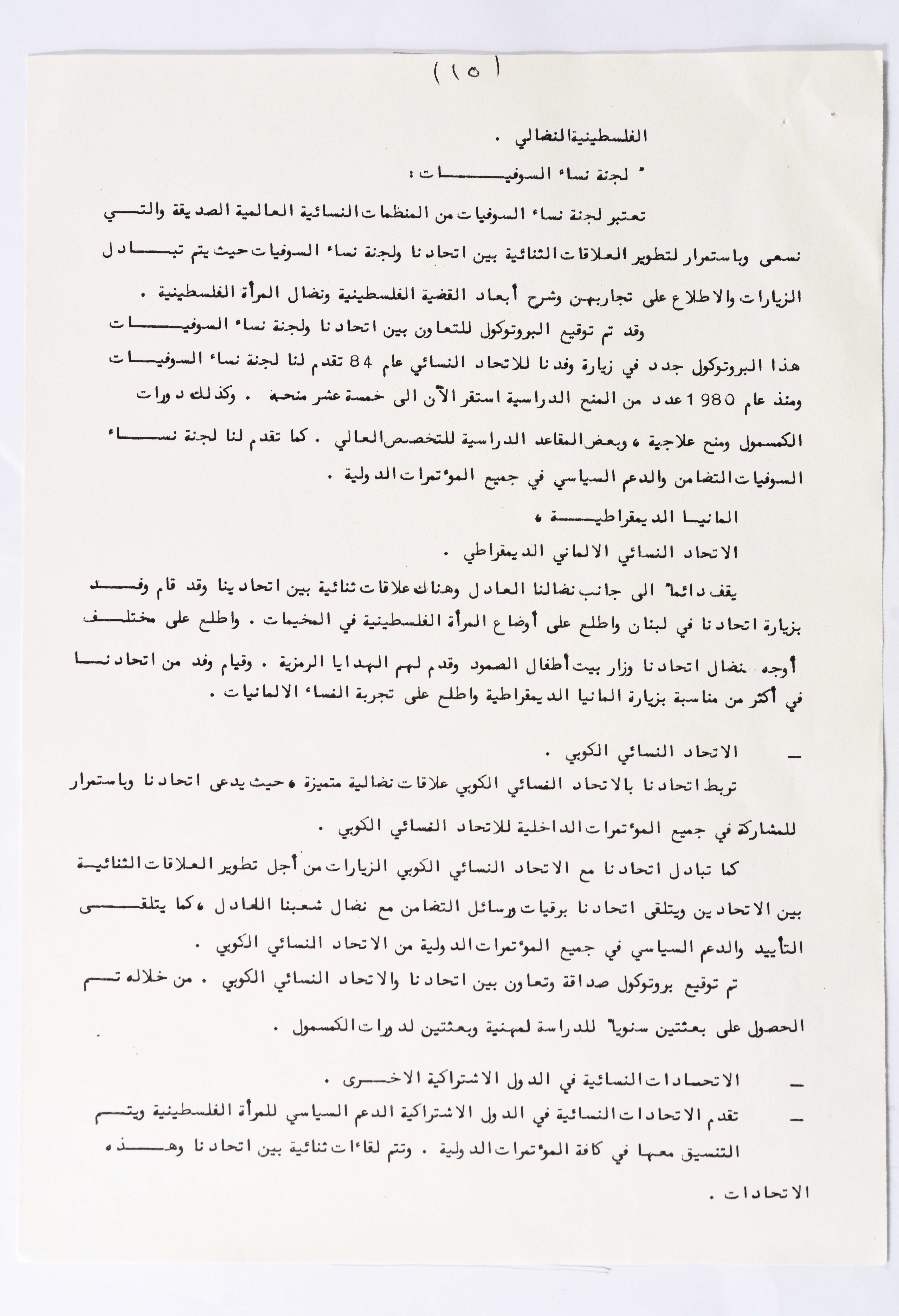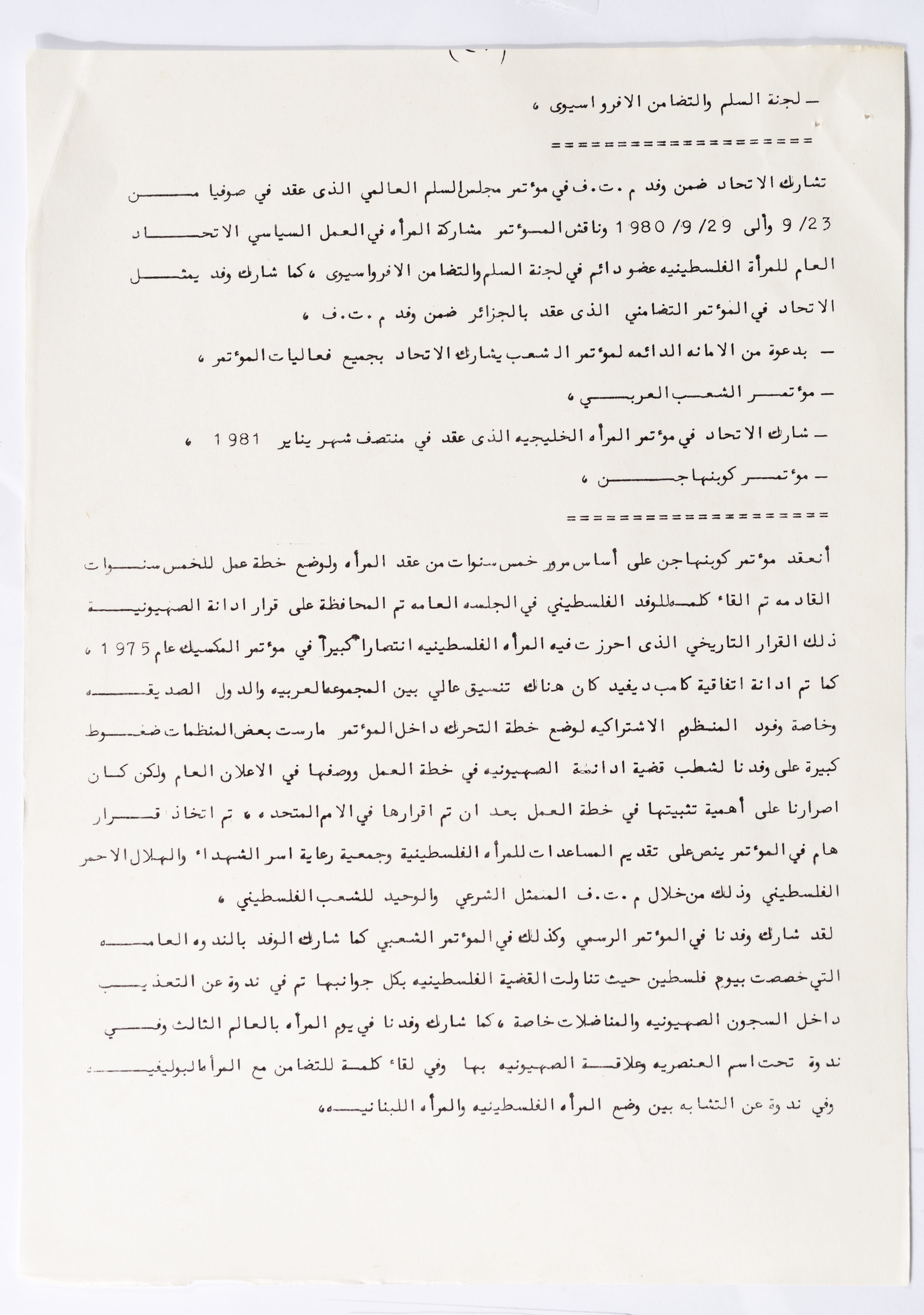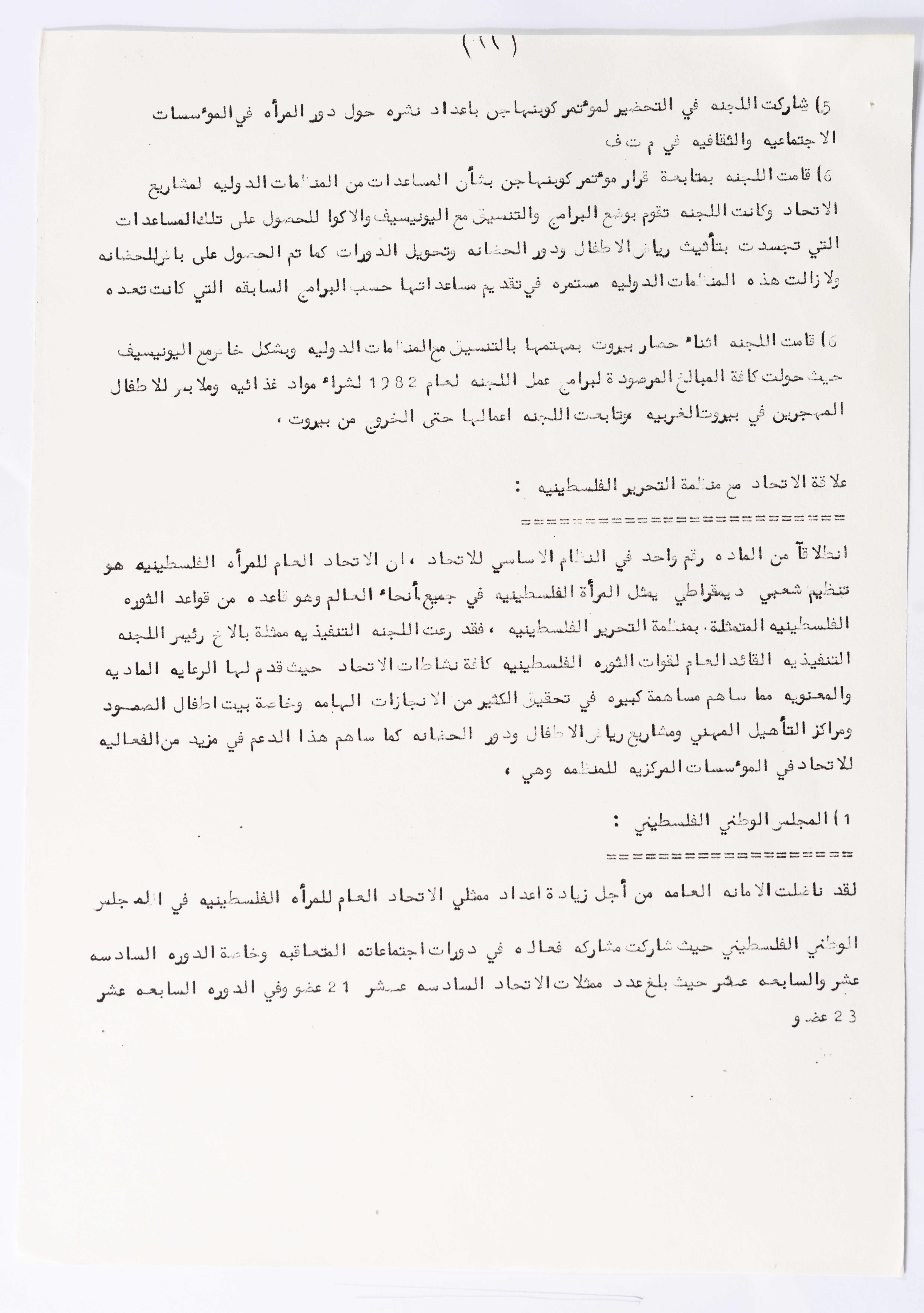 In this document, we find the literary report submitted by the General Secretariat of the General Union of Palestinian Women to the fourth conference of the Union held in Tunis, which dealt with a detailed review of the activities and activities of the General Federation of Palestinian Women. He explained why the General Conference was not held in time and in a delay due to political and military conditions and attempts to strike. The report also praised the Palestinian revolution and the Lebanese people and praised its steadfastness. The report began by talking about the administrative council, its work and its follow-up to the political events and data releases to follow up and search for solutions to problems, overcoming obstacles and crises and preparing for the general conference. It also presented the work of the Secretariat and its adoption of internal regulations and commitment to periodic meetings and the creation of new branches of the Union and supervision. The report began by talking about the administrative council, its work and its follow-up to the political events and data releases to follow up and search for solutions to problems, overcoming obstacles and crises and preparing for the general conference. It also presented the work of the Secretariat and its adoption of internal regulations and commitment to periodic meetings and the creation of new branches of the Union and supervision. As well as the activities of the branches of the Union individually, such as raising women's awareness and rehabilitation projects for women, literacy courses, establishing nurseries and working on reviving the Palestinian heritage, reviving national events, defending the revolution, celebrating March 8, holding seminars and visiting families of shaheeds. The report explained the work of the central committees and the nature of their work: Committee on Foreign Relations: and prepared for conferences and the work of the report and the establishment of courses. And the Committee on Internal Relations: Talk about the study of the situation of the branches and solve problems and the establishment of new branches of the Union. In addition to the Committee on Information: It has re-formed the editorial board of the Palestinian magazine Al-Thaerah and issued posters and cards at national events and preparing for conferences. Cultural Committee: Worked to prepare seminars and collect books on Palestinian women and the work of education sessions. Social Committee: Its work focuses on three aspects: 1- Health 2- Kindergartens 3- Women and vocational rehabilitation. The report also mentioned the Federation's relationship with the PLO and noted that the Union was able to increase the share of women in the National Assembly from 21 to 23. In addition to the presence of three representatives in the Central Council and their representative in the Supreme Council for Education, Culture and Science. And 3 delegates in the Supreme Council for Literacy, and contribute to the development of plans for the Central Council of Kindergartens. And to participate in the membership of the Committee on the affairs of the occupied homeland and follow-up issues and the Committee for the Defense of Prisoners and Detainees and committees of friendship with peoples and international organizations. The report also mentioned the conferences and visits of the General Federation.