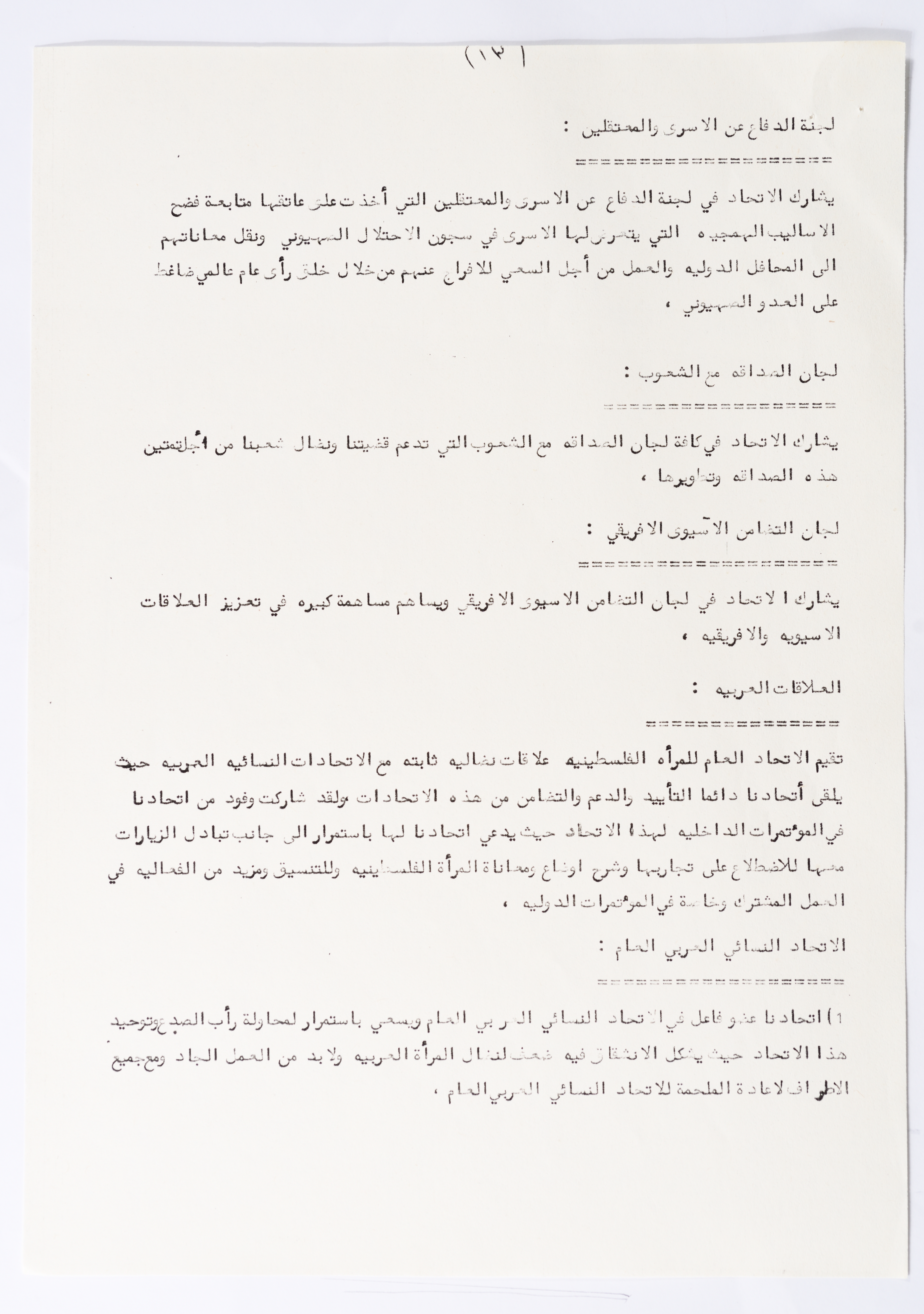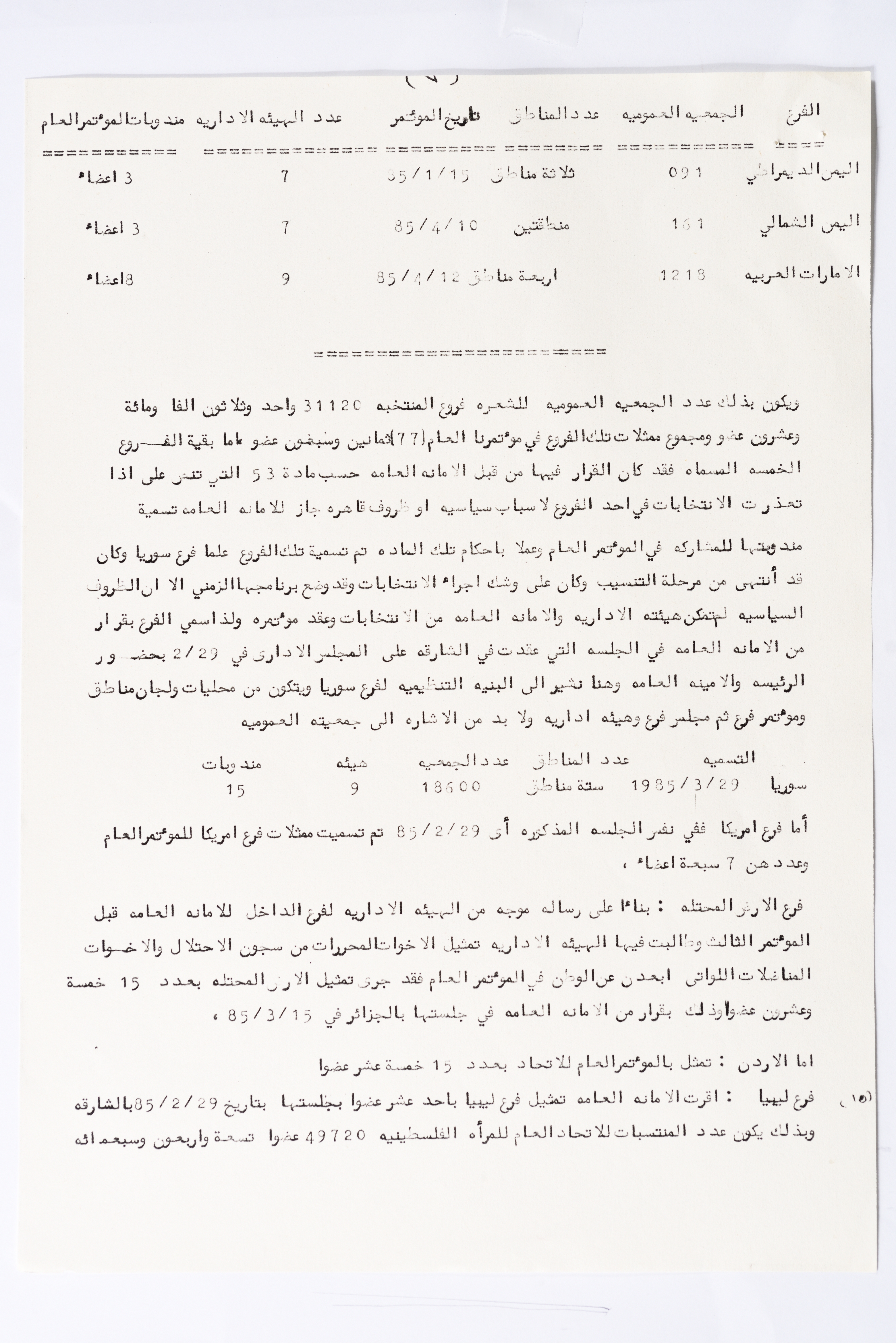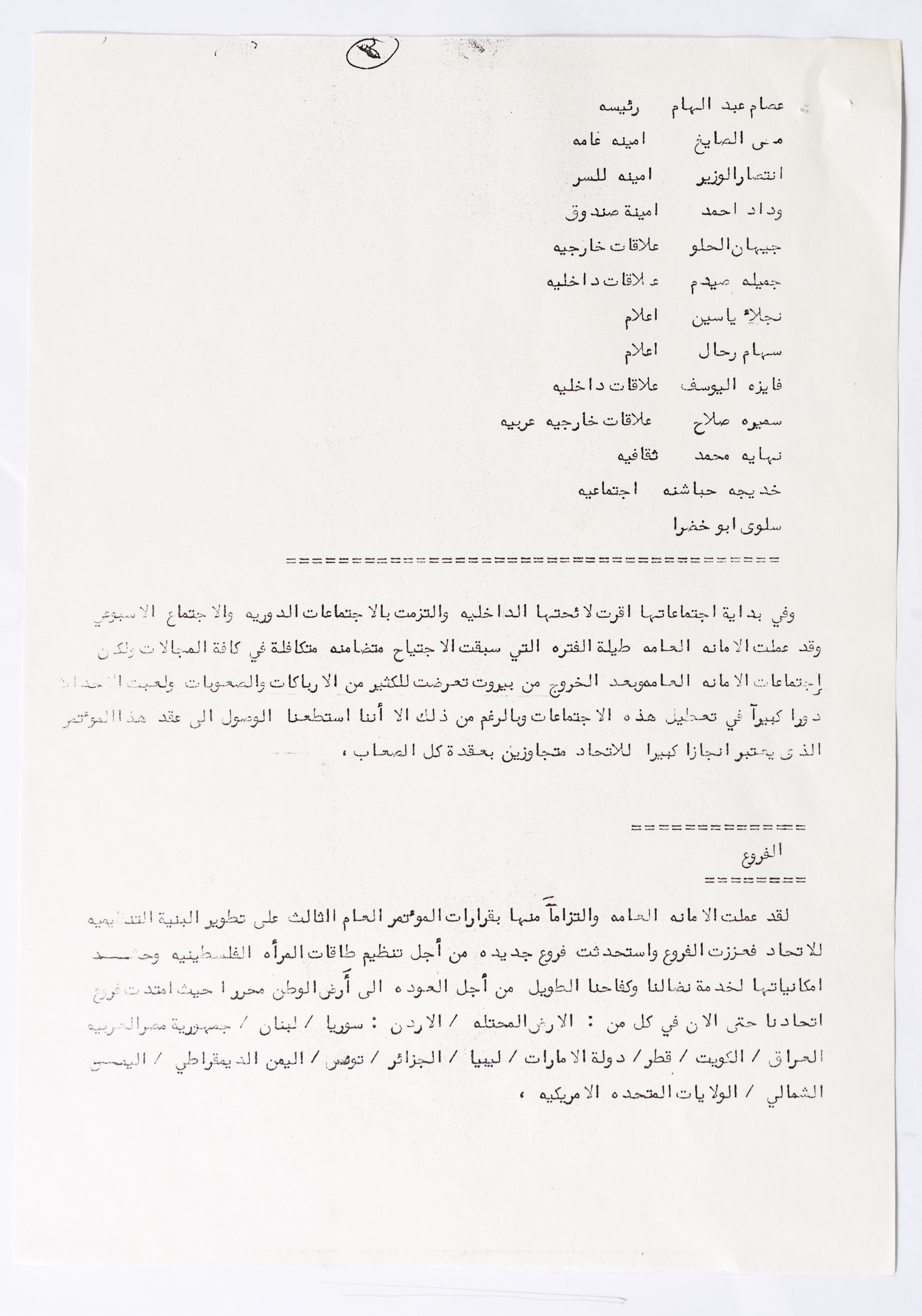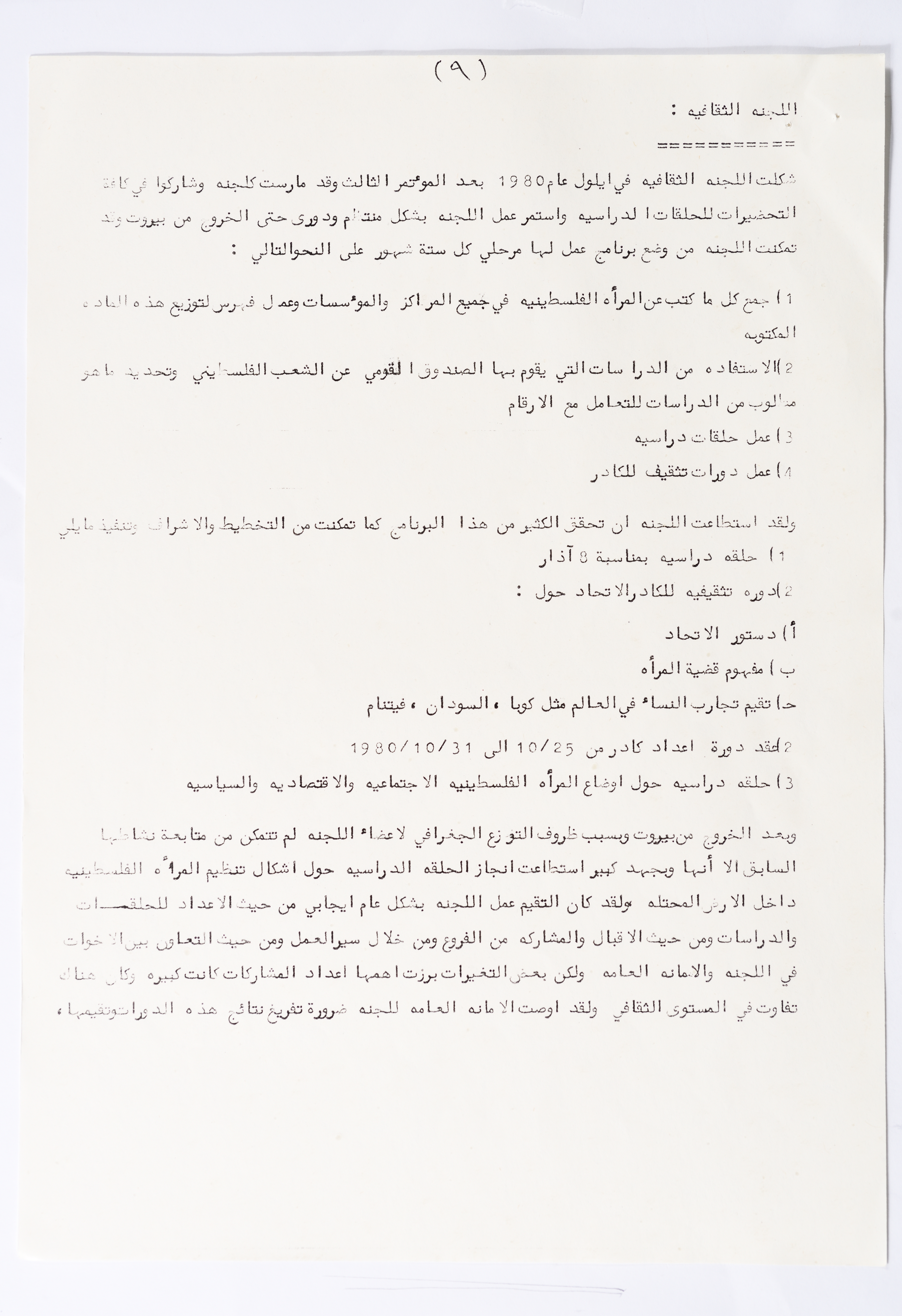 In this document, we find the literary report submitted by the General Secretariat of the General Union of Palestinian Women to the fourth conference of the Union held in Tunis, which dealt with a detailed review of the activities and activities of the General Federation of Palestinian Women. He explained why the General Conference was not held in time and in a delay due to political and military conditions and attempts to strike. The report also praised the Palestinian revolution and the Lebanese people and praised its steadfastness. The report began by talking about the administrative council, its work and its follow-up to the political events and data releases to follow up and search for solutions to problems, overcoming obstacles and crises and preparing for the general conference. It also presented the work of the Secretariat and its adoption of internal regulations and commitment to periodic meetings and the creation of new branches of the Union and supervision. The report began by talking about the administrative council, its work and its follow-up to the political events and data releases to follow up and search for solutions to problems, overcoming obstacles and crises and preparing for the general conference. It also presented the work of the Secretariat and its adoption of internal regulations and commitment to periodic meetings and the creation of new branches of the Union and supervision. As well as the activities of the branches of the Union individually, such as raising women's awareness and rehabilitation projects for women, literacy courses, establishing nurseries and working on reviving the Palestinian heritage, reviving national events, defending the revolution, celebrating March 8, holding seminars and visiting families of shaheeds. The report explained the work of the central committees and the nature of their work: Committee on Foreign Relations: and prepared for conferences and the work of the report and the establishment of courses. And the Committee on Internal Relations: Talk about the study of the situation of the branches and solve problems and the establishment of new branches of the Union. In addition to the Committee on Information: It has re-formed the editorial board of the Palestinian magazine Al-Thaerah and issued posters and cards at national events and preparing for conferences. Cultural Committee: Worked to prepare seminars and collect books on Palestinian women and the work of education sessions. Social Committee: Its work focuses on three aspects: 1- Health 2- Kindergartens 3- Women and vocational rehabilitation. The report also mentioned the Federation's relationship with the PLO and noted that the Union was able to increase the share of women in the National Assembly from 21 to 23. In addition to the presence of three representatives in the Central Council and their representative in the Supreme Council for Education, Culture and Science. And 3 delegates in the Supreme Council for Literacy, and contribute to the development of plans for the Central Council of Kindergartens. And to participate in the membership of the Committee on the affairs of the occupied homeland and follow-up issues and the Committee for the Defense of Prisoners and Detainees and committees of friendship with peoples and international organizations. The report also mentioned the conferences and visits of the General Federation.