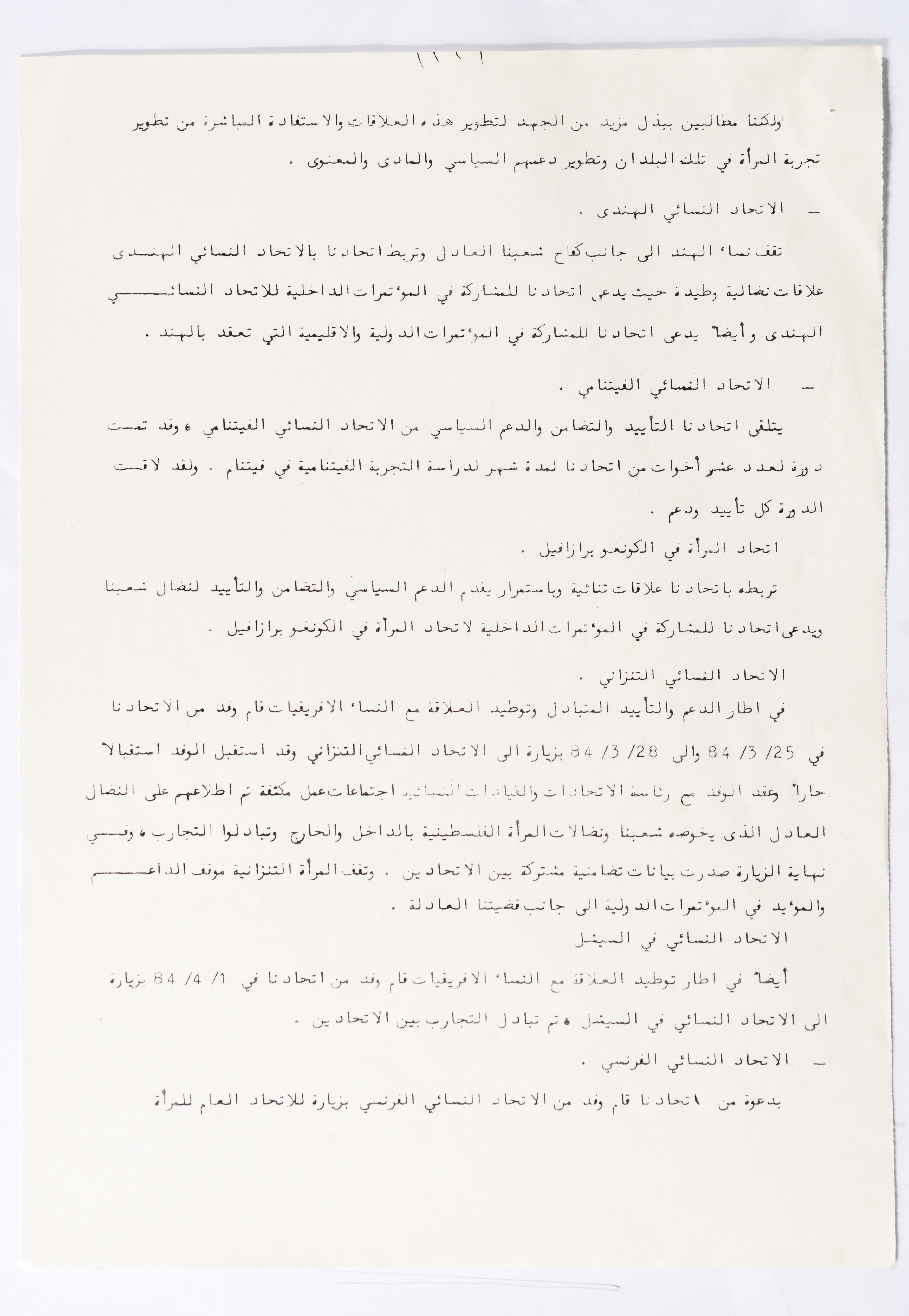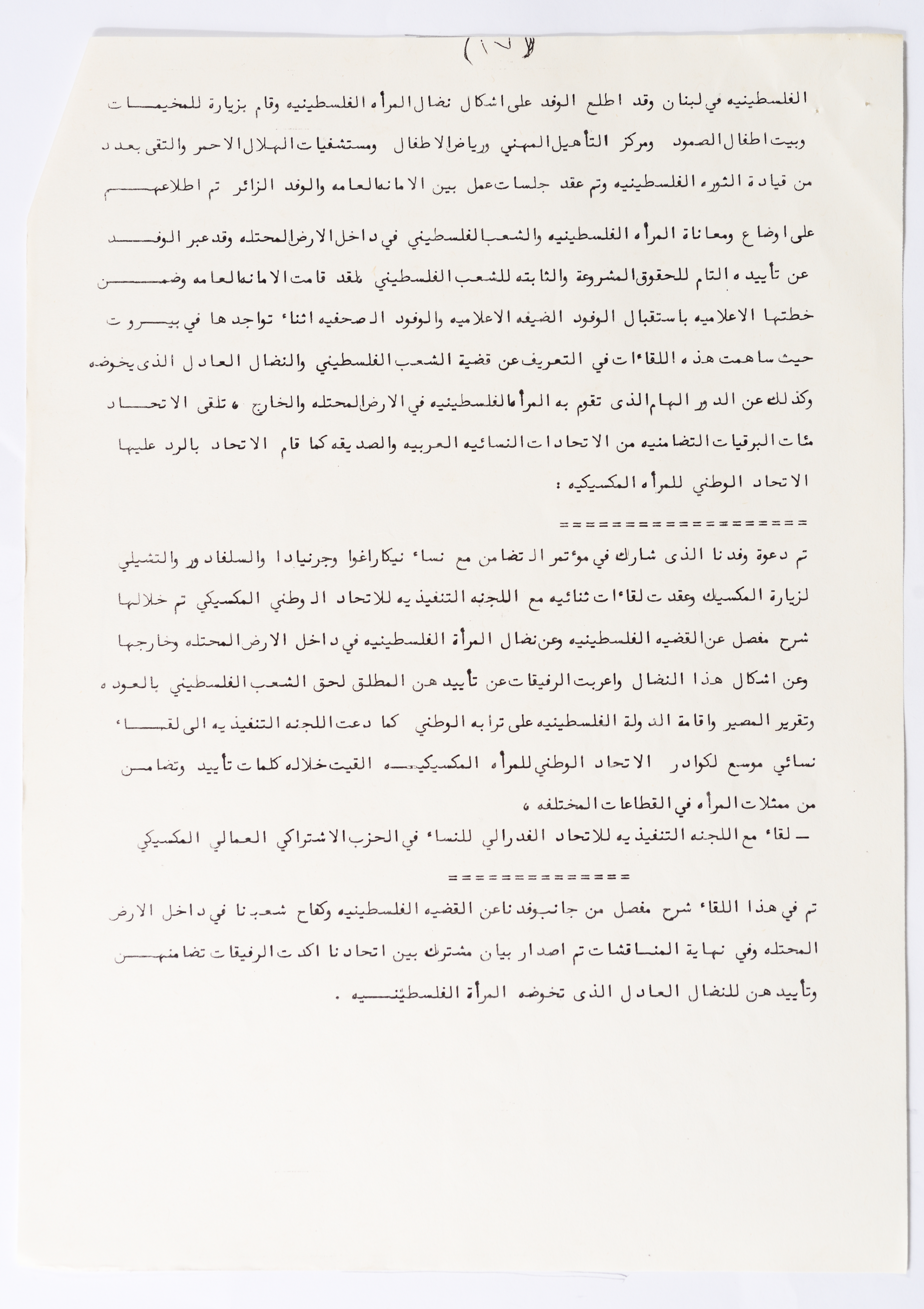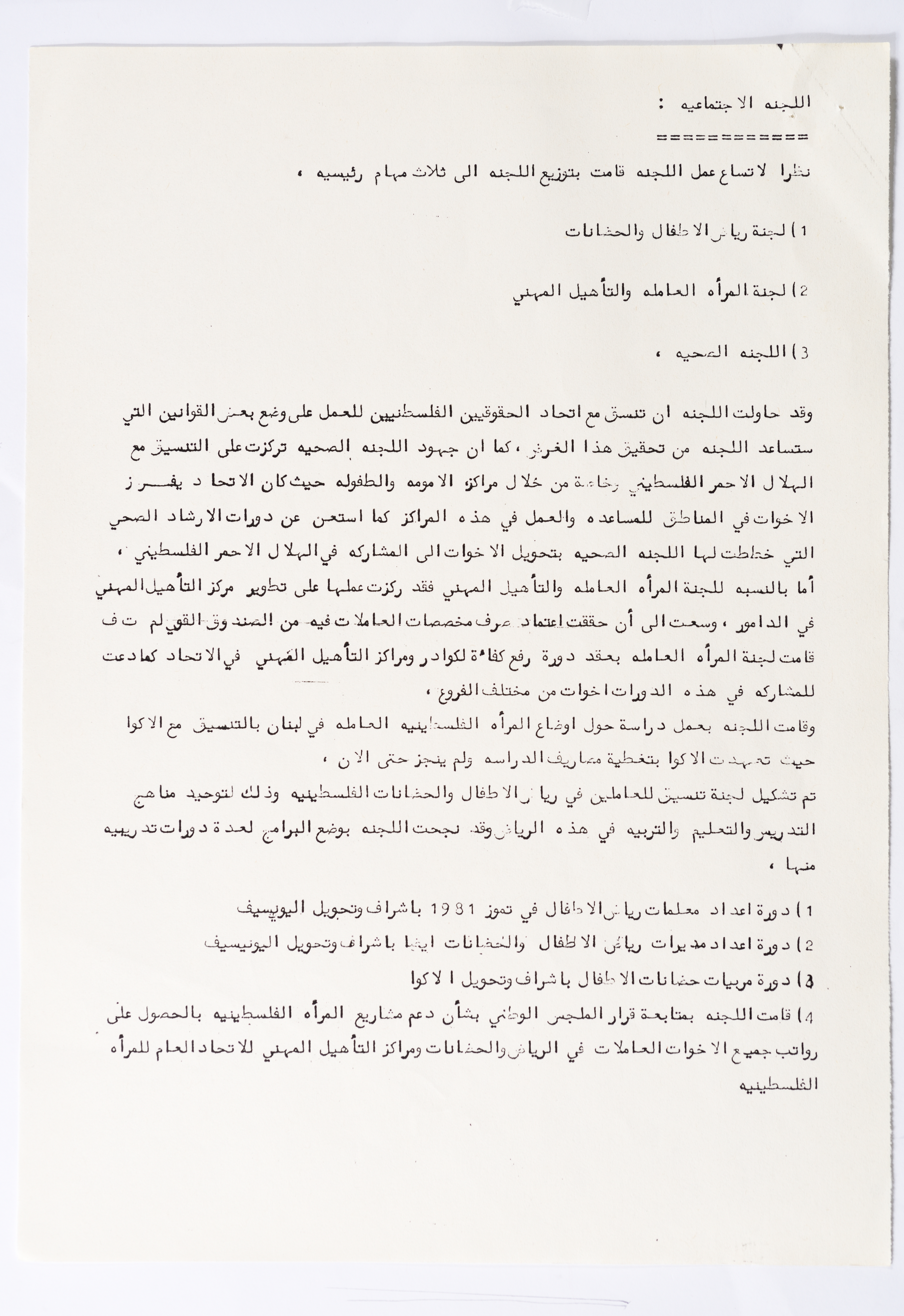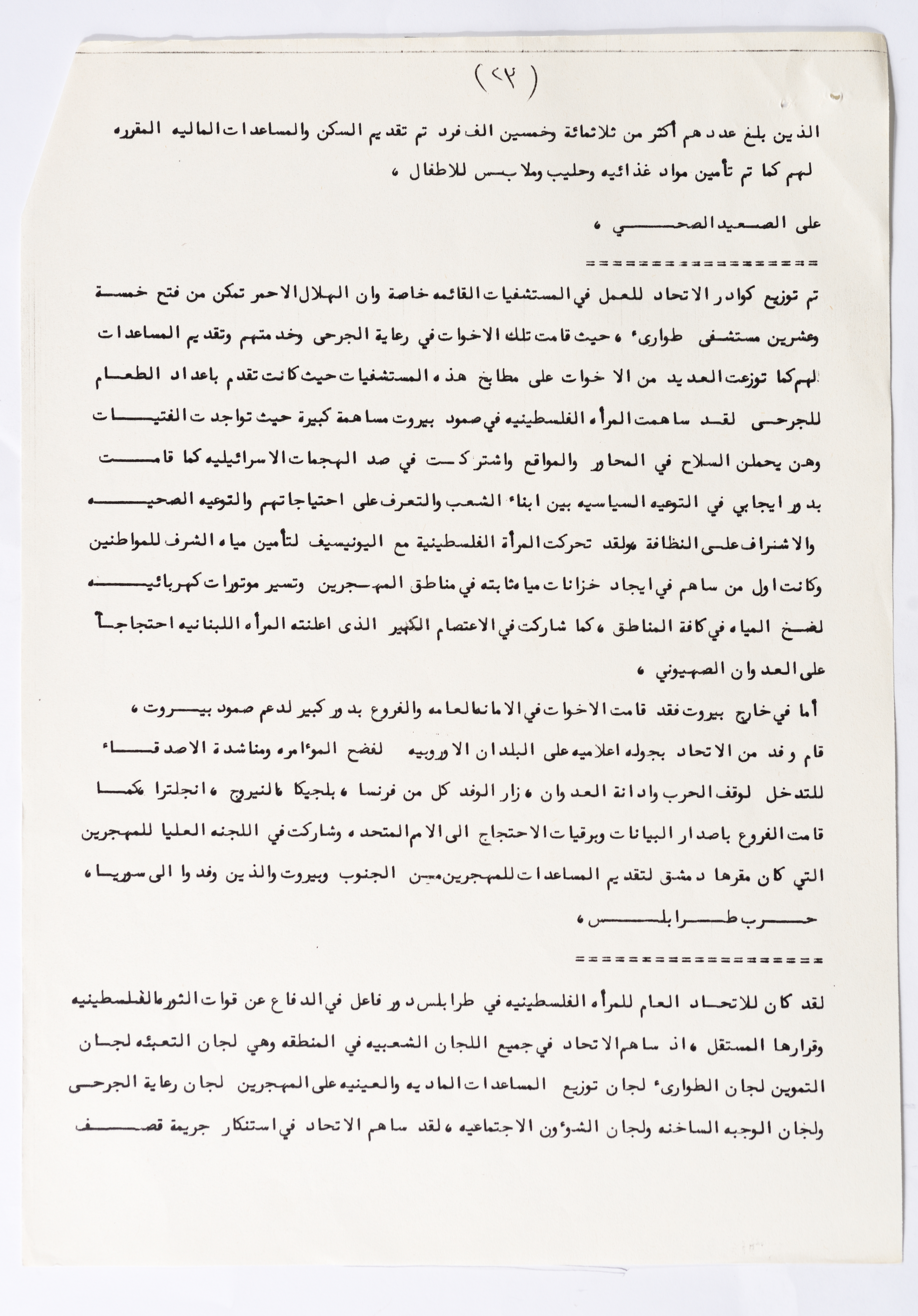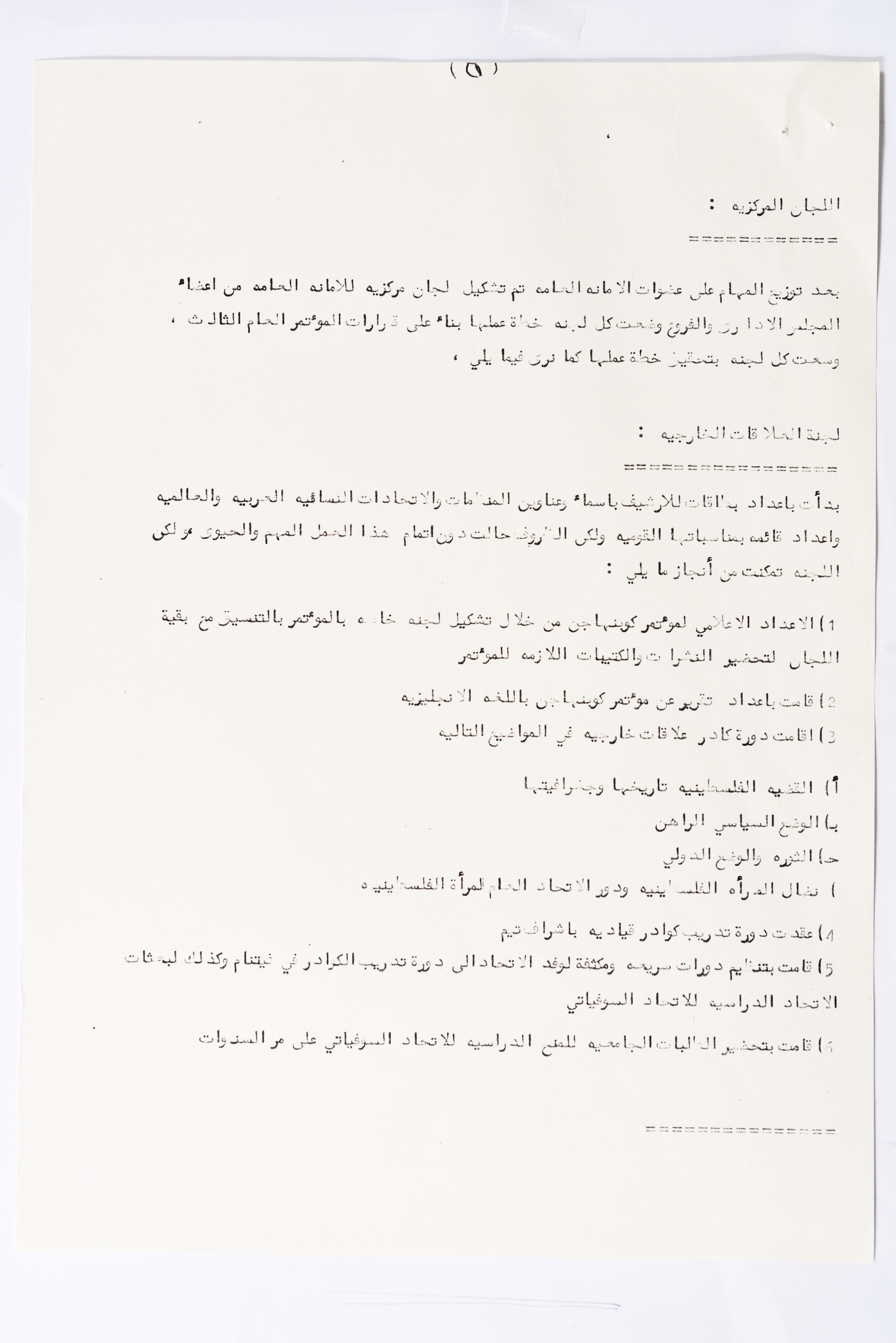 In this document, we find the literary report submitted by the General Secretariat of the General Union of Palestinian Women to the fourth conference of the Union held in Tunis, which dealt with a detailed review of the activities and activities of the General Federation of Palestinian Women. He explained why the General Conference was not held in time and in a delay due to political and military conditions and attempts to strike. The report also praised the Palestinian revolution and the Lebanese people and praised its steadfastness. The report began by talking about the administrative council, its work and its follow-up to the political events and data releases to follow up and search for solutions to problems, overcoming obstacles and crises and preparing for the general conference. It also presented the work of the Secretariat and its adoption of internal regulations and commitment to periodic meetings and the creation of new branches of the Union and supervision. The report began by talking about the administrative council, its work and its follow-up to the political events and data releases to follow up and search for solutions to problems, overcoming obstacles and crises and preparing for the general conference. It also presented the work of the Secretariat and its adoption of internal regulations and commitment to periodic meetings and the creation of new branches of the Union and supervision. As well as the activities of the branches of the Union individually, such as raising women's awareness and rehabilitation projects for women, literacy courses, establishing nurseries and working on reviving the Palestinian heritage, reviving national events, defending the revolution, celebrating March 8, holding seminars and visiting families of shaheeds. The report explained the work of the central committees and the nature of their work: Committee on Foreign Relations: and prepared for conferences and the work of the report and the establishment of courses. And the Committee on Internal Relations: Talk about the study of the situation of the branches and solve problems and the establishment of new branches of the Union. In addition to the Committee on Information: It has re-formed the editorial board of the Palestinian magazine Al-Thaerah and issued posters and cards at national events and preparing for conferences. Cultural Committee: Worked to prepare seminars and collect books on Palestinian women and the work of education sessions. Social Committee: Its work focuses on three aspects: 1- Health 2- Kindergartens 3- Women and vocational rehabilitation. The report also mentioned the Federation's relationship with the PLO and noted that the Union was able to increase the share of women in the National Assembly from 21 to 23. In addition to the presence of three representatives in the Central Council and their representative in the Supreme Council for Education, Culture and Science. And 3 delegates in the Supreme Council for Literacy, and contribute to the development of plans for the Central Council of Kindergartens. And to participate in the membership of the Committee on the affairs of the occupied homeland and follow-up issues and the Committee for the Defense of Prisoners and Detainees and committees of friendship with peoples and international organizations. The report also mentioned the conferences and visits of the General Federation.