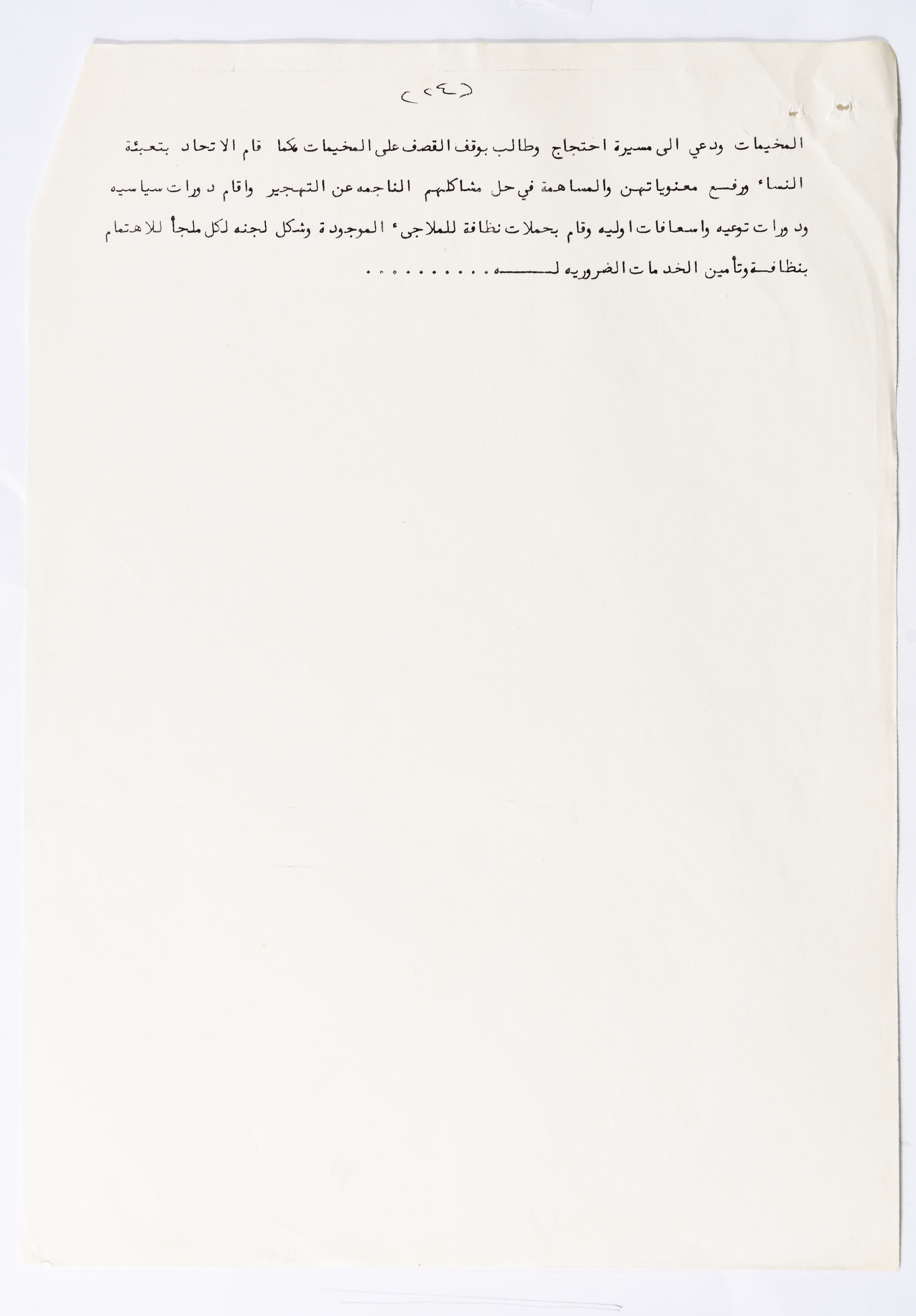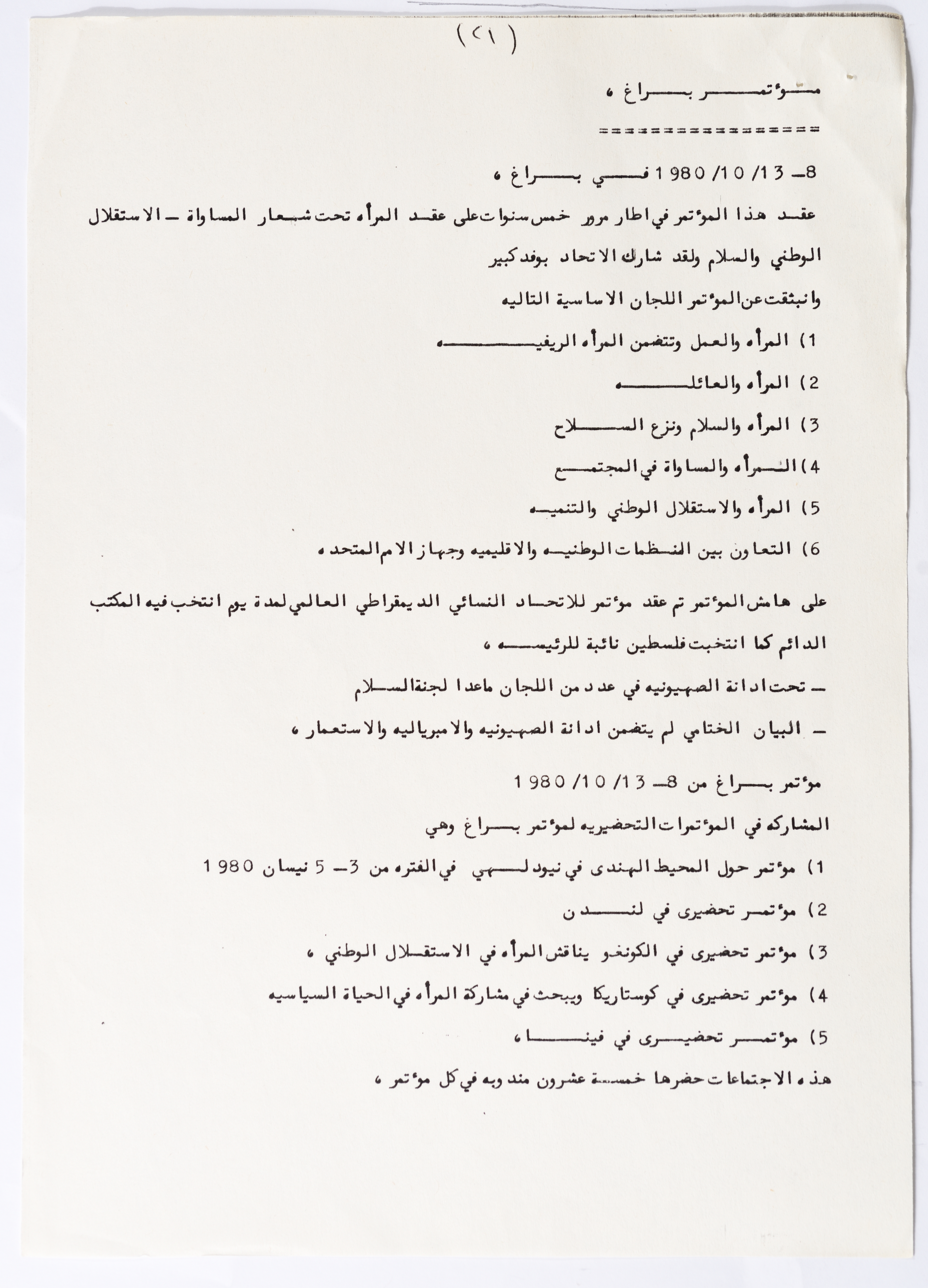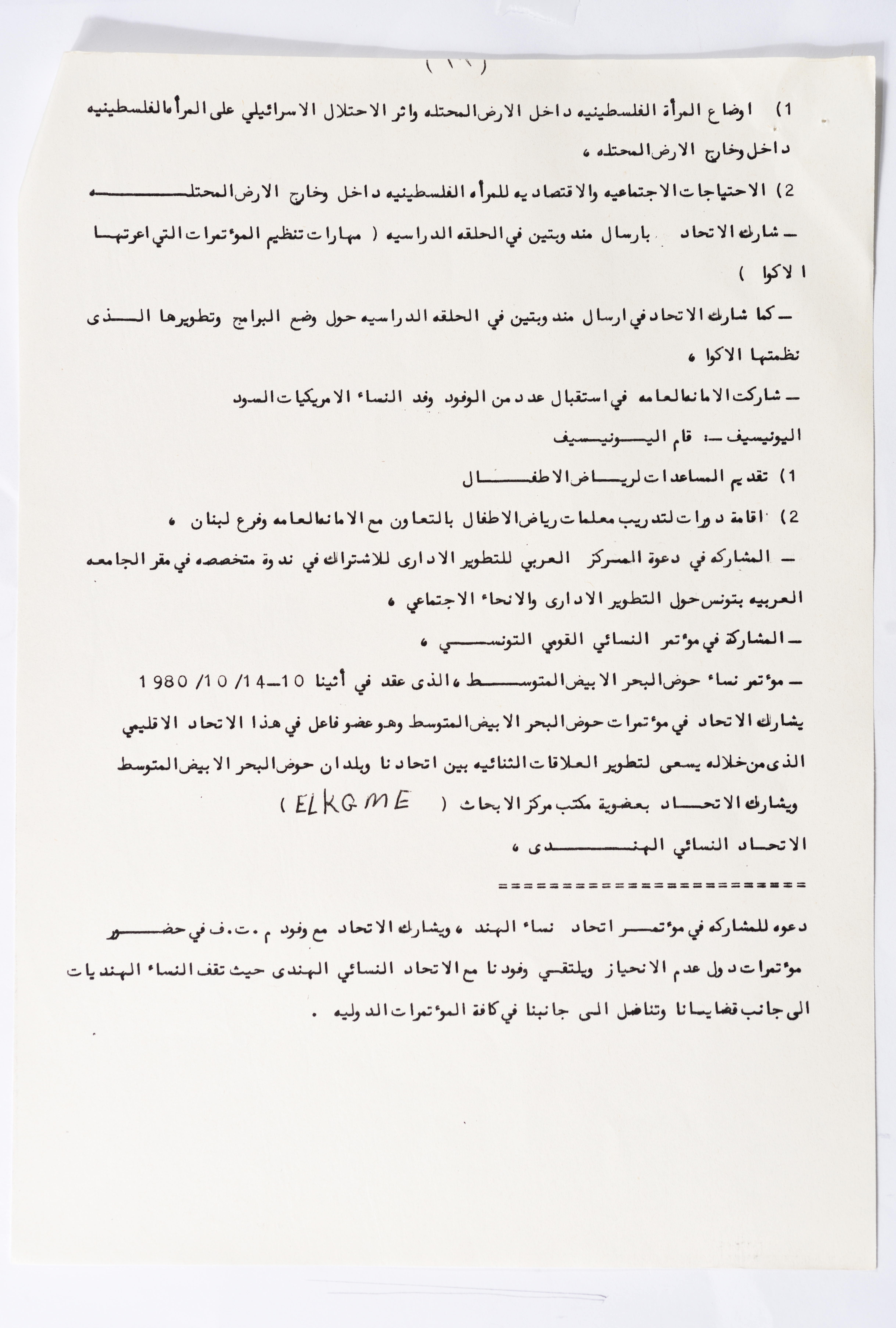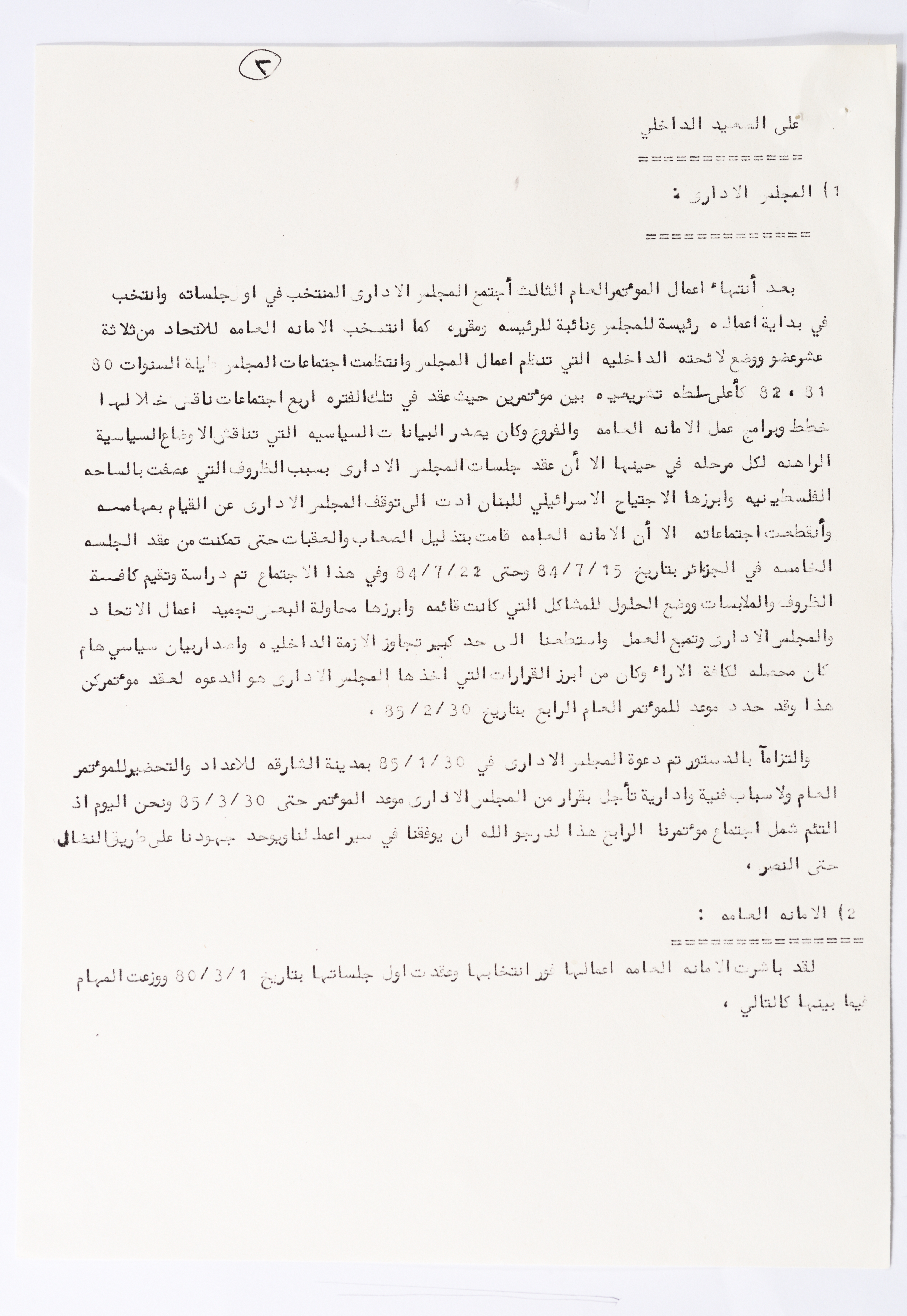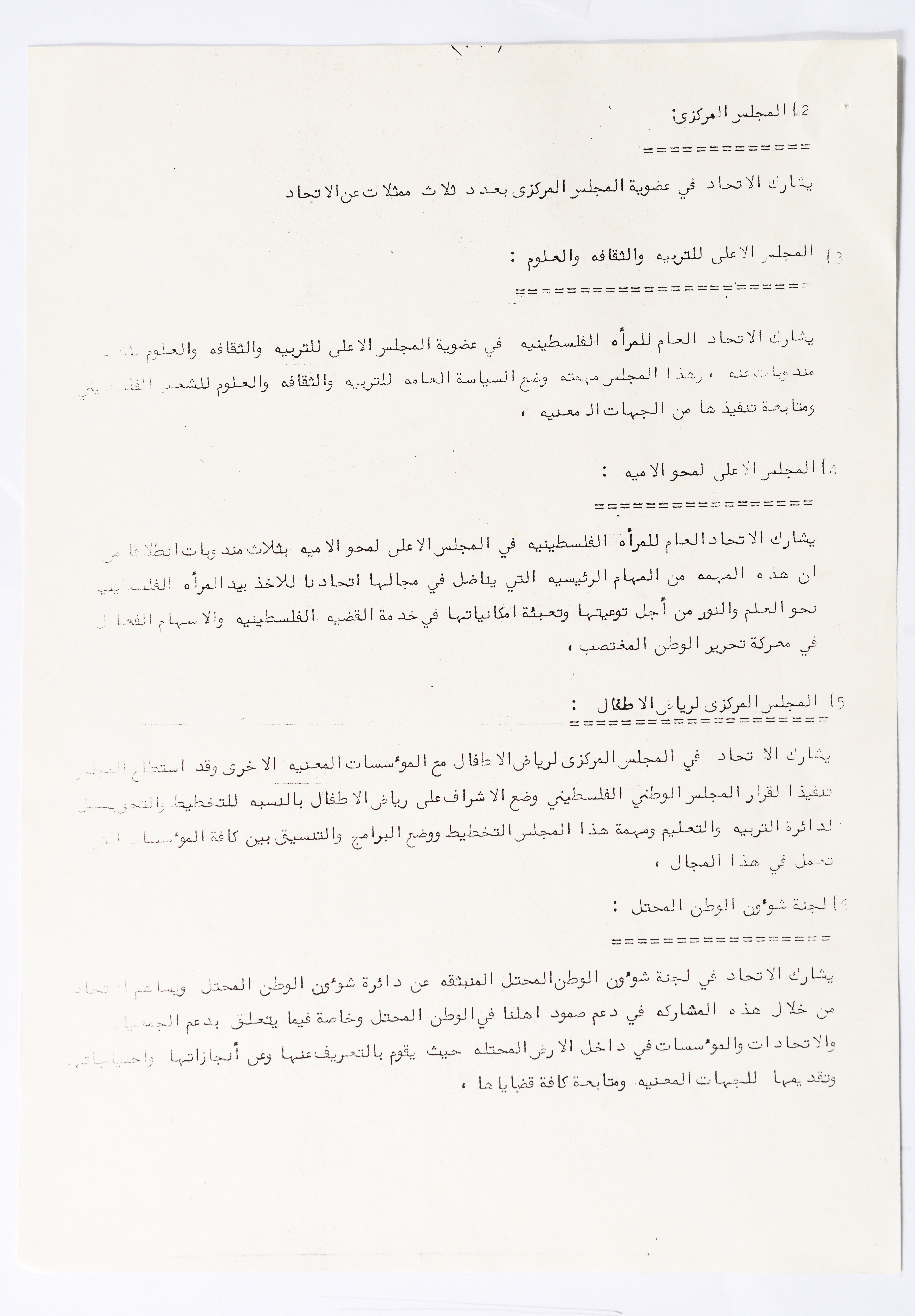 In this document, we find the literary report submitted by the General Secretariat of the General Union of Palestinian Women to the fourth conference of the Union held in Tunis, which dealt with a detailed review of the activities and activities of the General Federation of Palestinian Women. He explained why the General Conference was not held in time and in a delay due to political and military conditions and attempts to strike. The report also praised the Palestinian revolution and the Lebanese people and praised its steadfastness. The report began by talking about the administrative council, its work and its follow-up to the political events and data releases to follow up and search for solutions to problems, overcoming obstacles and crises and preparing for the general conference. It also presented the work of the Secretariat and its adoption of internal regulations and commitment to periodic meetings and the creation of new branches of the Union and supervision. The report began by talking about the administrative council, its work and its follow-up to the political events and data releases to follow up and search for solutions to problems, overcoming obstacles and crises and preparing for the general conference. It also presented the work of the Secretariat and its adoption of internal regulations and commitment to periodic meetings and the creation of new branches of the Union and supervision. As well as the activities of the branches of the Union individually, such as raising women's awareness and rehabilitation projects for women, literacy courses, establishing nurseries and working on reviving the Palestinian heritage, reviving national events, defending the revolution, celebrating March 8, holding seminars and visiting families of shaheeds. The report explained the work of the central committees and the nature of their work: Committee on Foreign Relations: and prepared for conferences and the work of the report and the establishment of courses. And the Committee on Internal Relations: Talk about the study of the situation of the branches and solve problems and the establishment of new branches of the Union. In addition to the Committee on Information: It has re-formed the editorial board of the Palestinian magazine Al-Thaerah and issued posters and cards at national events and preparing for conferences. Cultural Committee: Worked to prepare seminars and collect books on Palestinian women and the work of education sessions. Social Committee: Its work focuses on three aspects: 1- Health 2- Kindergartens 3- Women and vocational rehabilitation. The report also mentioned the Federation's relationship with the PLO and noted that the Union was able to increase the share of women in the National Assembly from 21 to 23. In addition to the presence of three representatives in the Central Council and their representative in the Supreme Council for Education, Culture and Science. And 3 delegates in the Supreme Council for Literacy, and contribute to the development of plans for the Central Council of Kindergartens. And to participate in the membership of the Committee on the affairs of the occupied homeland and follow-up issues and the Committee for the Defense of Prisoners and Detainees and committees of friendship with peoples and international organizations. The report also mentioned the conferences and visits of the General Federation.