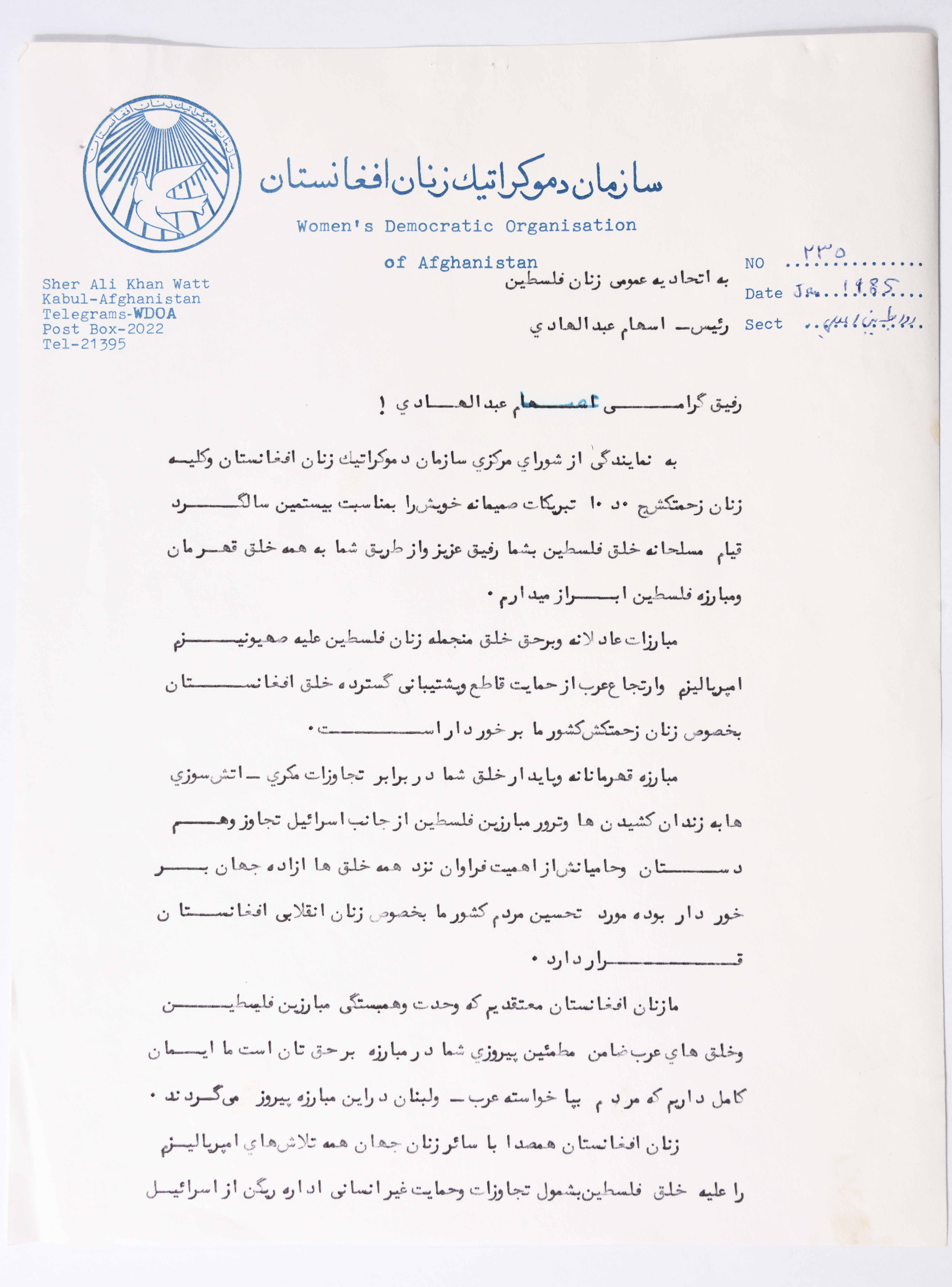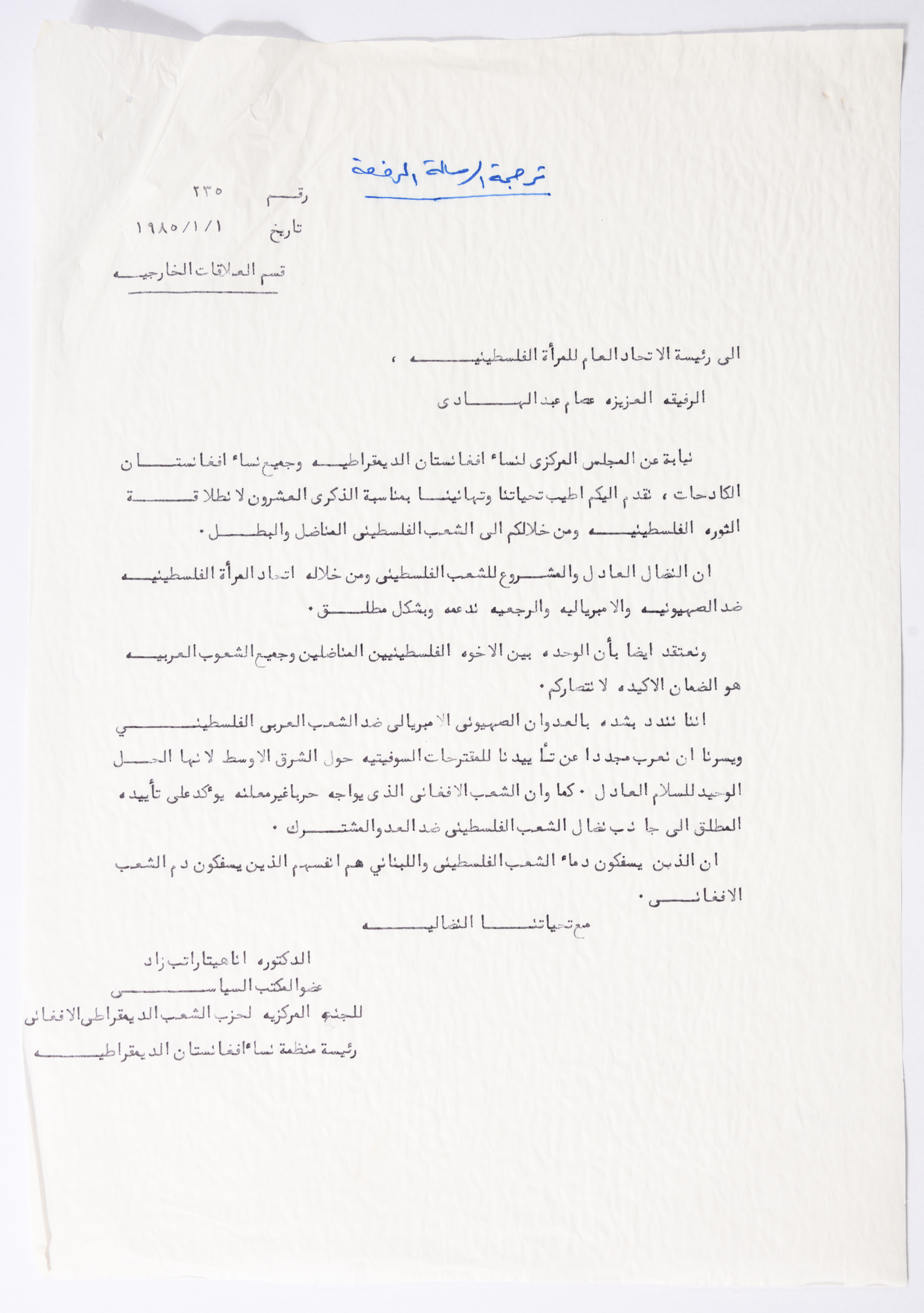 رسالة تضامن من أناهيتا رابت زاد عضو المكتب السياسي للجنة المركزية لحزب الشعب الديمقراطي الأفغاني، رئيسة منظمة نساء أفغانستان الديمقراطية، إلى الاتحاد العام للمرأة الفلسطينية بمناسبلة الذكرى العشرين لانطلاقة الثورة الفلسطينية، تؤكد فيها على دعم الحركة النسوية الأفغانية بشكل مطلق للنضال العادل والمشروع للشعب الفلسطيني ضد الصهيونية والامبريالية والرجعية.
