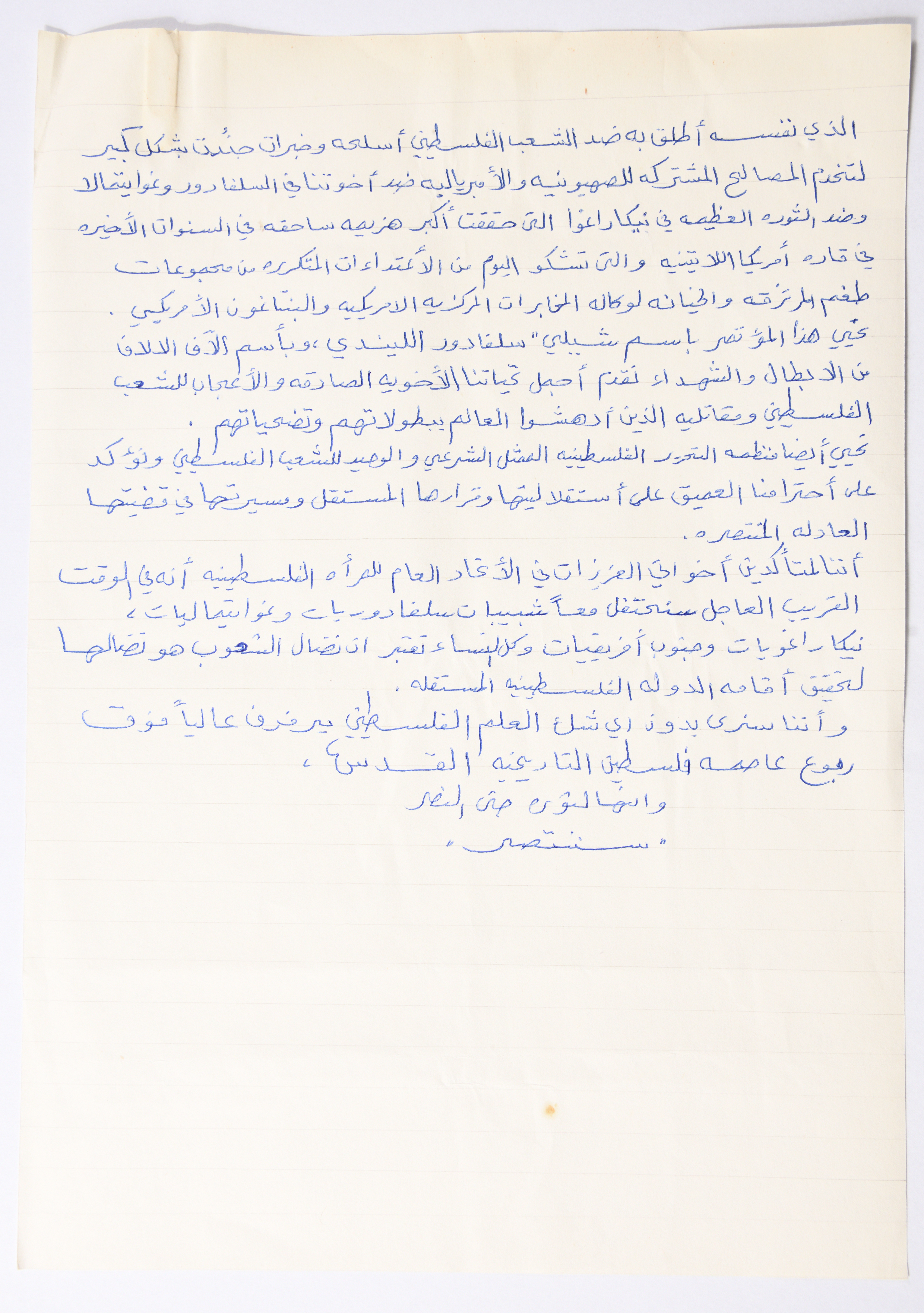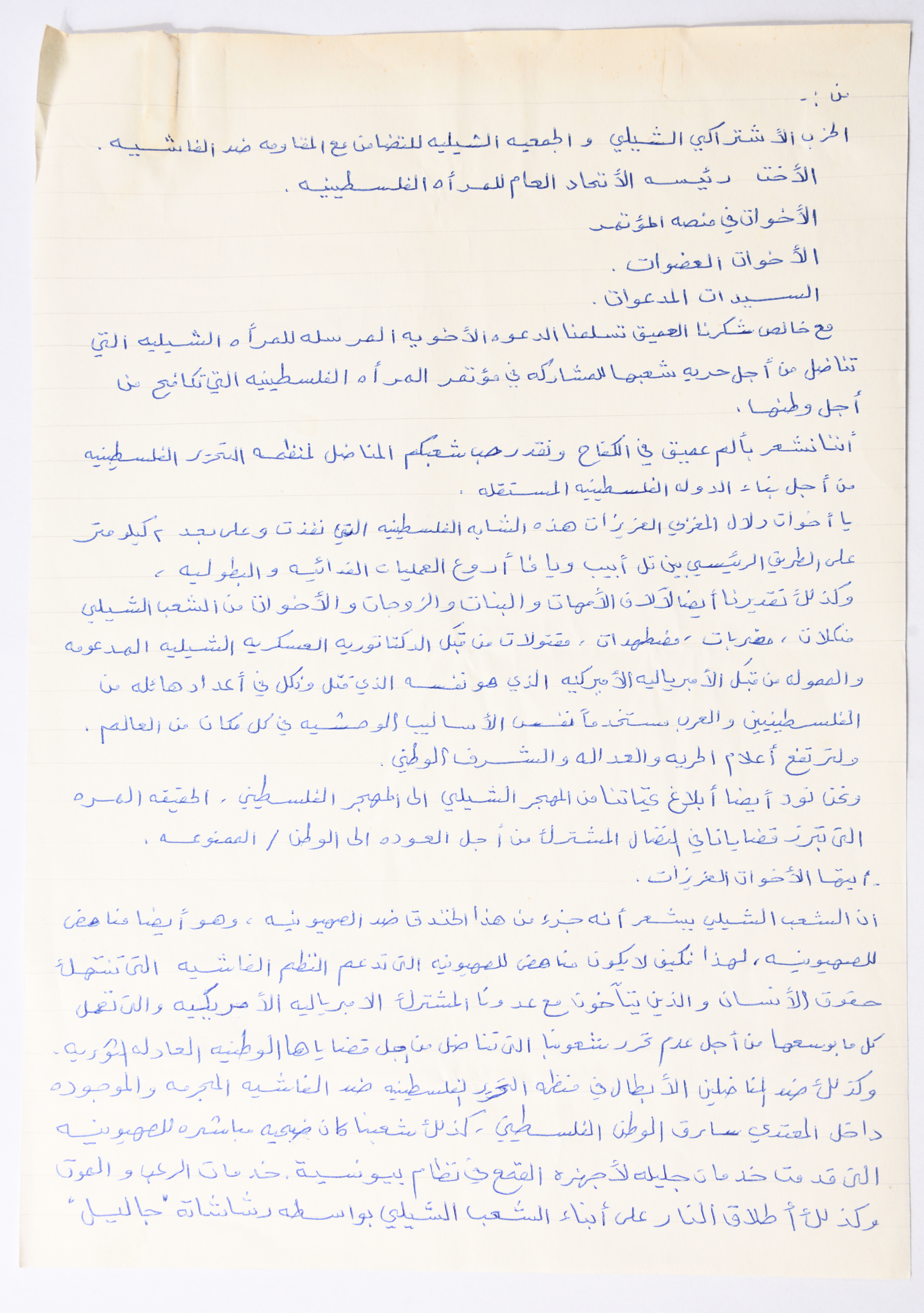 برقية تضامن من الحزب الاتشراكي التشيلي والجمعية التشيلية للتضامن مع المقاومة ضد الفاشية، إلى المؤتمر العام الرابع للاتحاد العام للمرأة الفلسطينية، يؤكدون فيها على أن الشعب التشيلي يشعر بأنه جزء من هذا الخندق ضد الصهيونية وأنه مناهض للصهيونية.