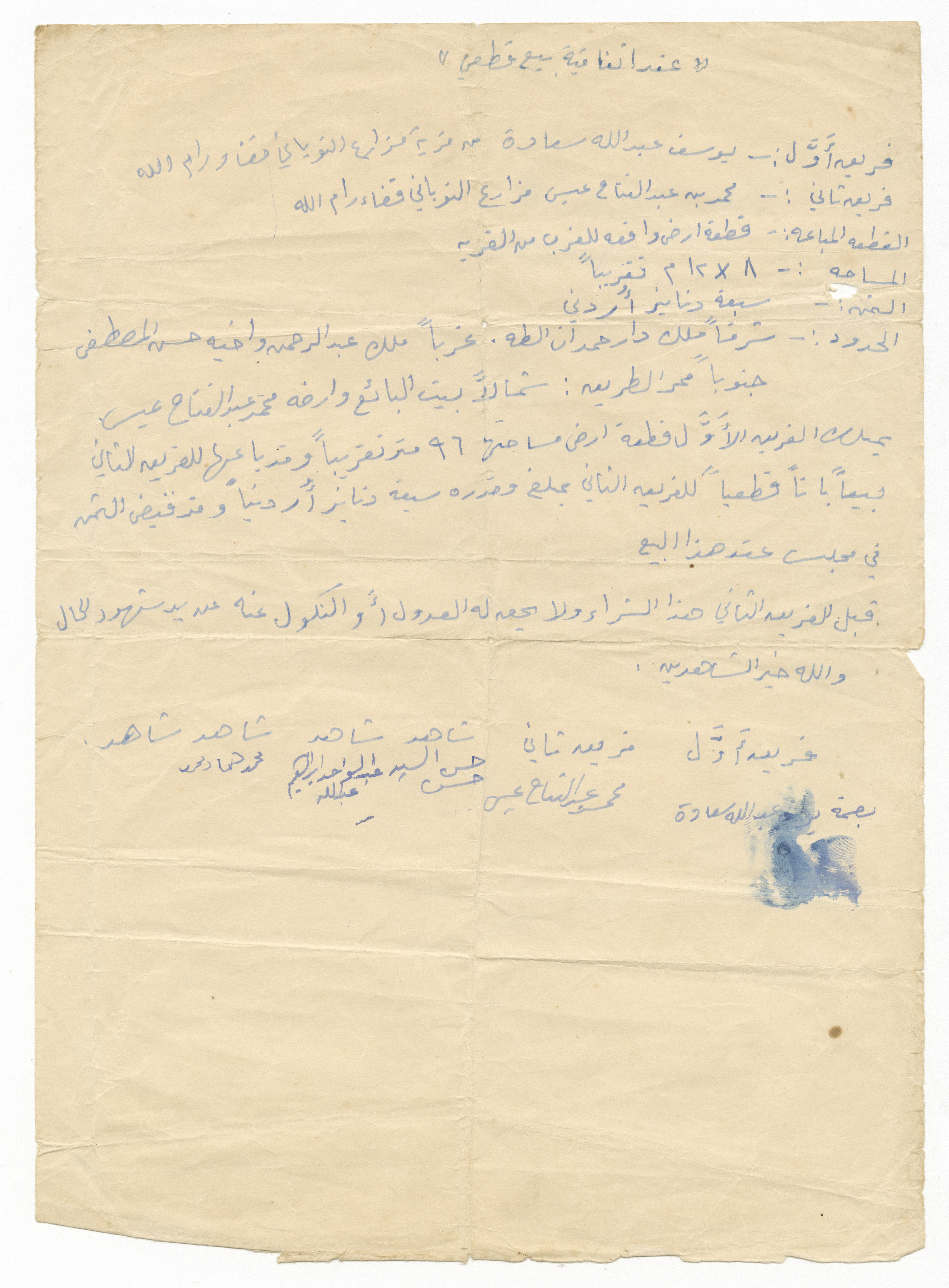 A one-page document showing a contract for the sale of land in Mazari al-Nubani between Yusef ʿabdallah Saʿadeh and Mohammad ʿabdel-Fattah ʿisa.