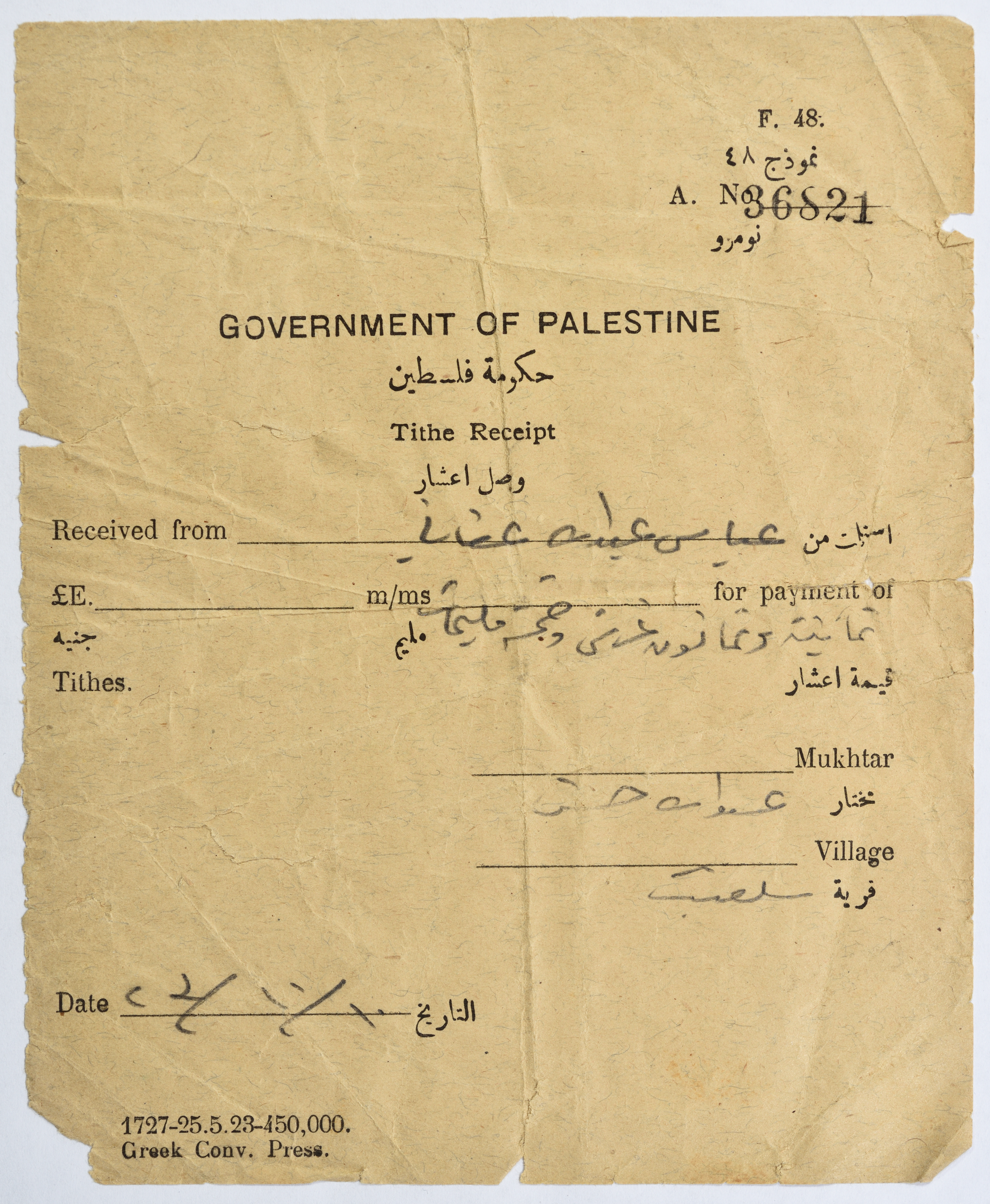 A cash receipt for the Pound tax from the Palestinian Government in 1923