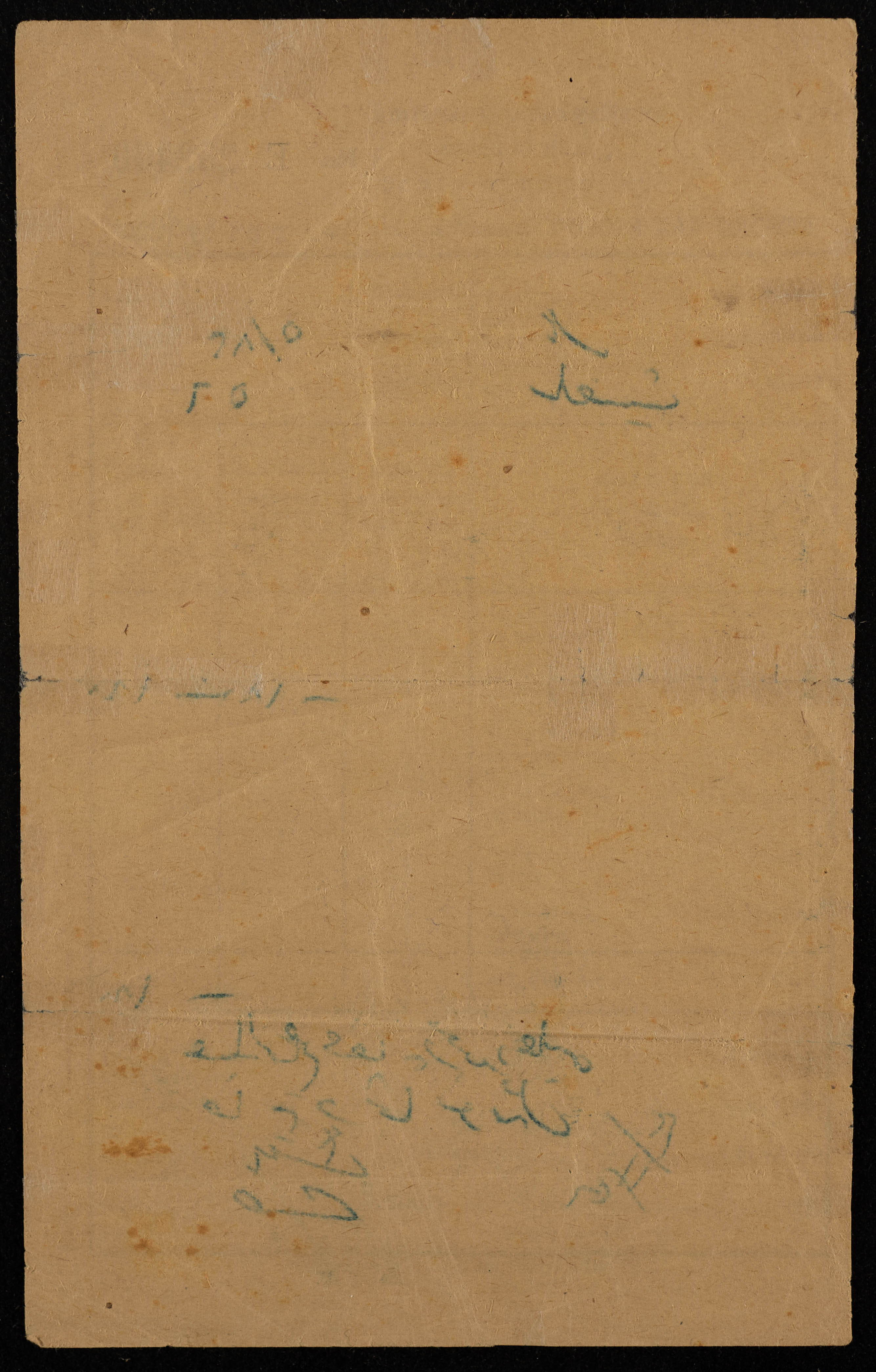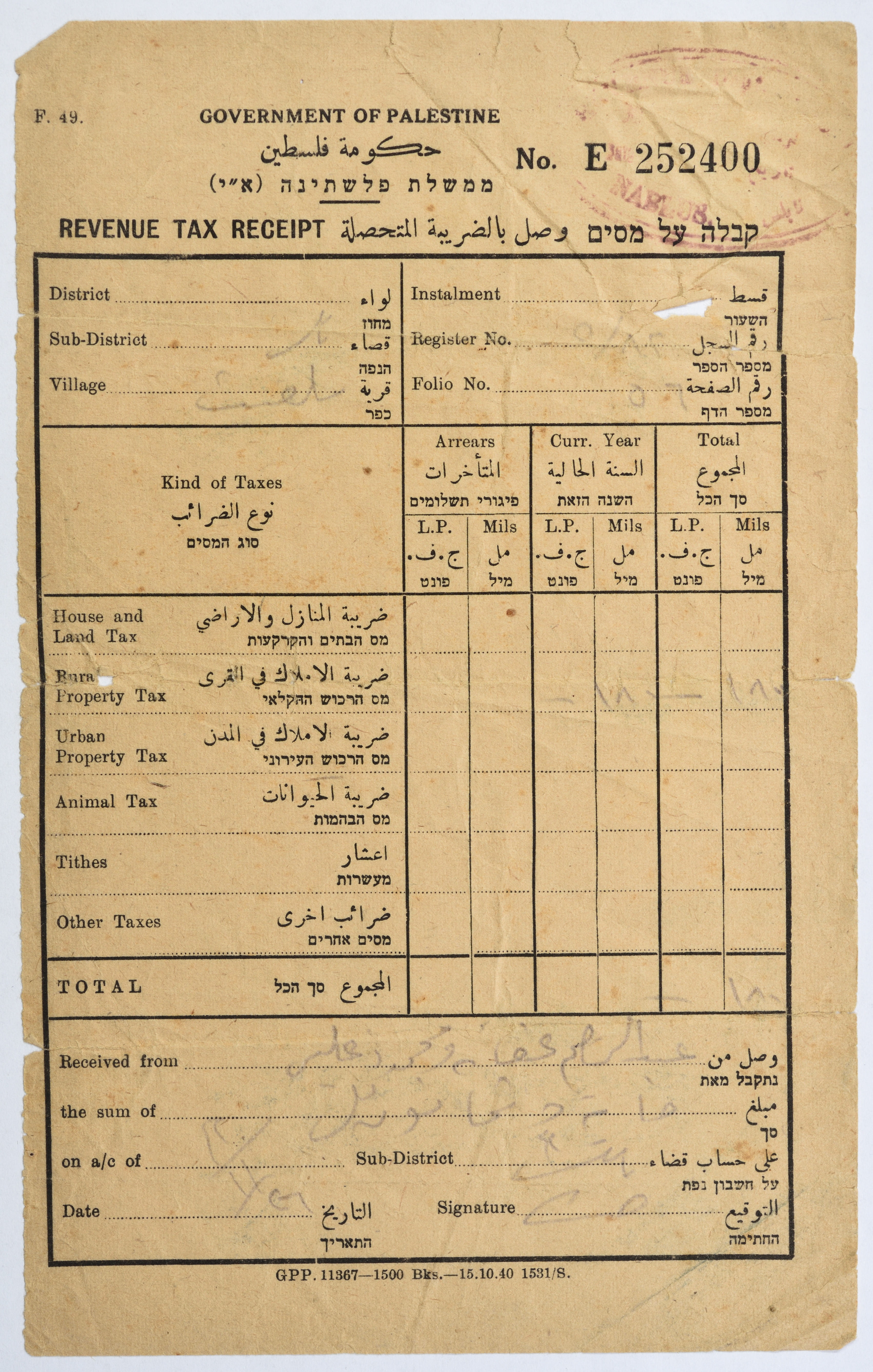 وثيقة مكونة من صفحة واحدة تتضمن وصل للضريبىة التي دفعها عبد الرحيم عفانة ومحمد دغليس بتاريخ 26/11/1942، حيث بلغت قيمة الضريبة 180 مليم. كتبت الوثيقة باللغة العربية والانجليزية .والعبرية