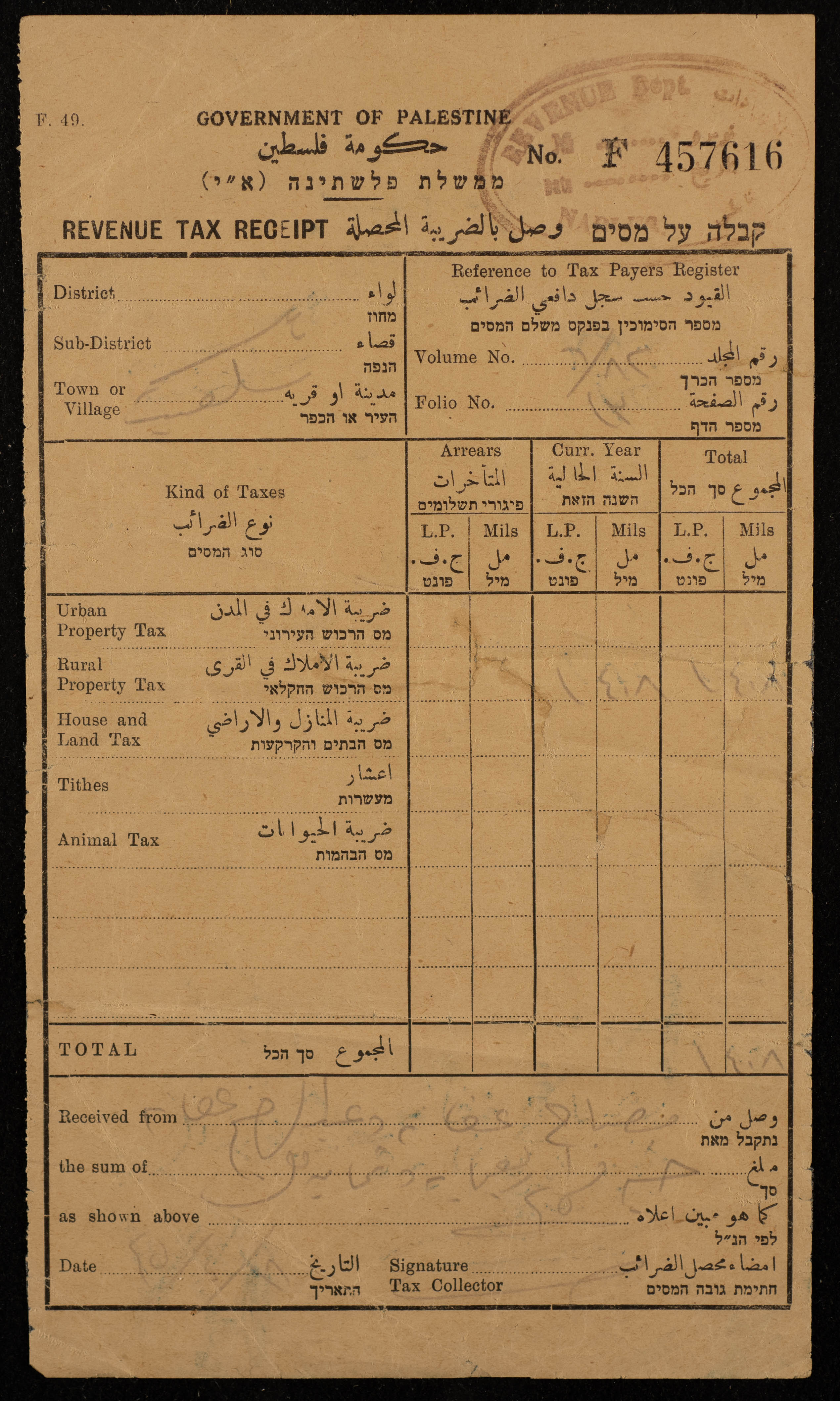 A one-page document containing a tax receipt; written in Arabic, English, and Hebrew, paid by Misbah Affaneh and Abdul-Raheem Affaneh in 16/4/1945 for the amount of 428 Cents