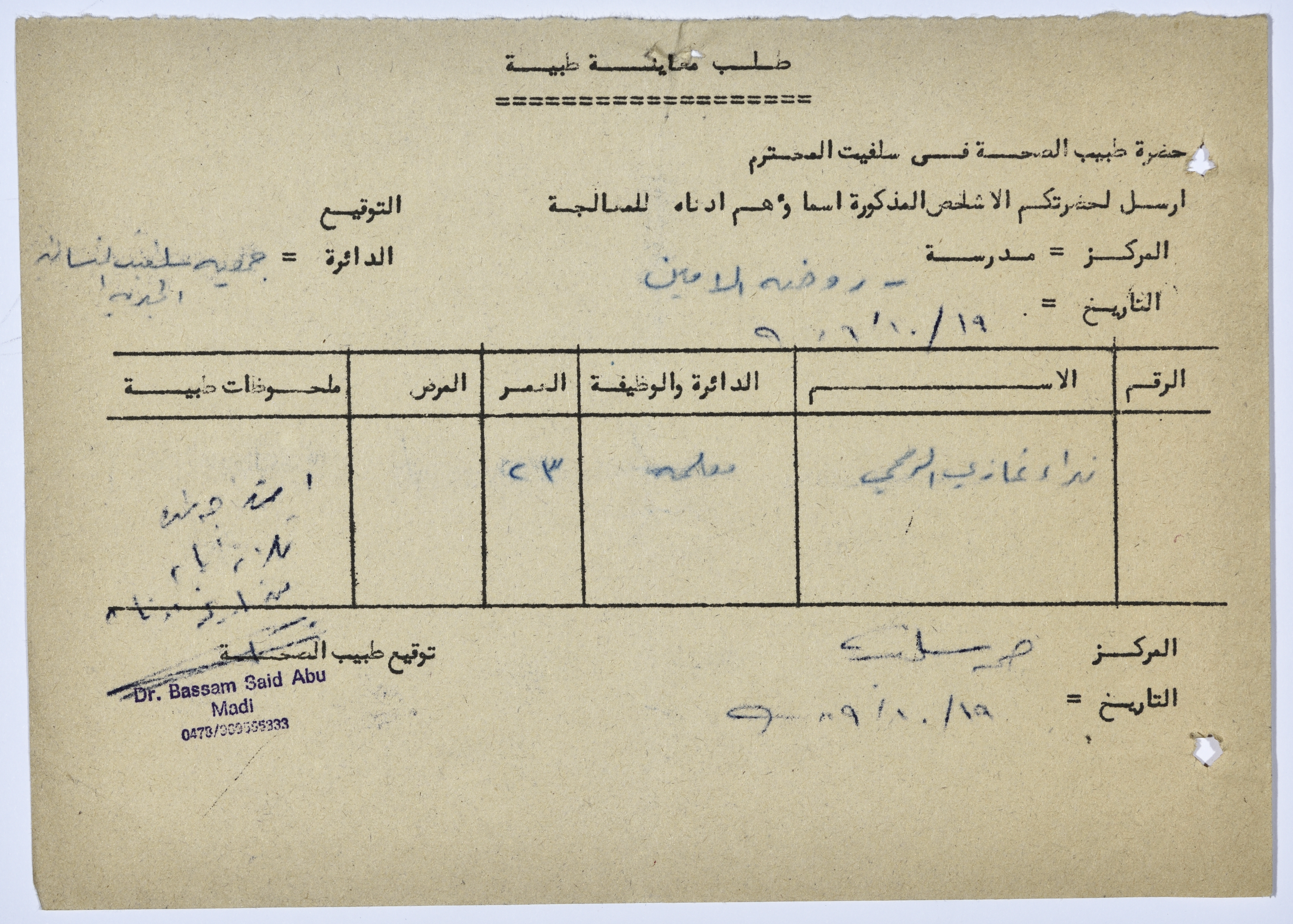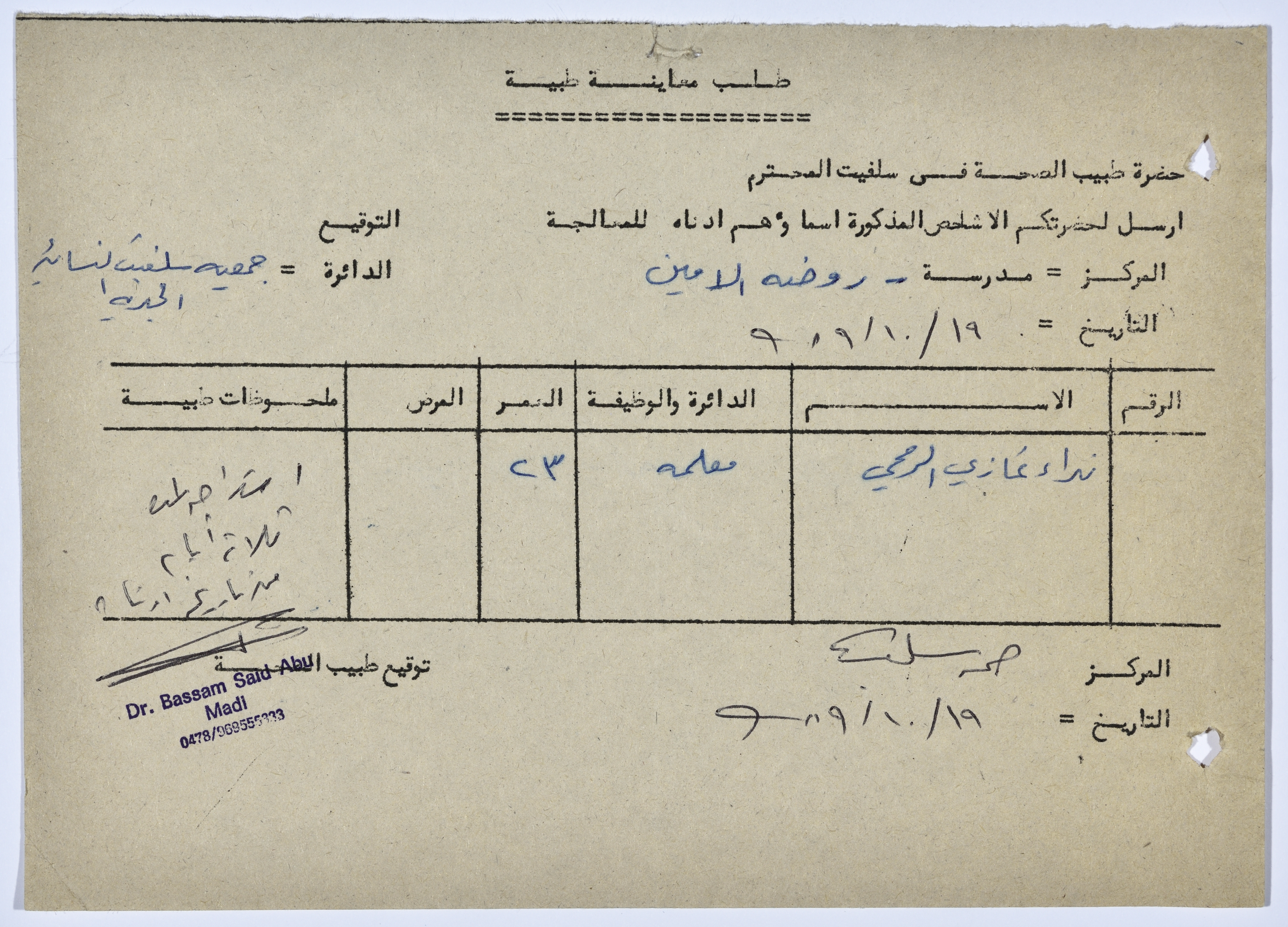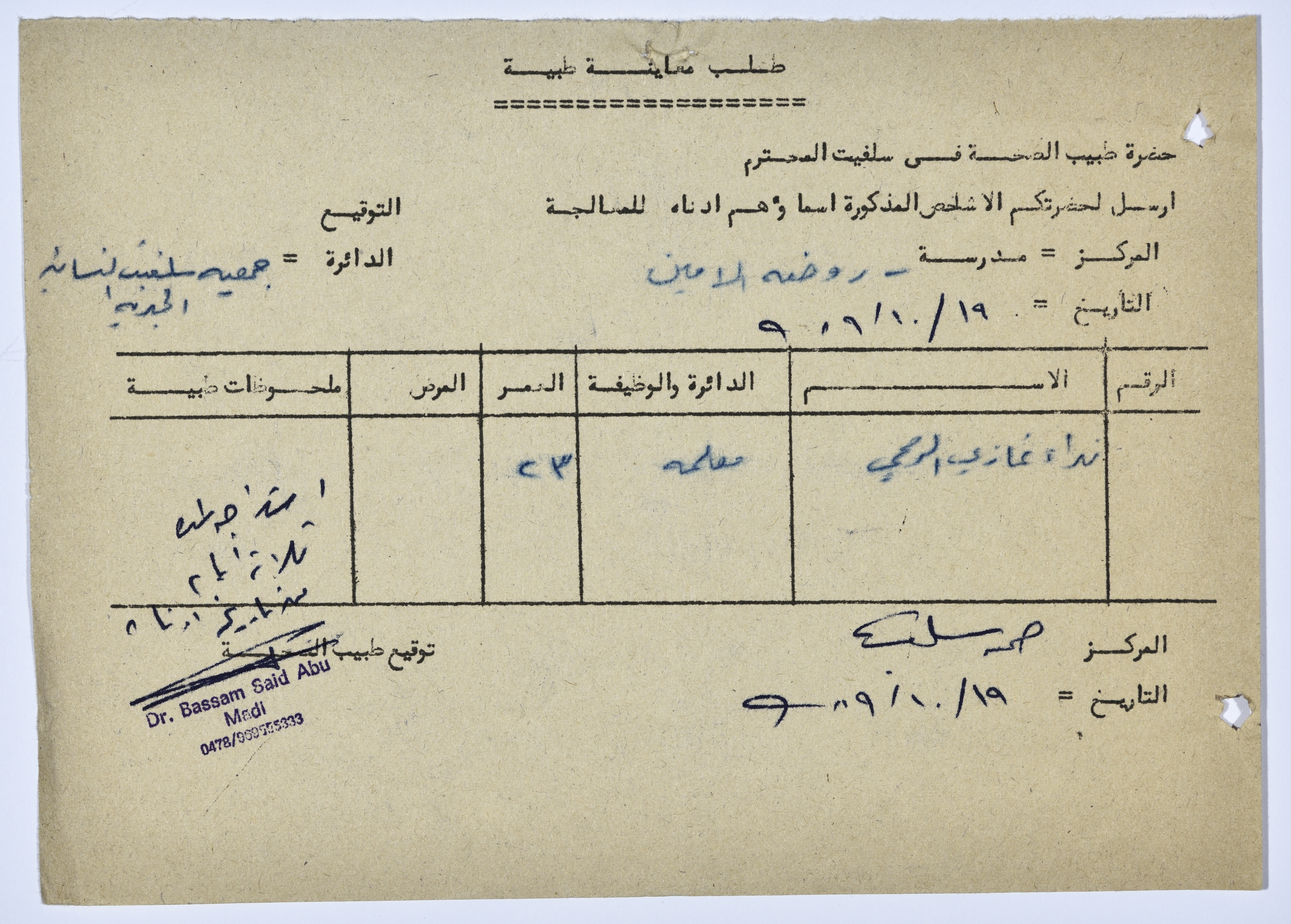 طلب معاينة طبية لإحدى الموظفات في جمعية سلفيت الخيرية