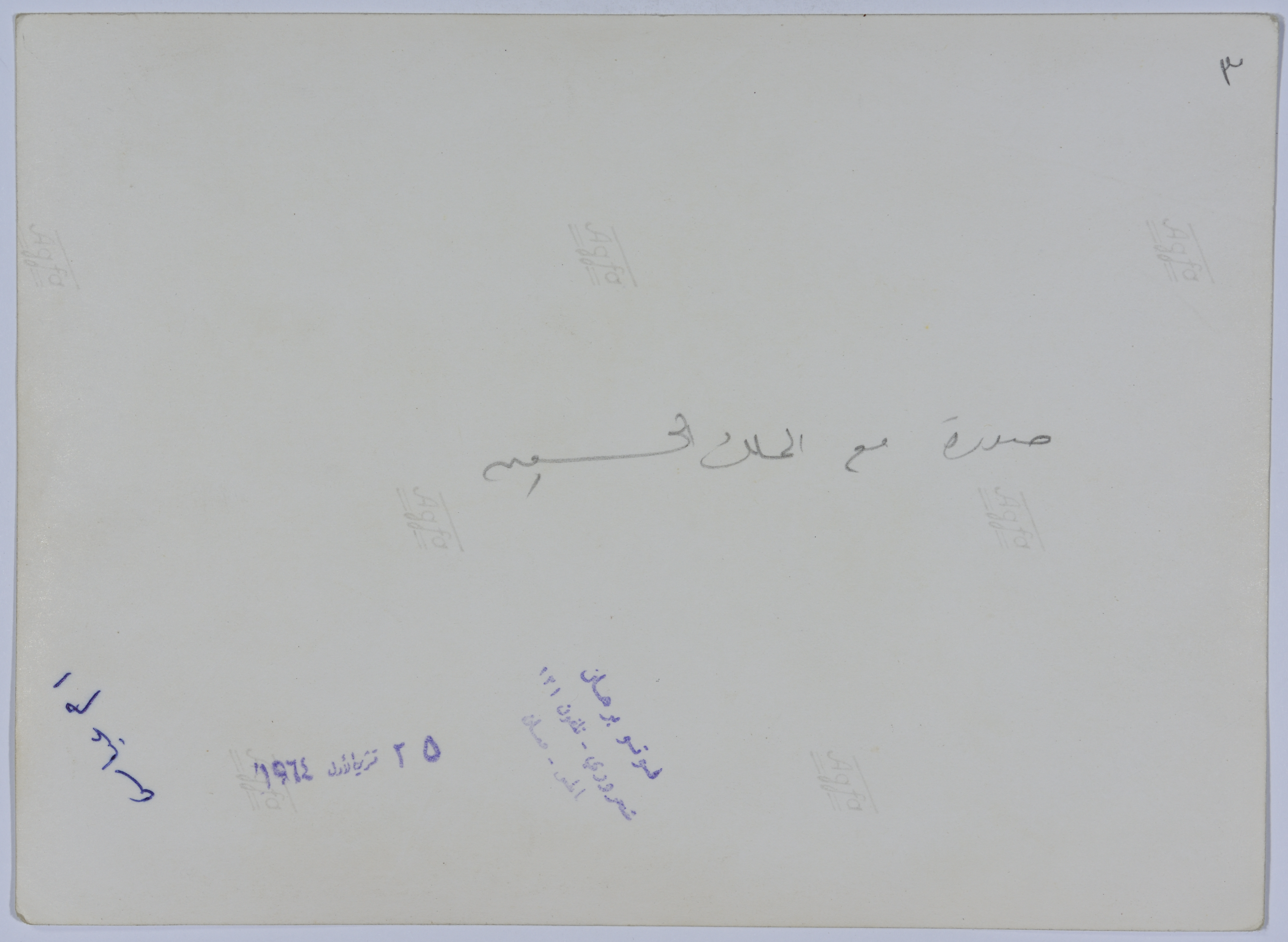 A black-and-white photo of Andaleib al-Amad; Head of the Arab Women Union Society in Nablus, with King Hussein of Jordan on his visit to the Arab Women Union Society in Nablus