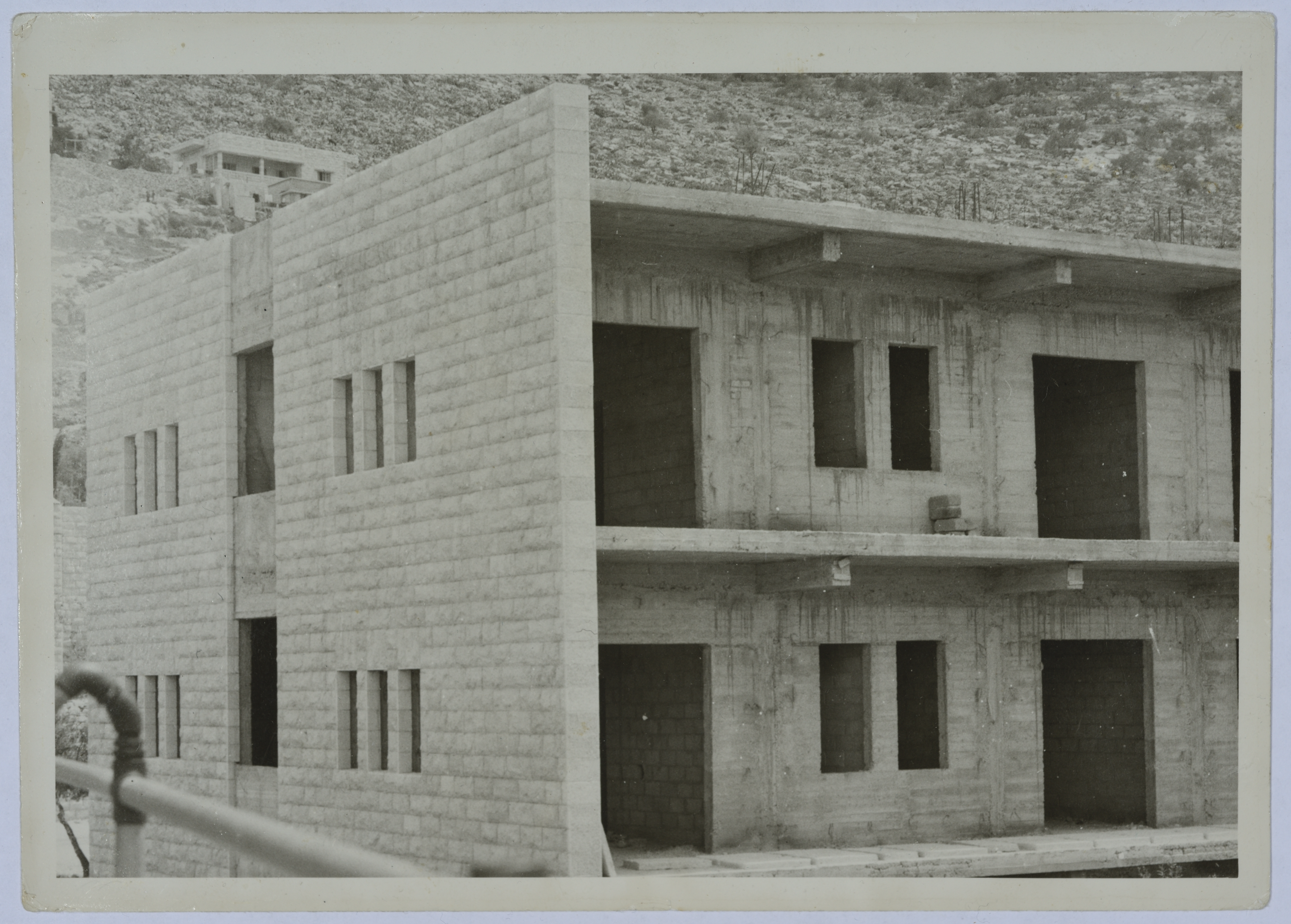 A black-and-white photo of the Hospital of the Arab Women Union Society in Nablus. The photo was taken during the construction of the Hospital