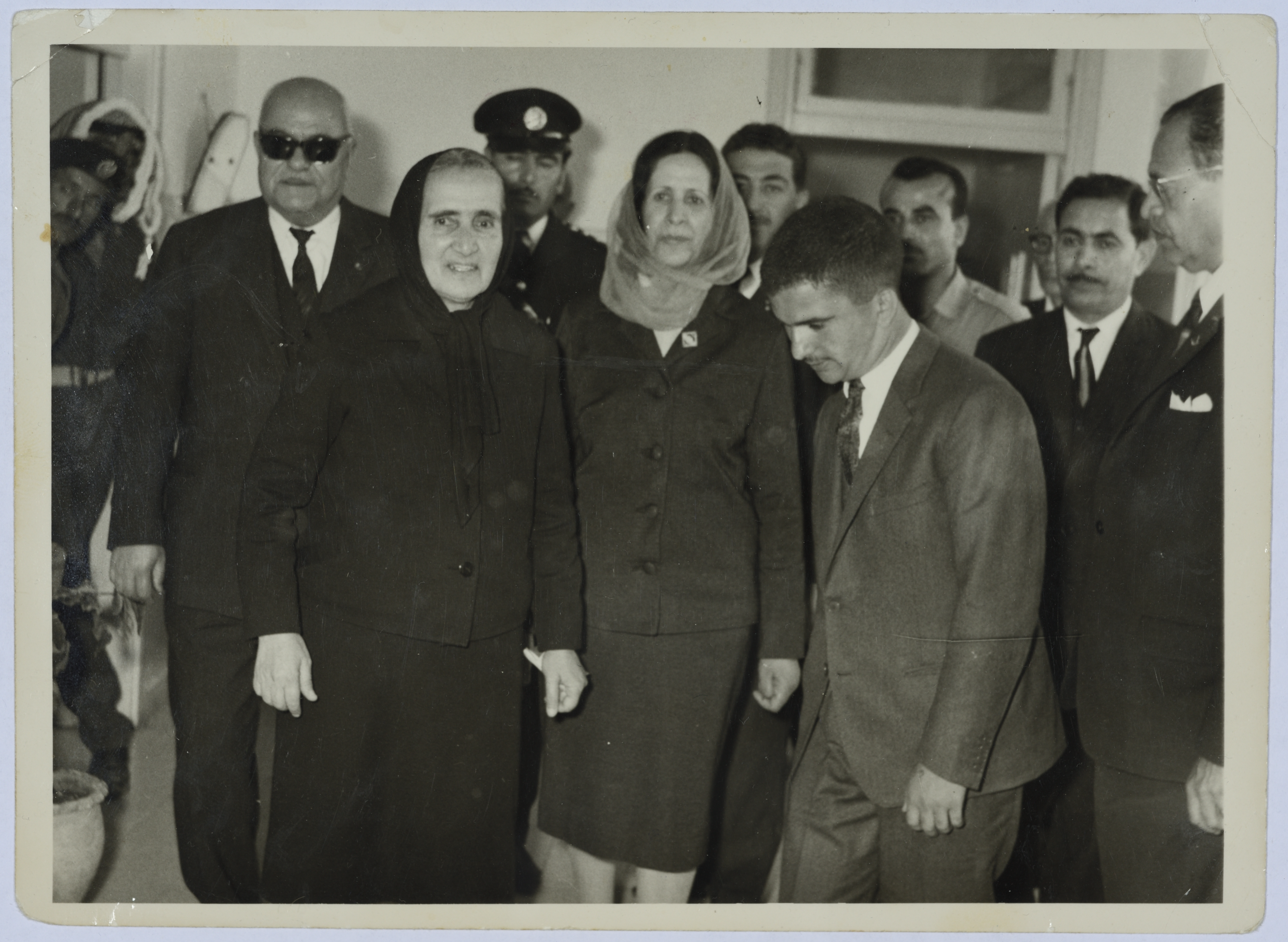 A black-and-white photo of Andaleib al-Amad; Head of the Arab Women Union Society in Nablus, with King Hussein of Jordan on his visit to the Arab Women Union Society in Nablus