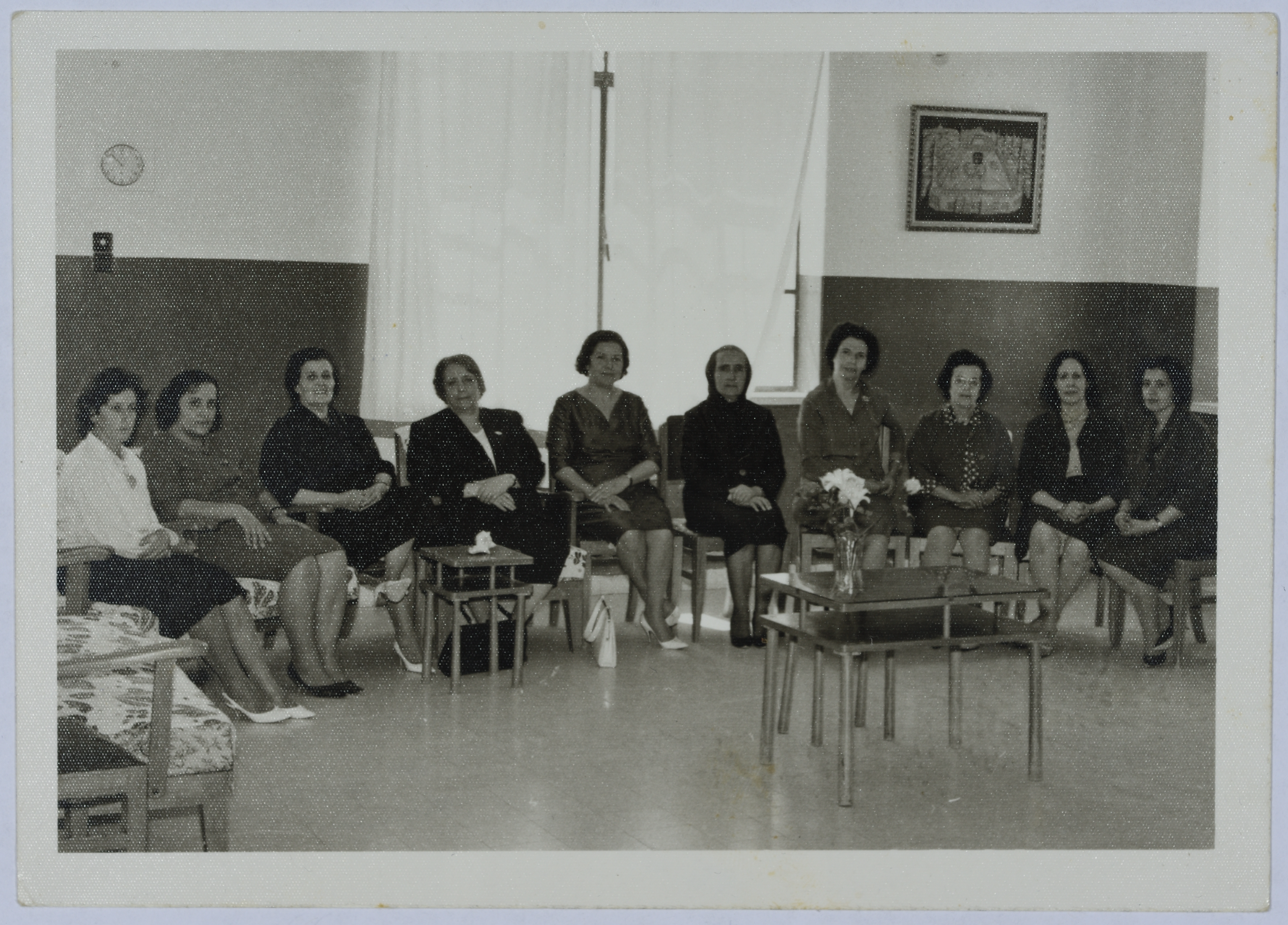 A black-and-white photo of Andaleib al-Amad; Head of the Arab Women Union Society, with the Governing Body of the Society in Nablus in 1964