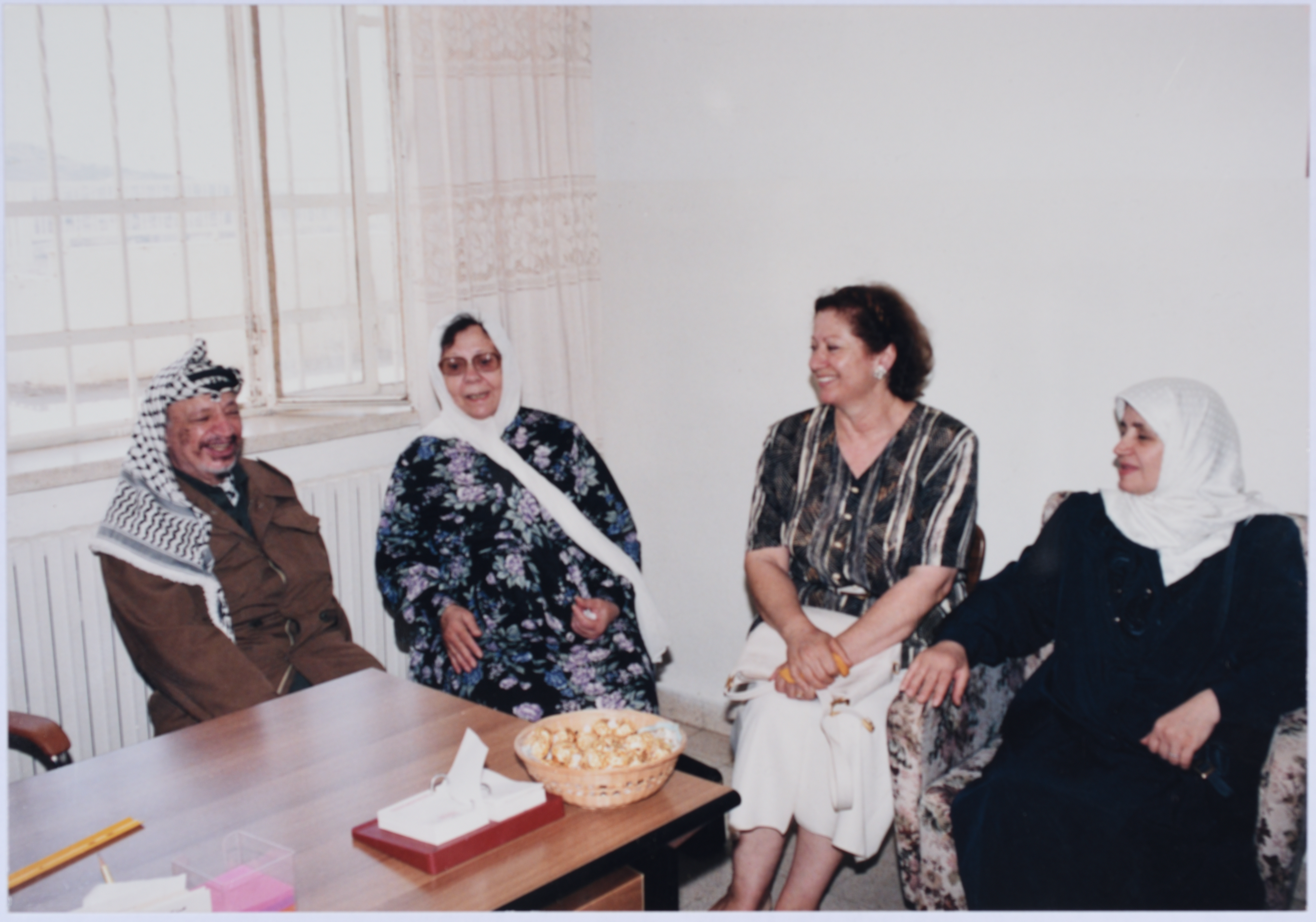 صورة ملونة من زيارة ياسر عرفات لجمعية الاتحاد النسائي العربي في نابلس، ومقابلته لأعضاء الجمعية وأطفال دار اليتيمات التابعة للجمعية.