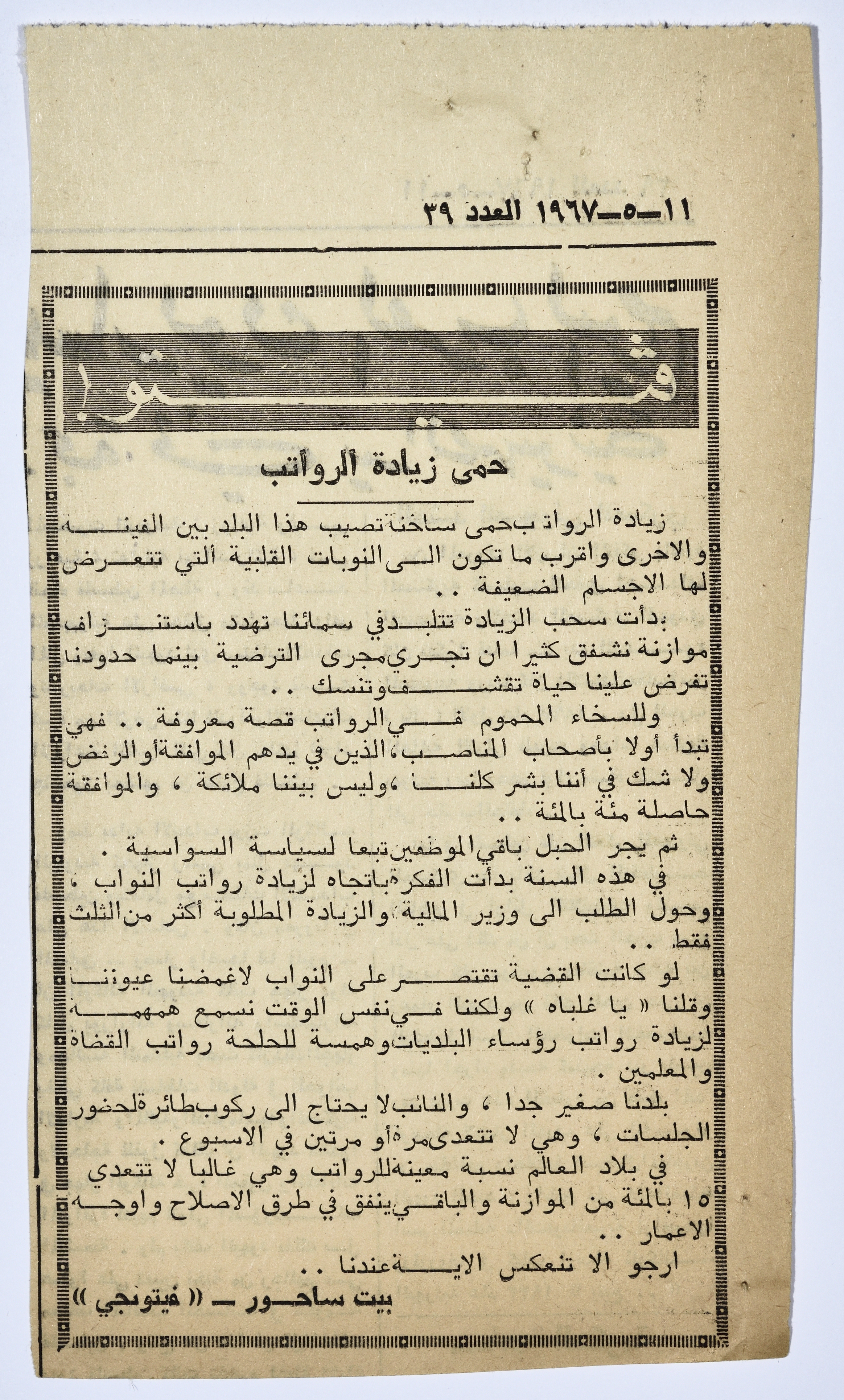 "حمى زيادة الرواتب"، قصاصة من جريدة فلسطين، 1967