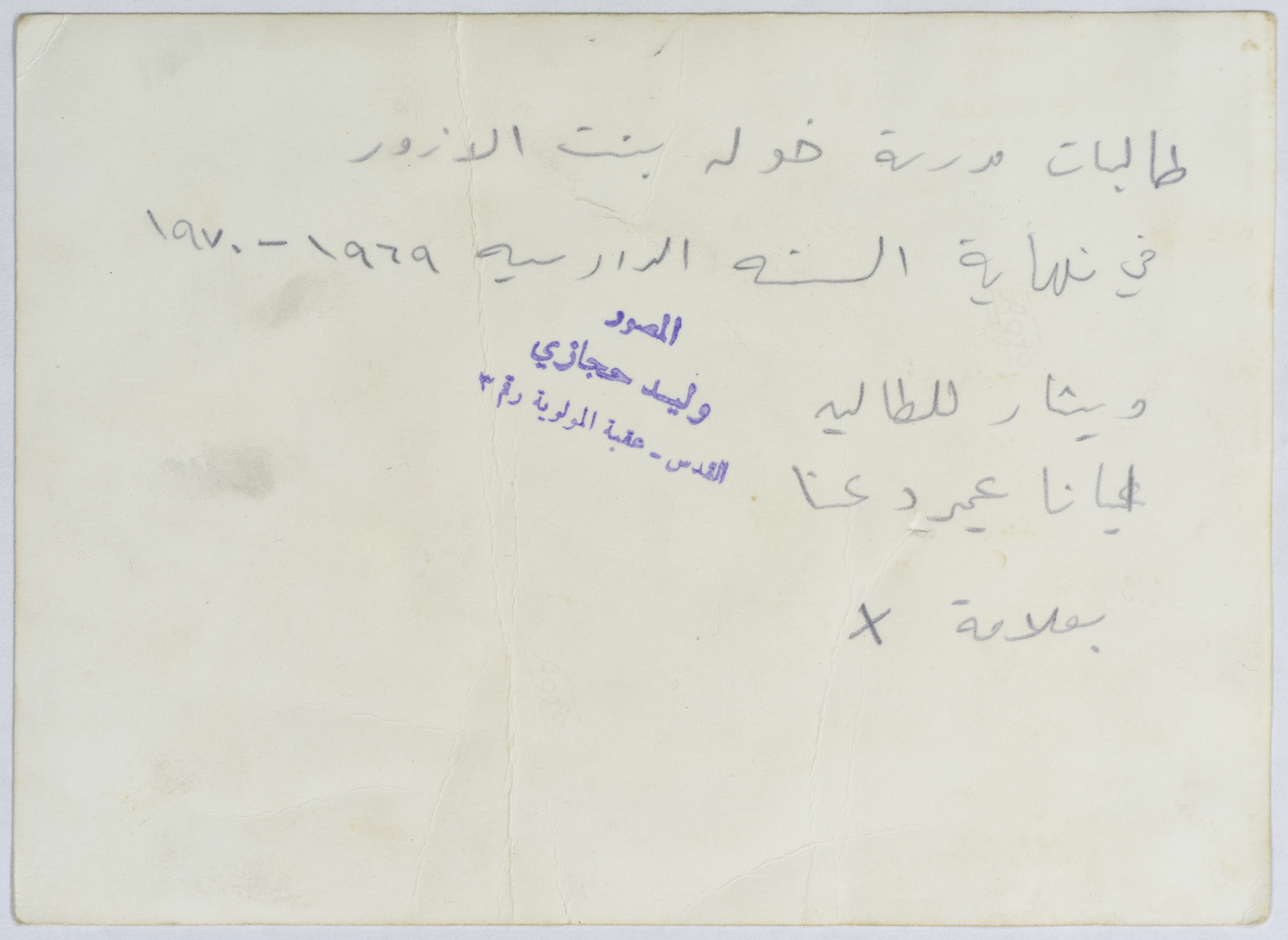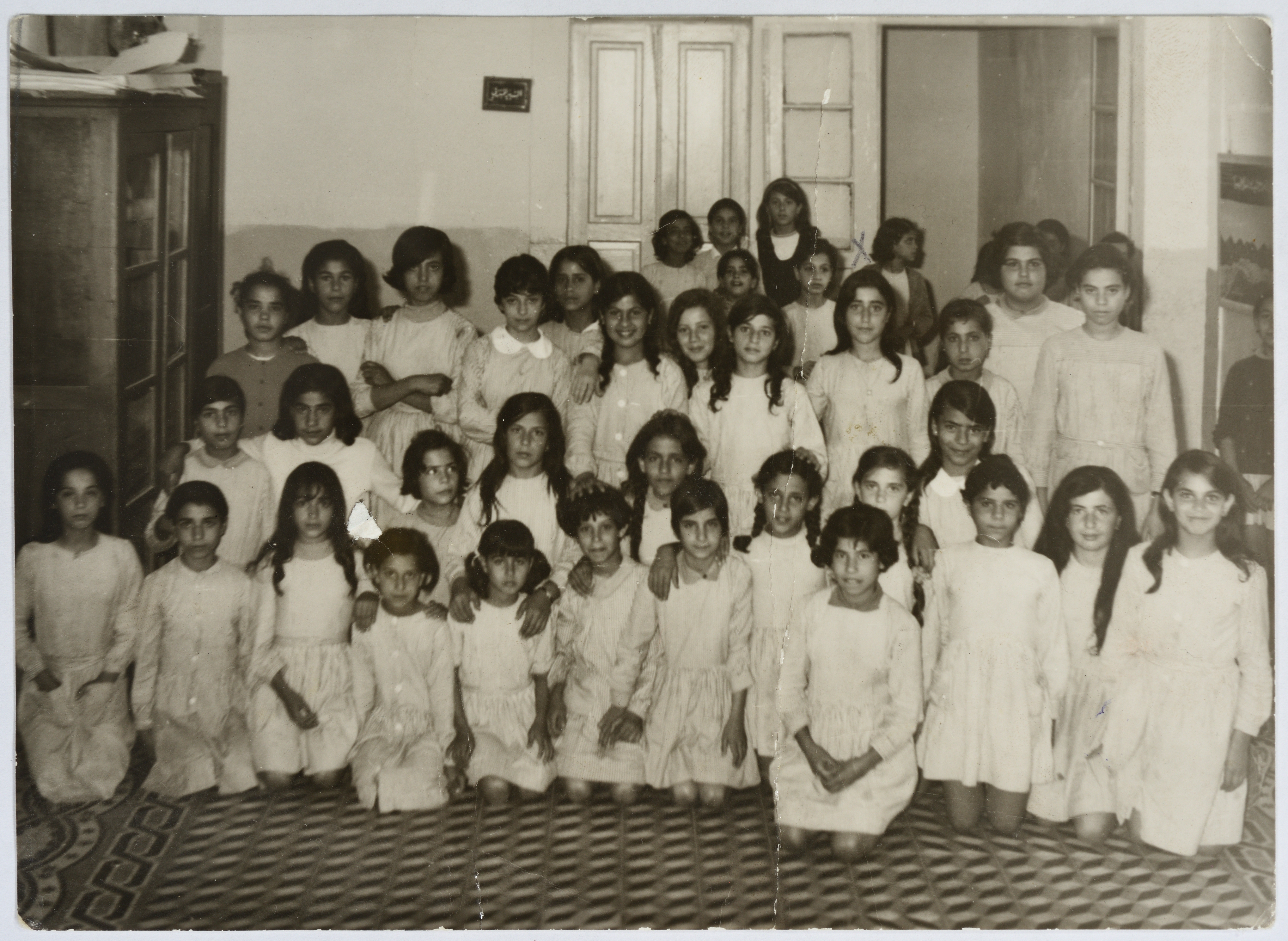 A black and white photo of the students of Khawla Bint Al Azwar School in the school year 1969-1970. Layana Omair Da'nah is seen in the photo