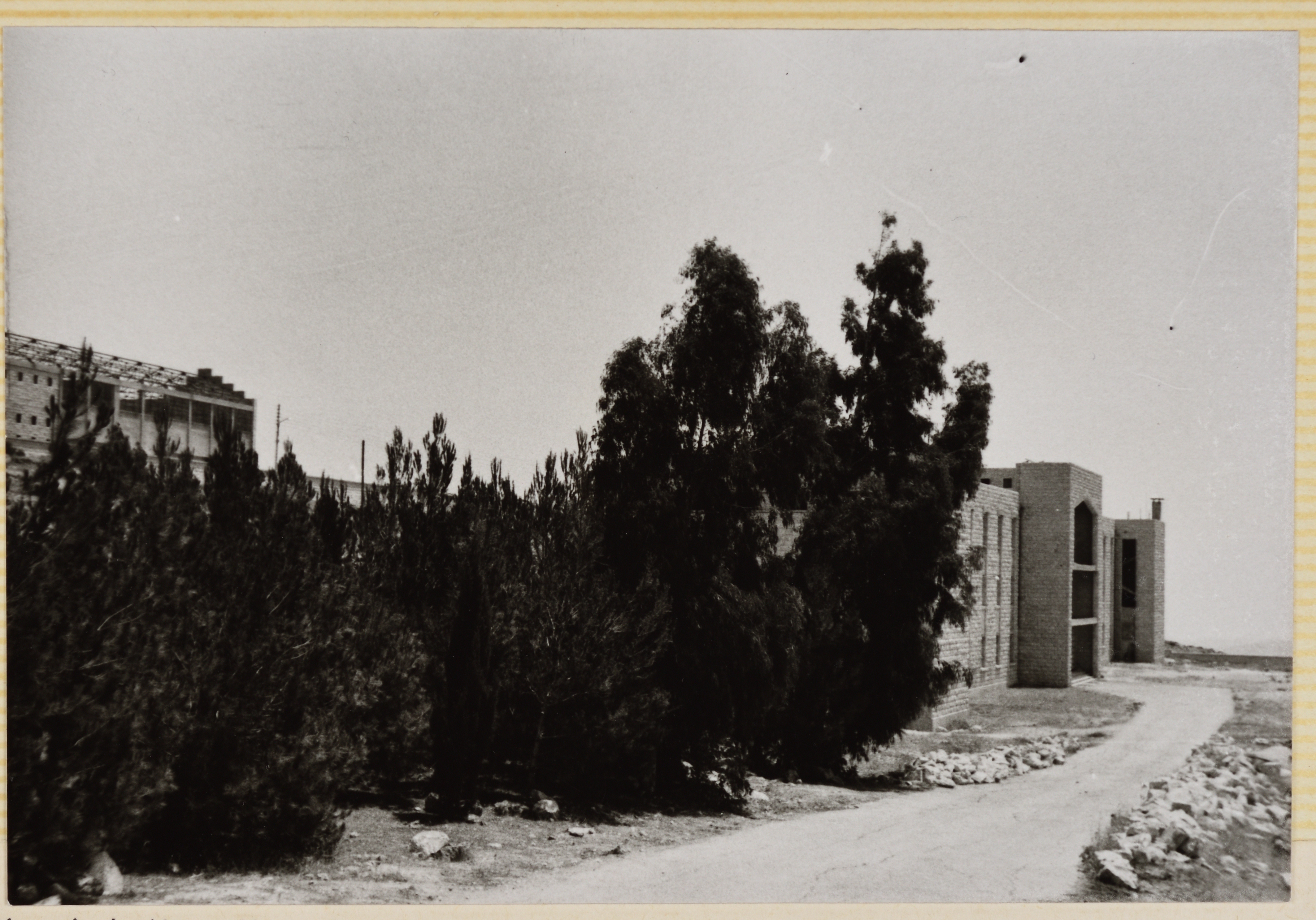 صورة غير ملونة تظهر فيها أشجار الصنوبر المحيطة بالمعهد العربي في أبو ديس.