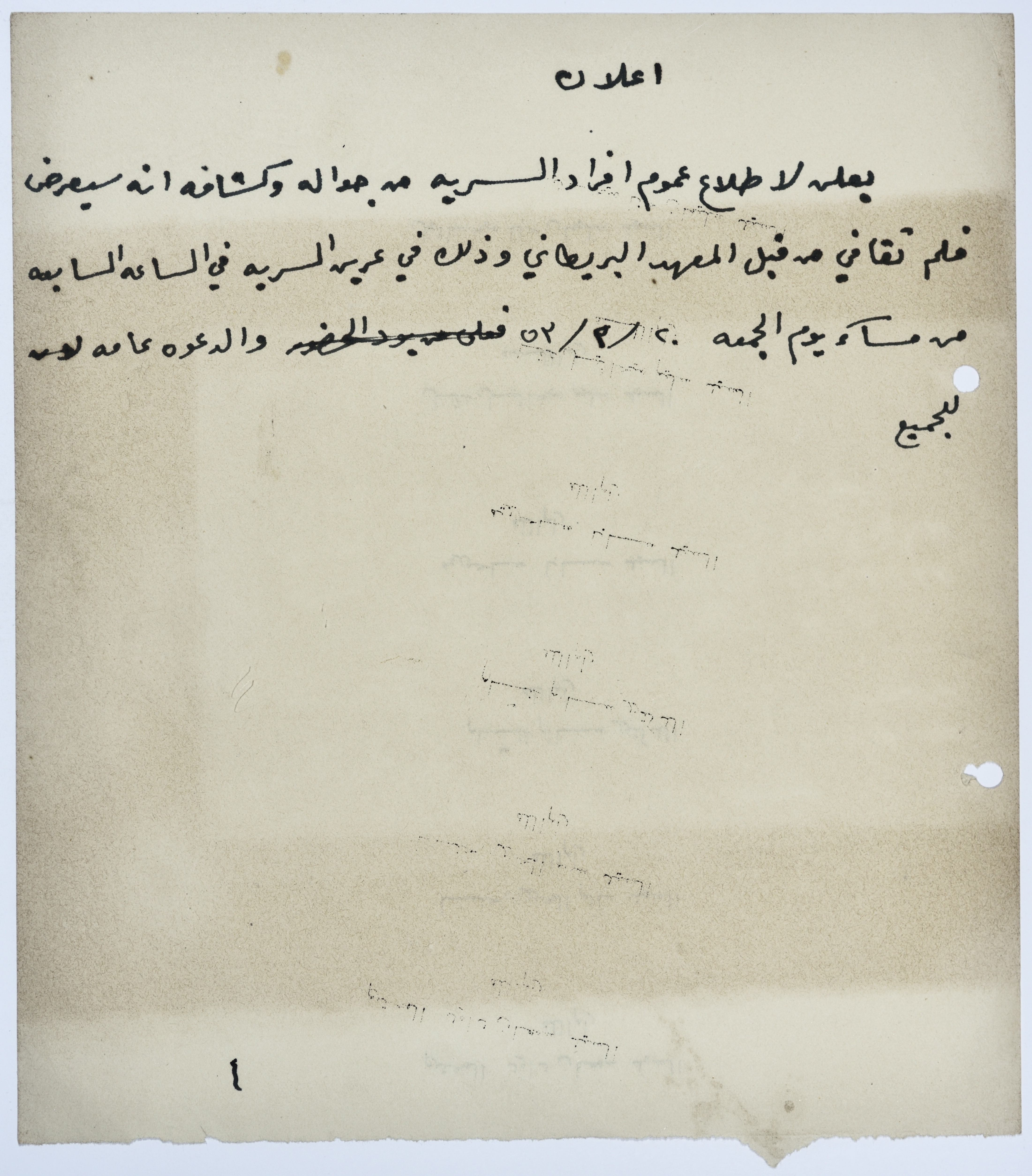 إعلان بخصوص عرض فيلم ثقافي من المعهد البريطاني في السرية