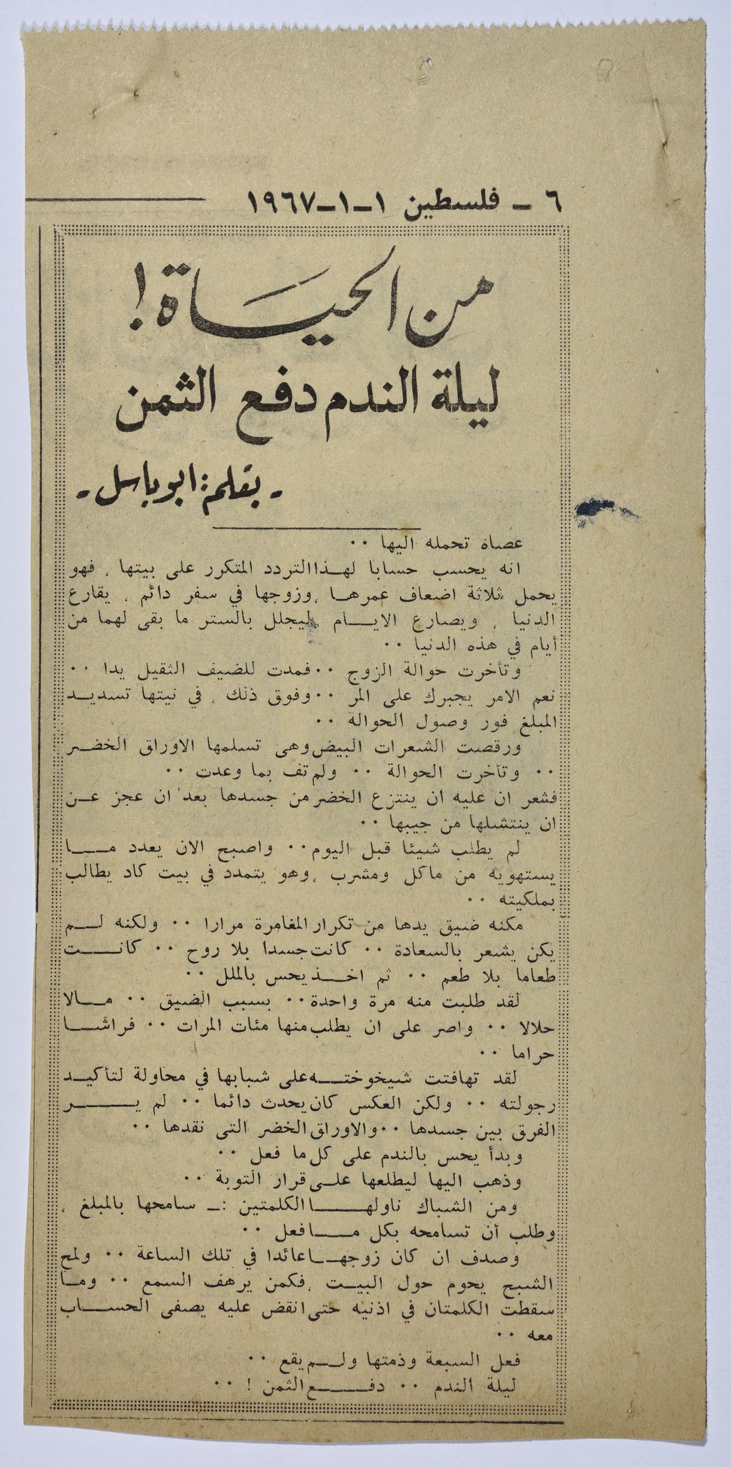 An article written in Arabic entitled "A Late Repentance" published in the "From Life!" column of Palestine Newspaper in 1966-1967. This article is from a series of articles written by Ya'qub Shoumali; which he signed with the "Abu Basel"