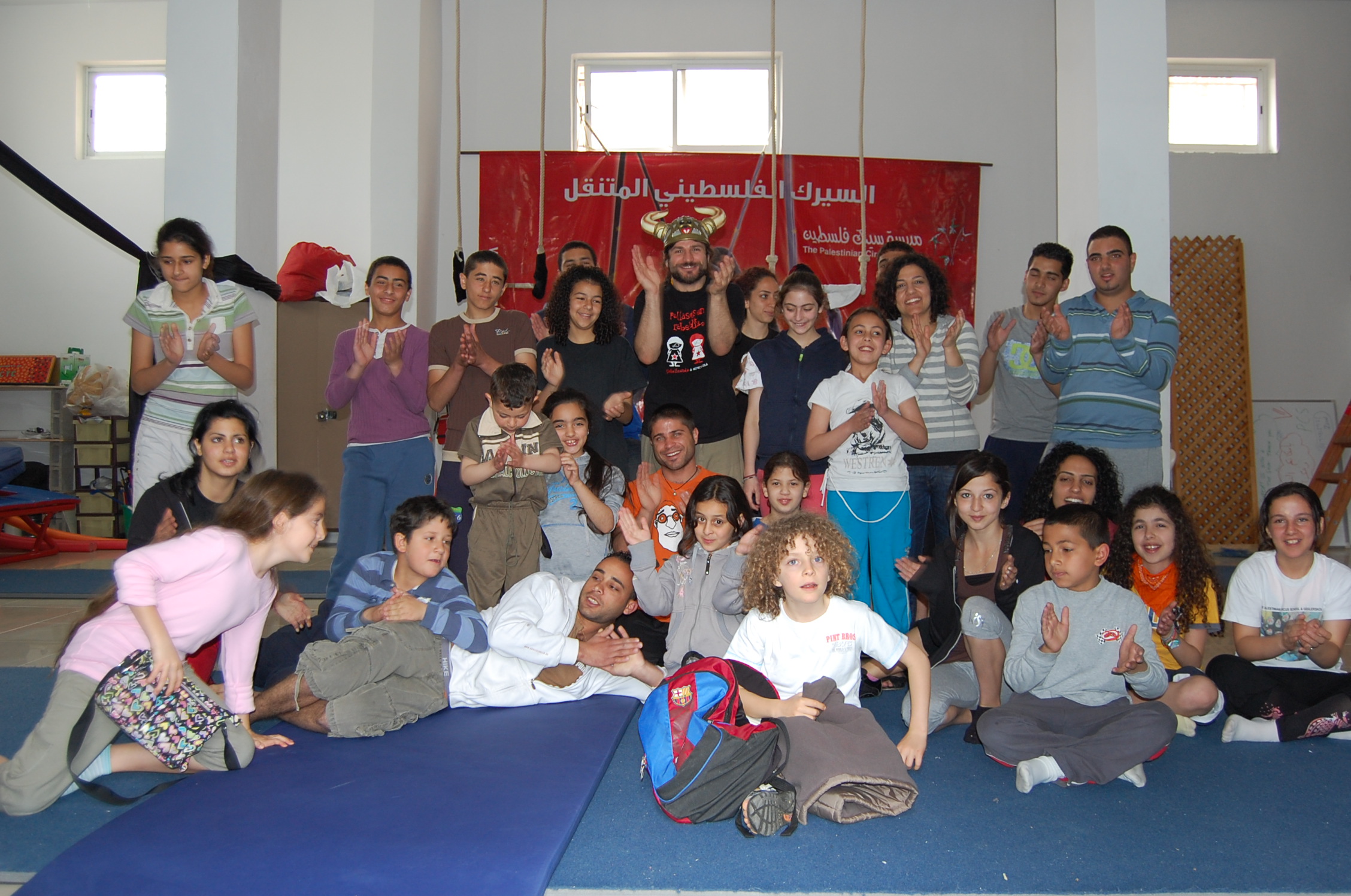 صورة من تدريبات مدرسة سيرك فلسطين مع فرقة أسبانية، 2009