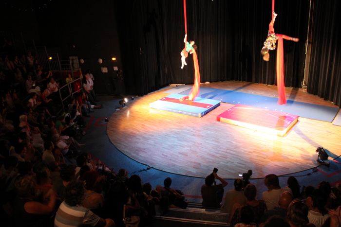 A colour photograph of the "Circus Behind the Wall" production, performed by the Palestinian Circus School in Toulouse, France. "Circus Behind the Wall" is a testimony of what the real life of Palestinians is: being separated from their families and beloved ones, their land and water by the Wall.