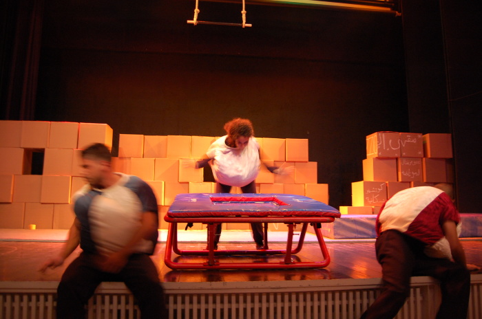 A colour photograph of "La Wein" production performed by the Palestinian Circus School. "La Wein" is the Palestinian Circus School's second production.