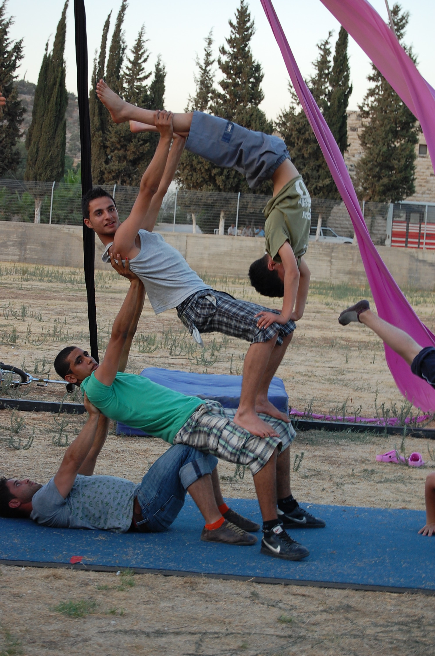 صورة ملونة ترصد جانبًا من فعاليات "السيرك المتنقل" من إنتاج مدرسة سيرك فلسطين عام 2010 في قرية الفارعة المحتلة،ِ قدَّم العرض جُملة من التدريبات المواءمة لكافة شرائح المجتمع بمشاركة أحمد ابو طالب، وسرين طوقان، وسوسن بصلات، وعلاء ابو الرب، وفادي زمرد، ولور صادق، ومحمد ابو الرب، محمد ابو كشك، ومحمد أبو طالب، ومحمد العزة، ومحمد غيث، ومرح أشمر، ومعتصم غيث، وميروبي مخلوق، وهزار عزة، ويزن عويضات.