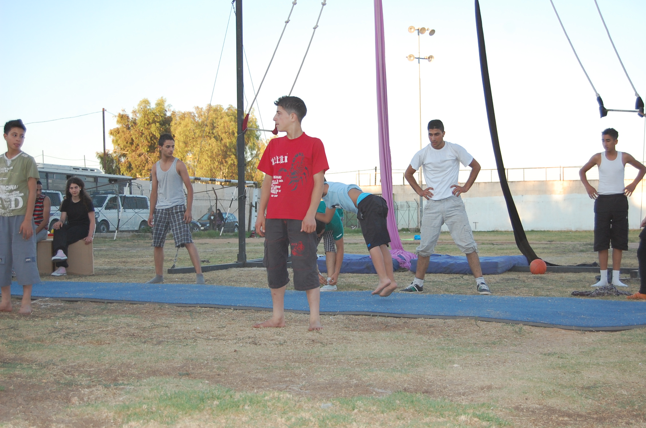 A colour photograph of the Palestine Circus School's production, "The Mobile Circus" in the Israeli-occupied city of Jenin in 2010. With a suite of training courses for all sections of society, the show featured a cast including, Ahmad Taleb, Alaʾ abu ar-Rub, Fady Zumurud, Hazar Azza, Laur Ṣadeq, Marah Ashmar, Mayrouby Makhluq, Muhammad abu ar-Rub, Muhammad abu Kishek, Muhammad abu Taleb, Muhammad al-Azza, Muhammad Ghayth, Muʿtaṣem Ghayth, and Yazan ʿWaydat.