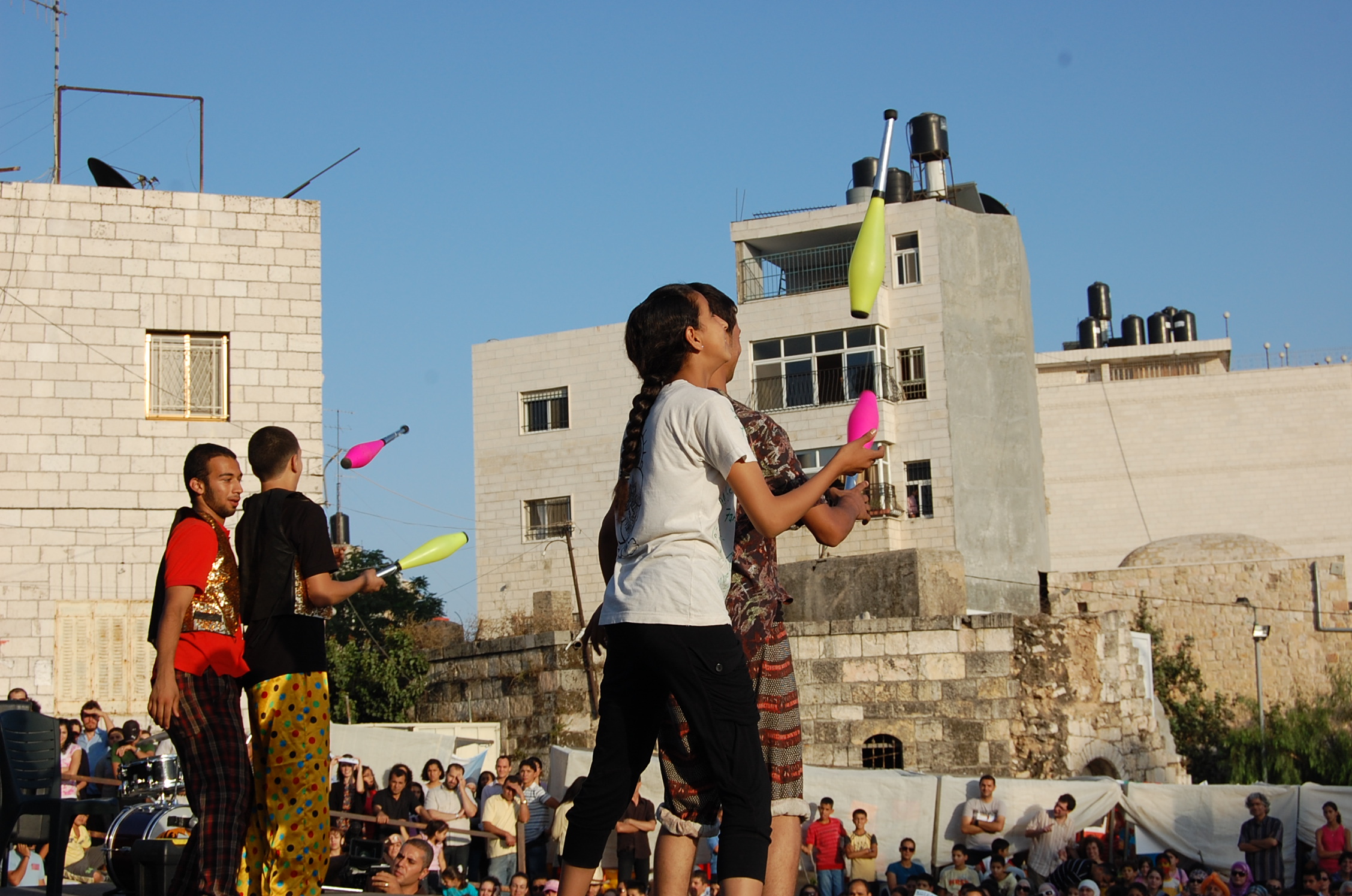 A colour photograph of the Palestine Circus School's production, "The Mobile Circus" at the Ramallah Municipality Souk al-Harajeh event in 2010. With a suite of training courses for all sections of society, the show featured a cast including, Ahmad Taleb, Alaʾ abu ar-Rub, Fady Zumurud, Hazar Azza, Laur Ṣadeq, Marah Ashmar, Mayrouby Makhluq, Muhammad abu ar-Rub, Muhammad abu Kishek, Muhammad abu Taleb, Muhammad al-Azza, Muhammad Ghayth, Muʿtaṣem Ghayth, Sawsan Baṣalat, Sirin Tuqan, and Yazan ʿWaydat.