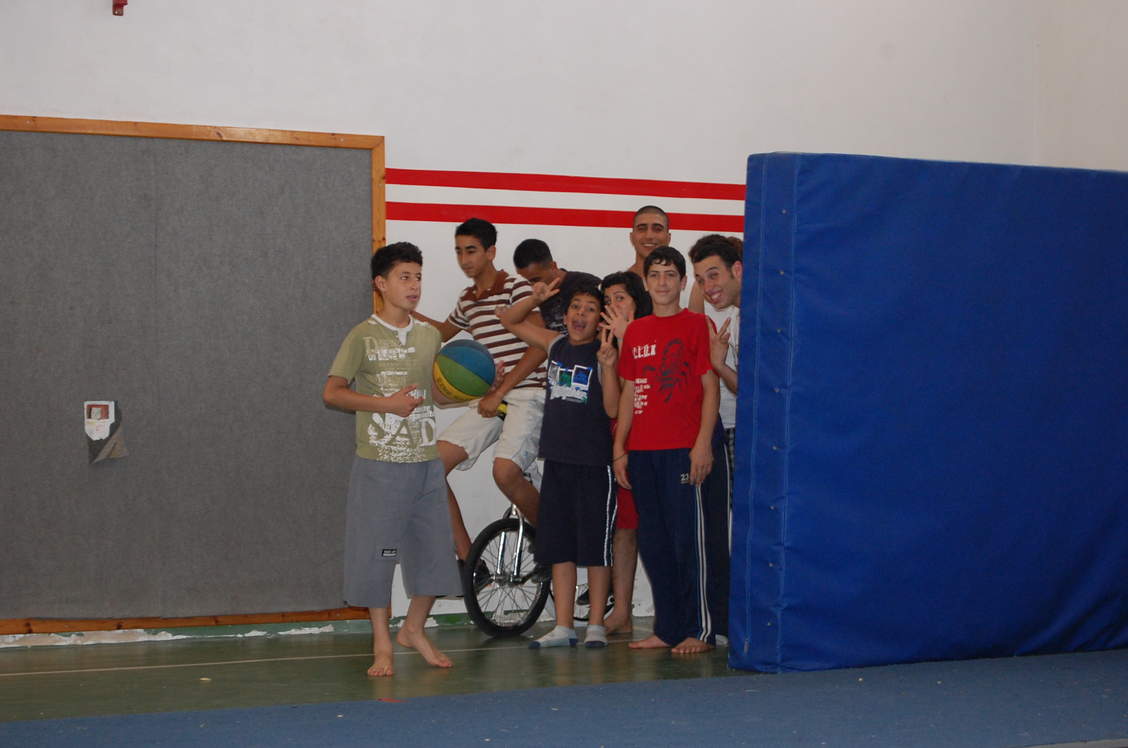 صورة ملونة من من تدريبات المدرسة الصيفية التي تقيمها "مدرسة سيرك فلسطين".