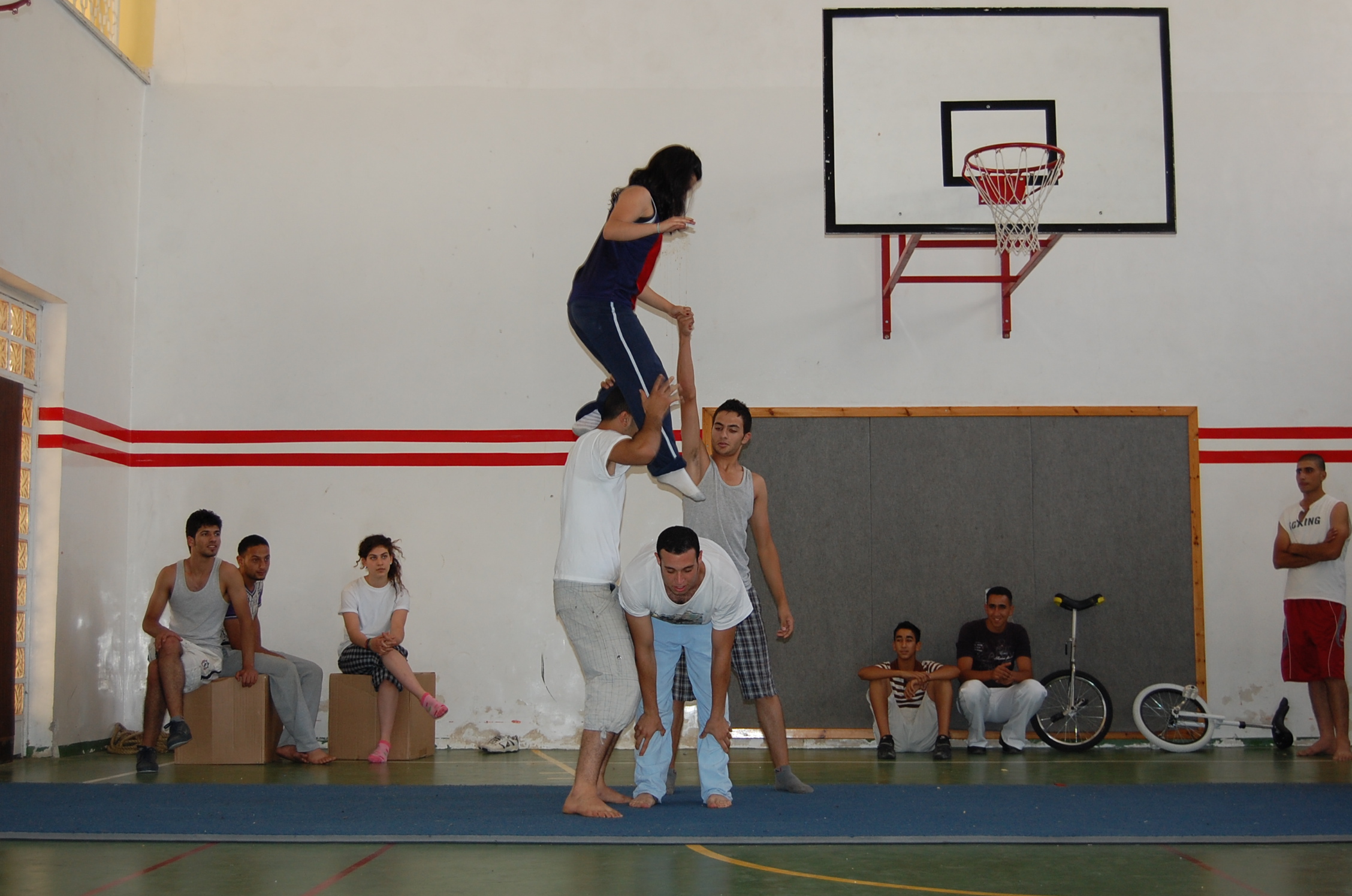 صورة ملونة من من تدريبات المدرسة الصيفية التي تقيمها "مدرسة سيرك فلسطين".