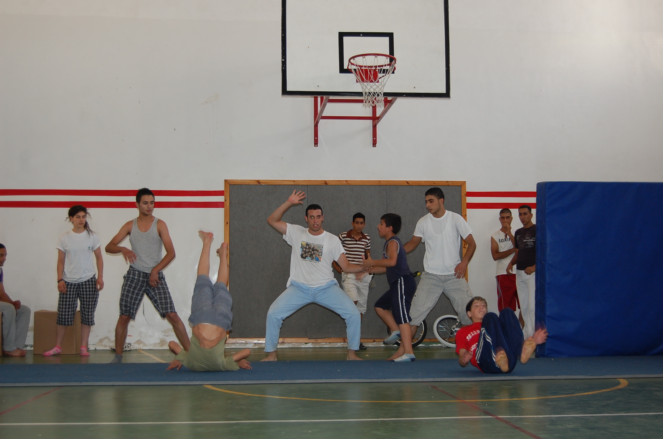 صورة ملونة من من تدريبات المدرسة الصيفية التي تقيمها "مدرسة سيرك فلسطين".
