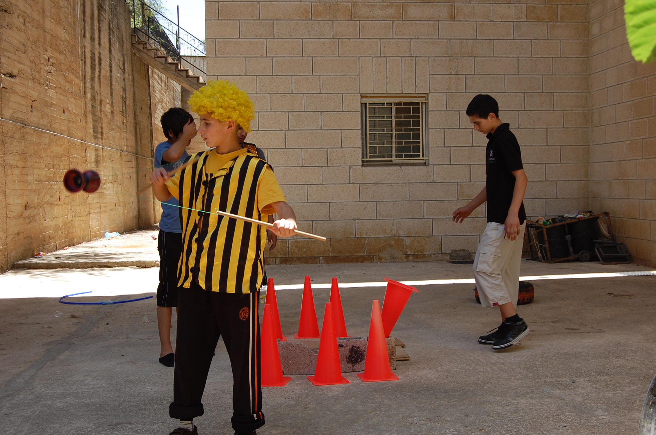 صورة ملونة من من تدريبات المدرسة الصيفية التي تقيمها "مدرسة سيرك فلسطين".
