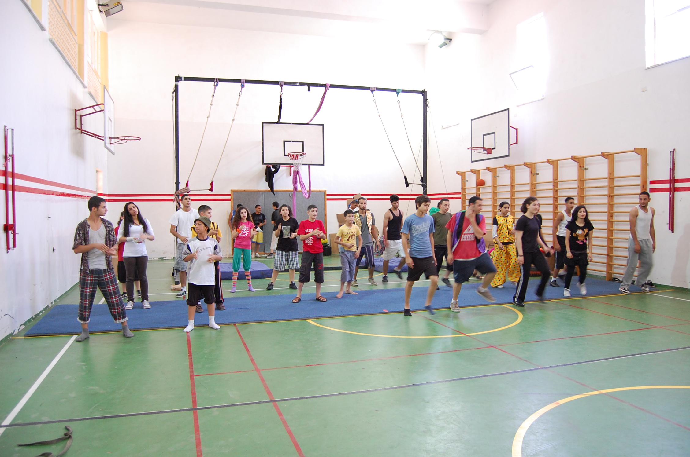 صورة ملونة من من تدريبات المدرسة الصيفية التي تقيمها "مدرسة سيرك فلسطين".