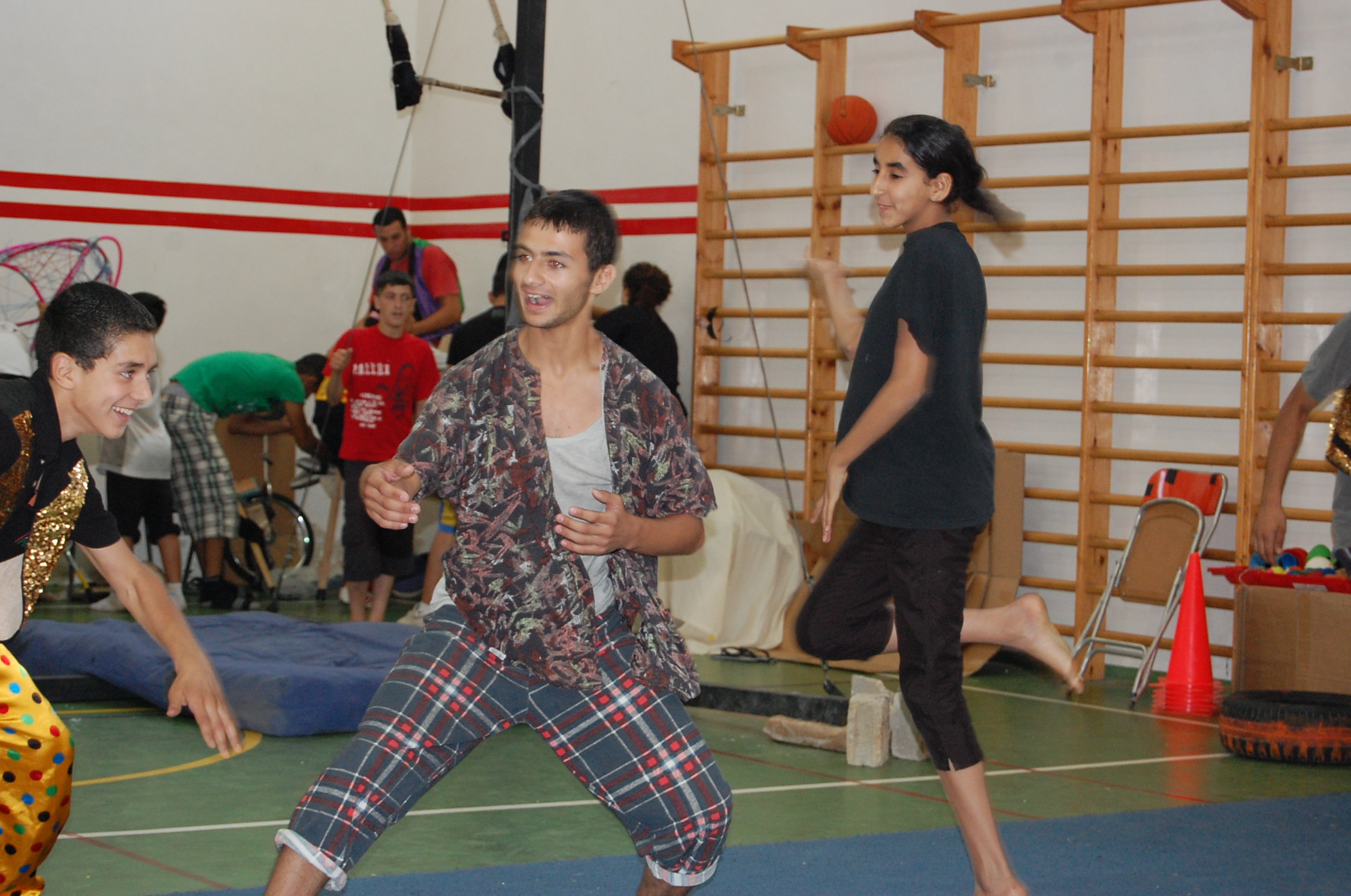 صورة ملونة من من تدريبات المدرسة الصيفية التي تقيمها "مدرسة سيرك فلسطين".