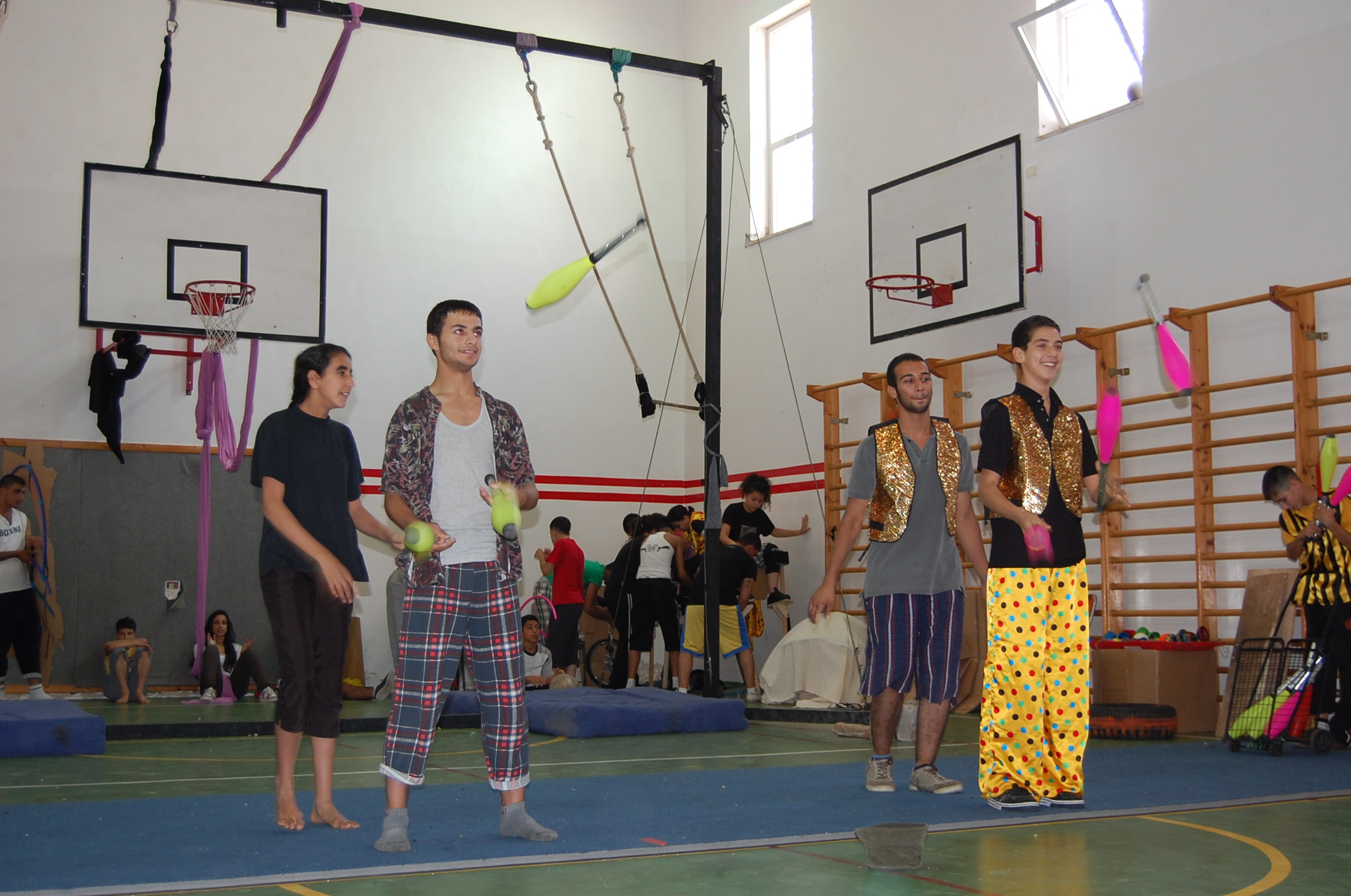 صورة ملونة من من تدريبات المدرسة الصيفية التي تقيمها "مدرسة سيرك فلسطين".