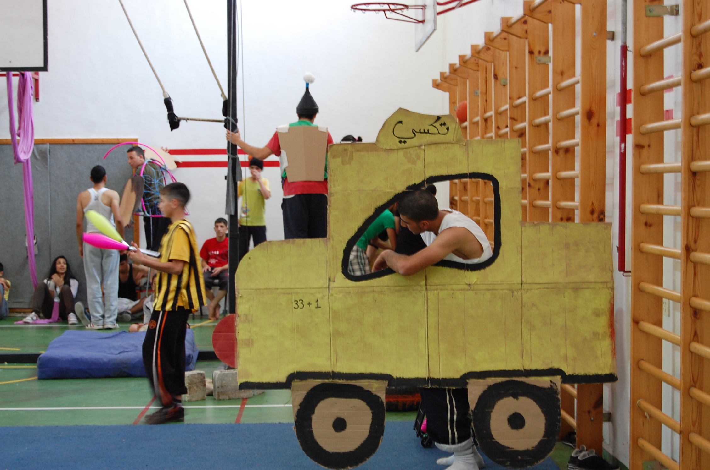 صورة ملونة من من تدريبات المدرسة الصيفية التي تقيمها "مدرسة سيرك فلسطين".
