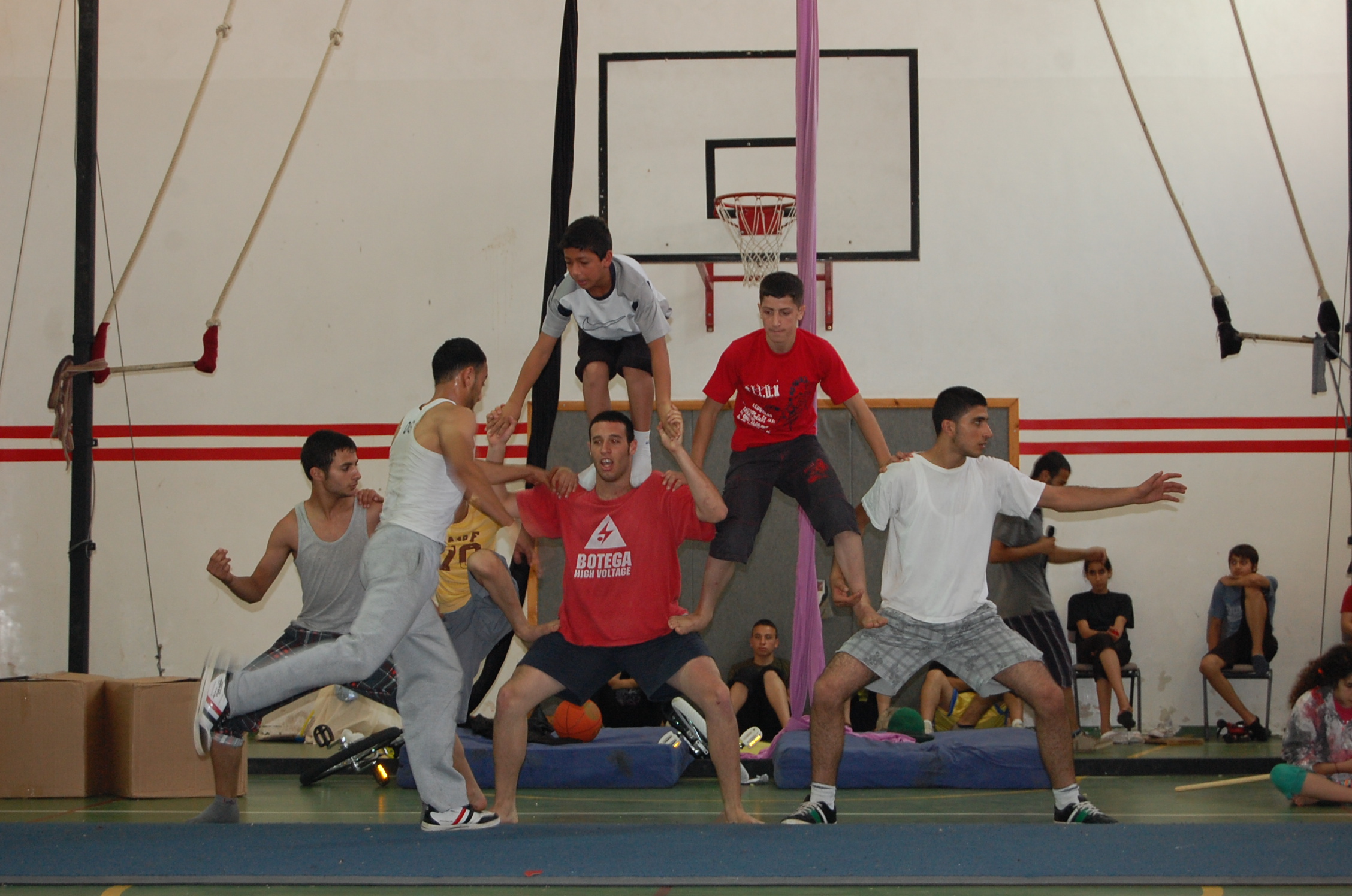 صورة ملونة من من تدريبات المدرسة الصيفية التي تقيمها "مدرسة سيرك فلسطين".