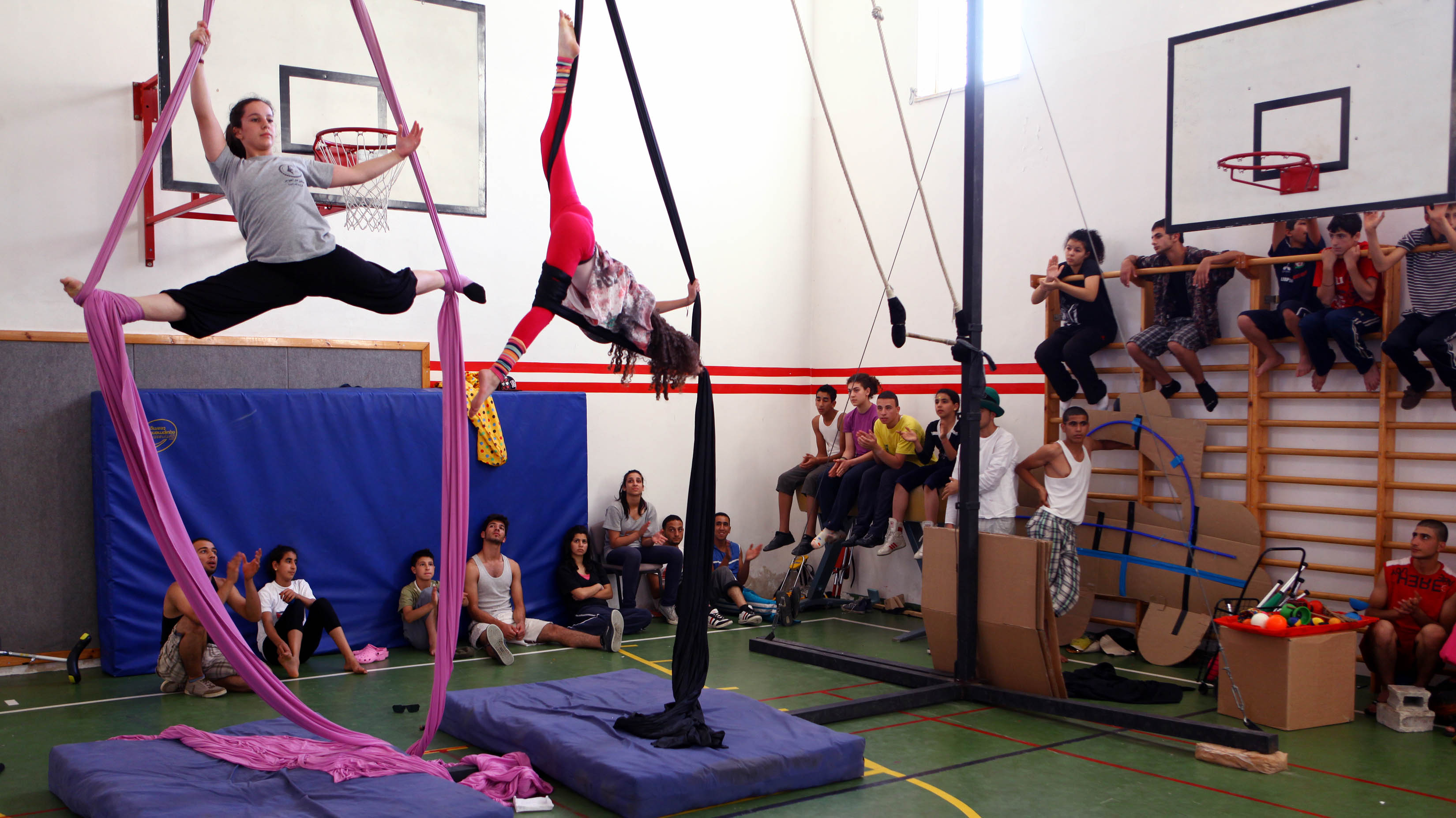 صورة ملونة من من تدريبات المدرسة الصيفية التي تقيمها "مدرسة سيرك فلسطين".