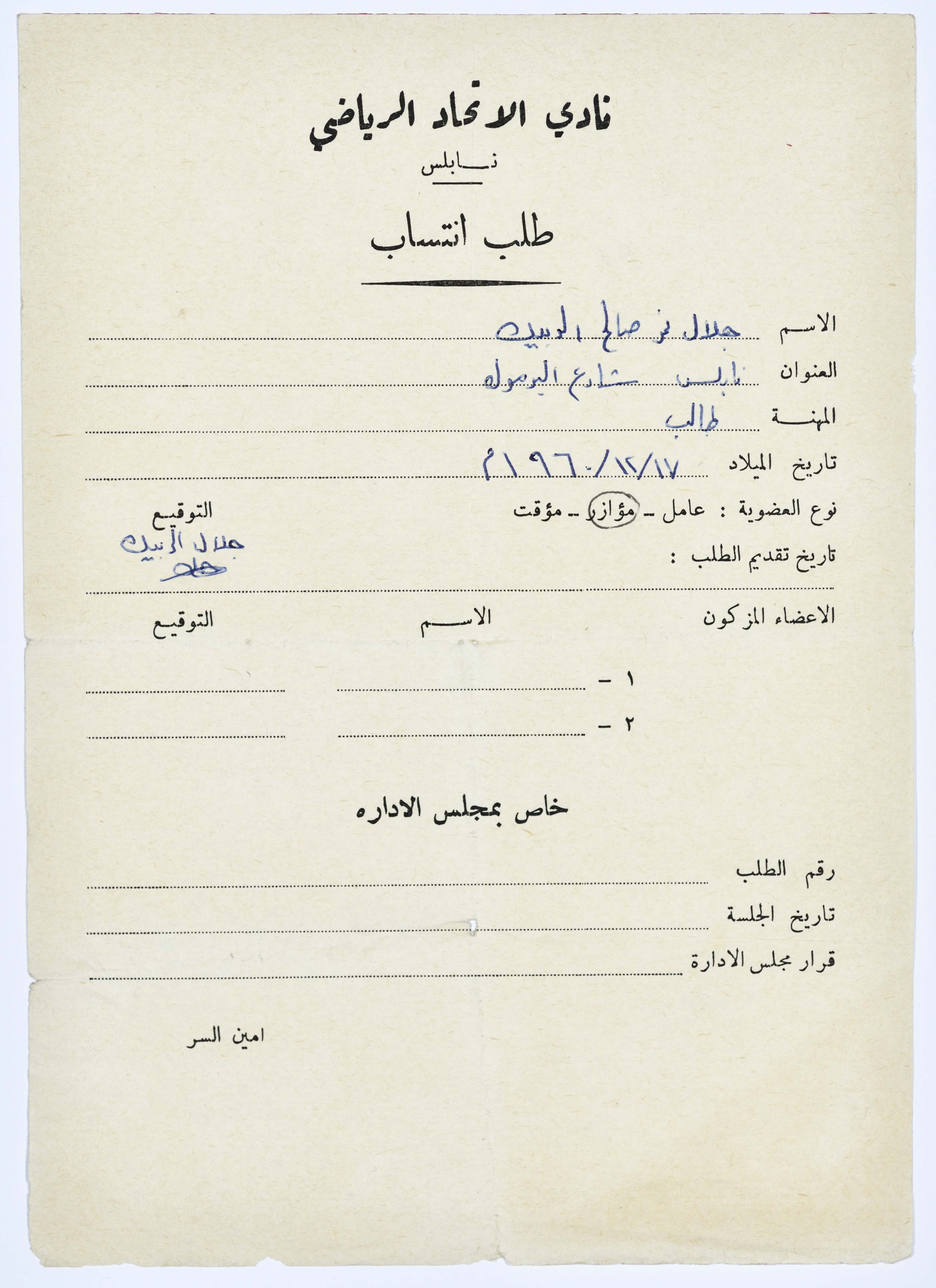 طلب انتساب في نادي الاتحاد الرياضي