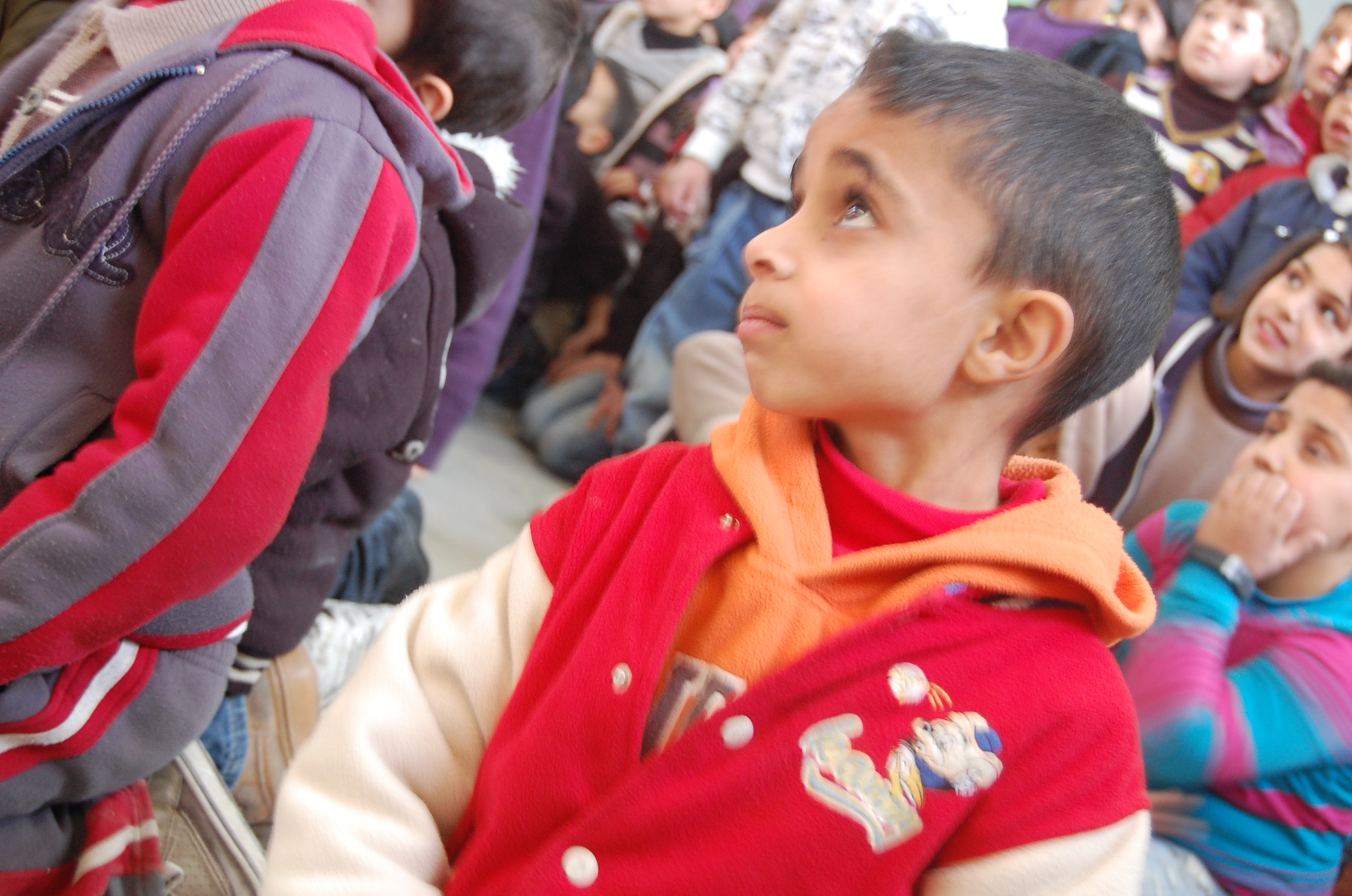A colour photograph of a performance by a Belgian circus troupe hosted by the Palestinian Circus School.