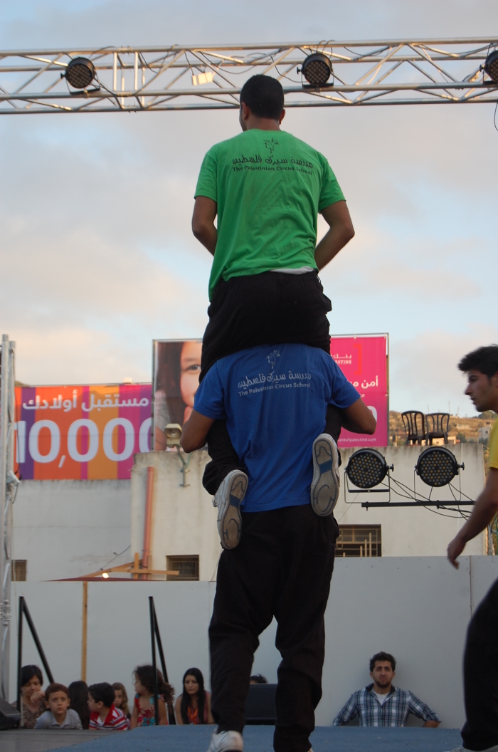 صورة ملونة ترصد لمحة من عرض "أحلام للبيع"، وهو الإنتاج الثالث لمدرسة سيرك فلسطين عام 2010، في قرية جفنا.