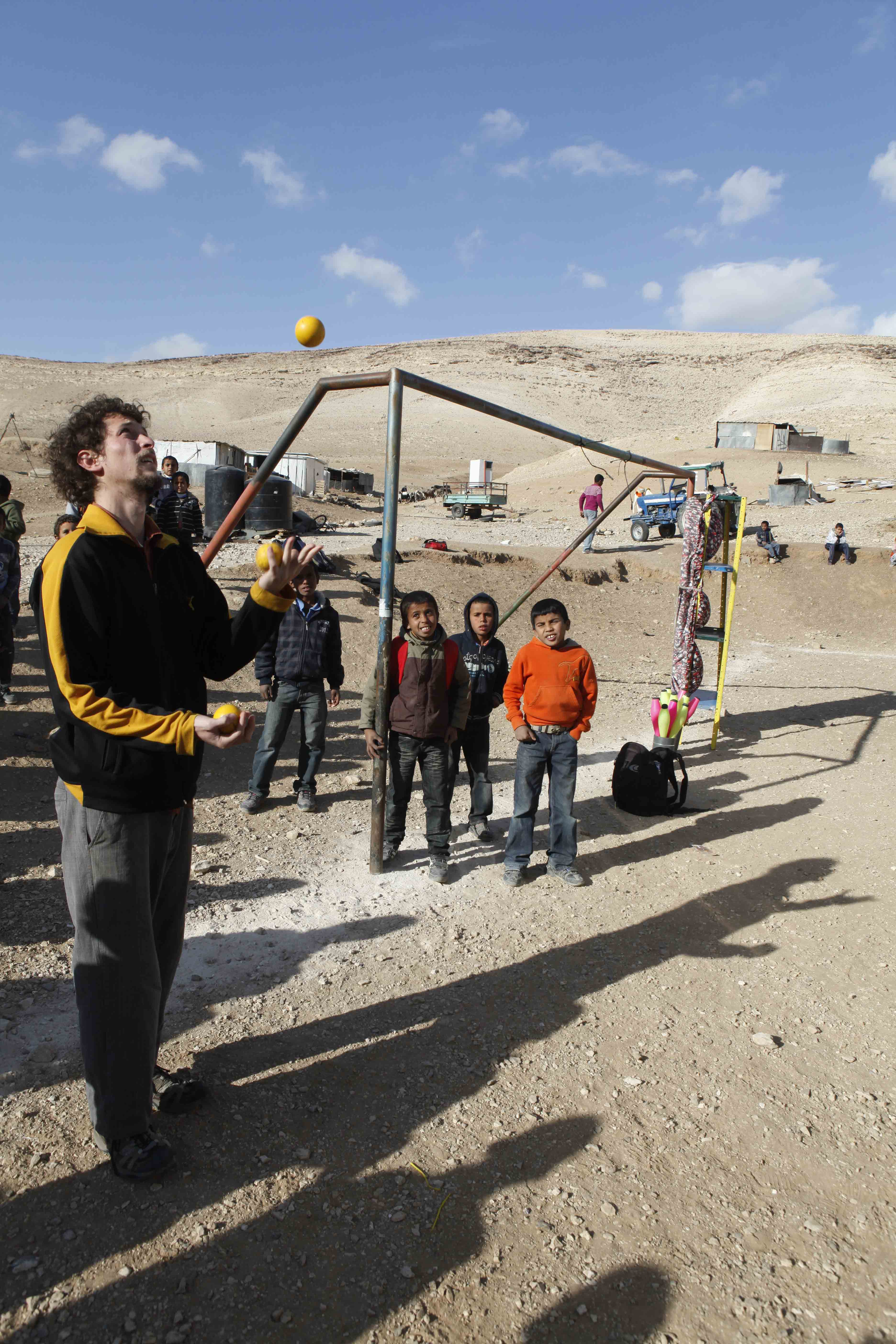صورة ملونة ترصد لمحة من عرض "أحلام للبيع"، وهو الإنتاج الثالث لمدرسة سيرك فلسطين عام 2010 في العيزرية. الممثلون : أحمد أبو طالب، محمد أبو طالب، محمد أبو سخا، ونور أبو الرب. تدريب وإخراج كل من: جاك جاكس، سيفيرين بيليني، كريستا فاتكا، نايف عثمان وتوماس سوكووُوفيتش. ديكور وأزياء: رامي عارضة.