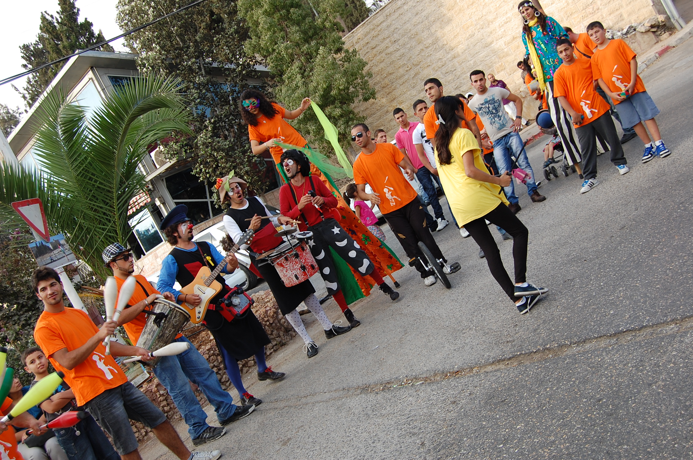A colour photograph capturing a glimpse of the Festiclown Festival performances in Palestine in collaboration with the Palestinian Circus School.