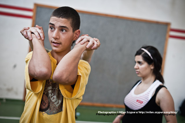 صورة ملونة من احدى عروض السيرك المتنقل الخاص بمدرسة سيرك فلسطين في صيف عام 2011.