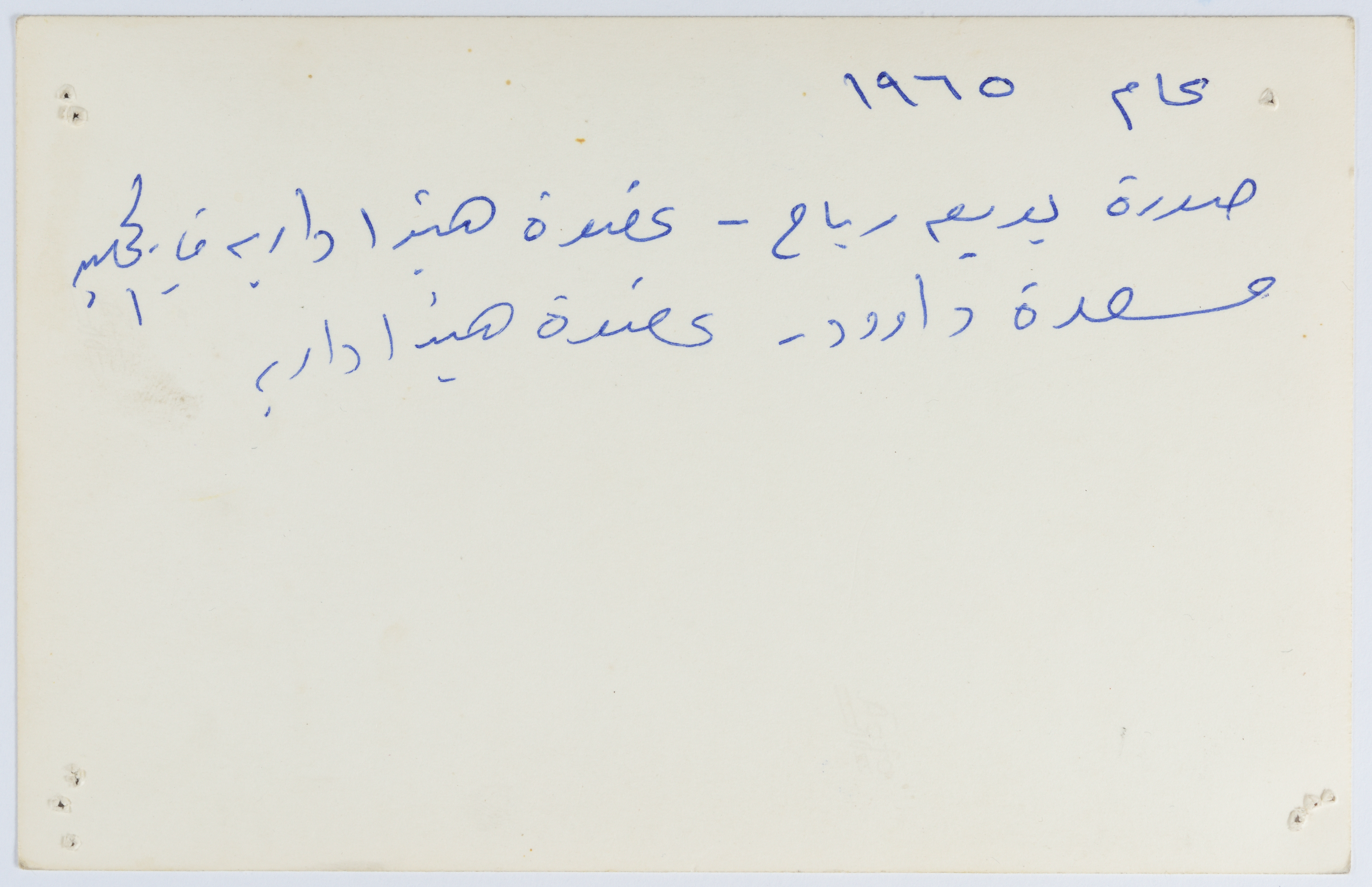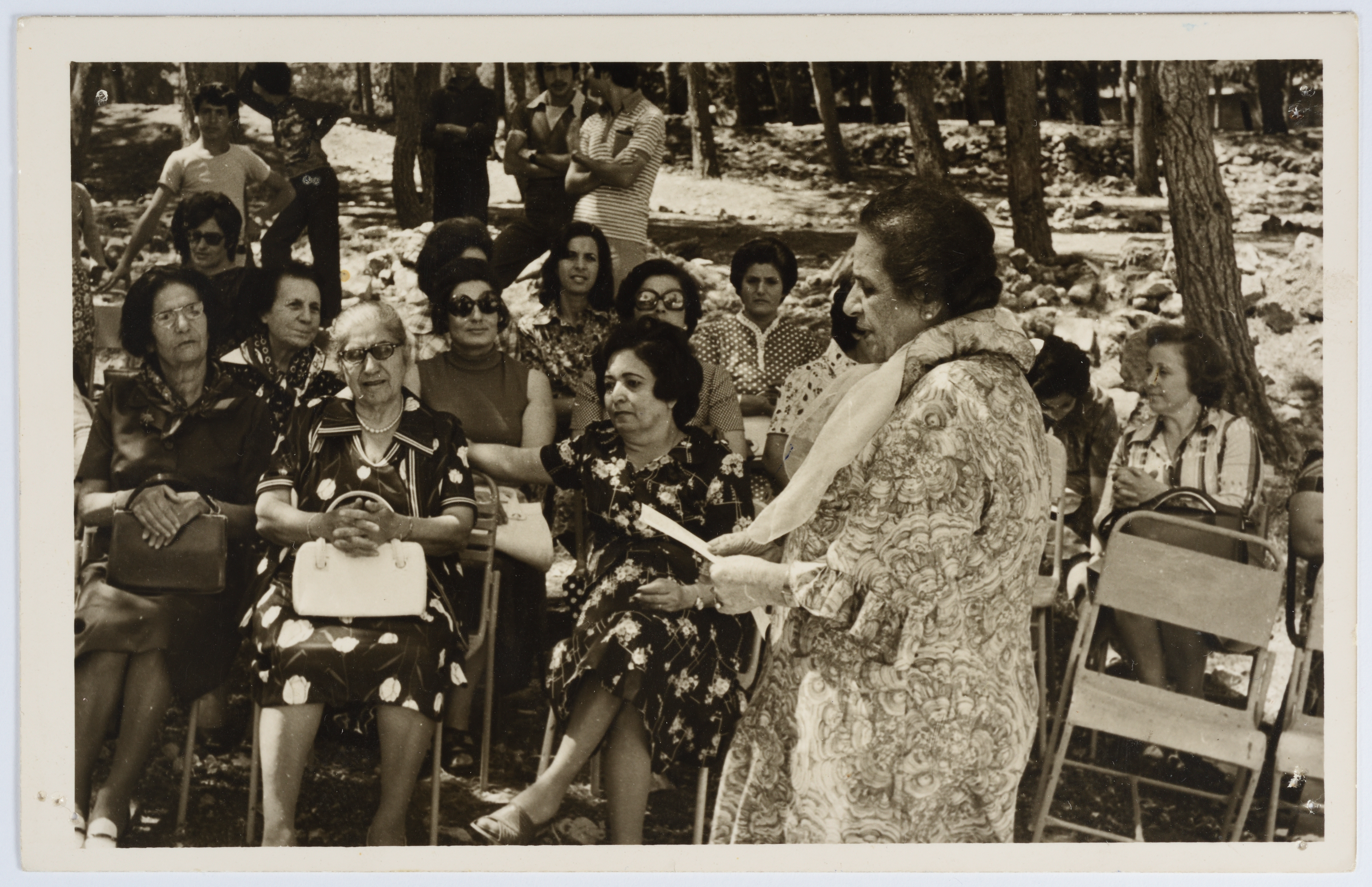 صورة غير ملونة تظهر فيها بديعة رباح، عضوة الهيئة الإدارية للاتحاد، وهي تلقي كلمة أمام عضوات الاتحاد، منهن مسعدة داوود، في أحد أحراش رام الله.