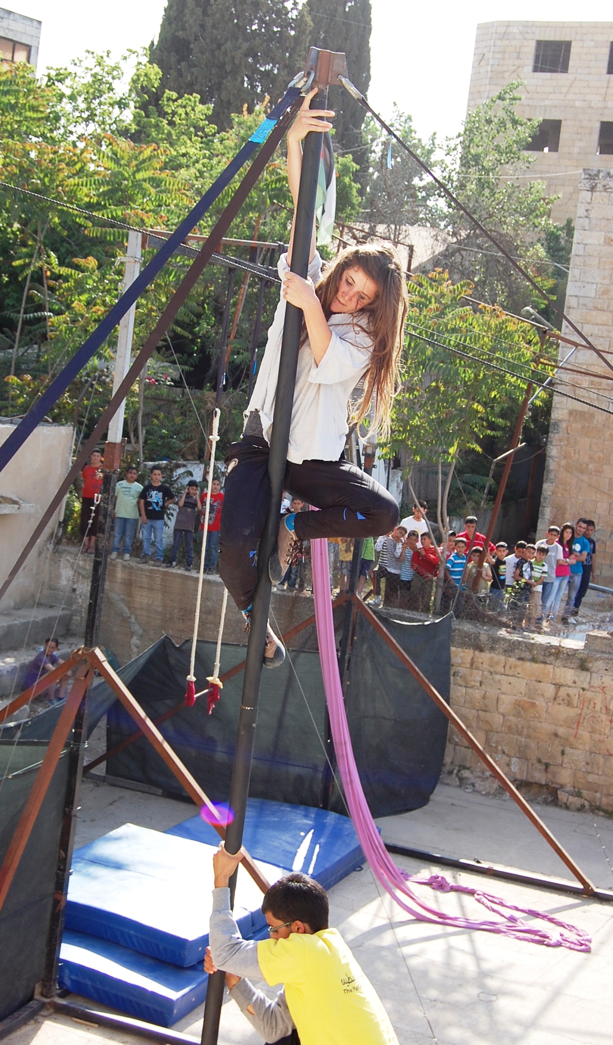 صورة ملونة من يوم مفتوح نظمته "مدرسة سيرك فلسطين" في بلدة بيرزيت.
