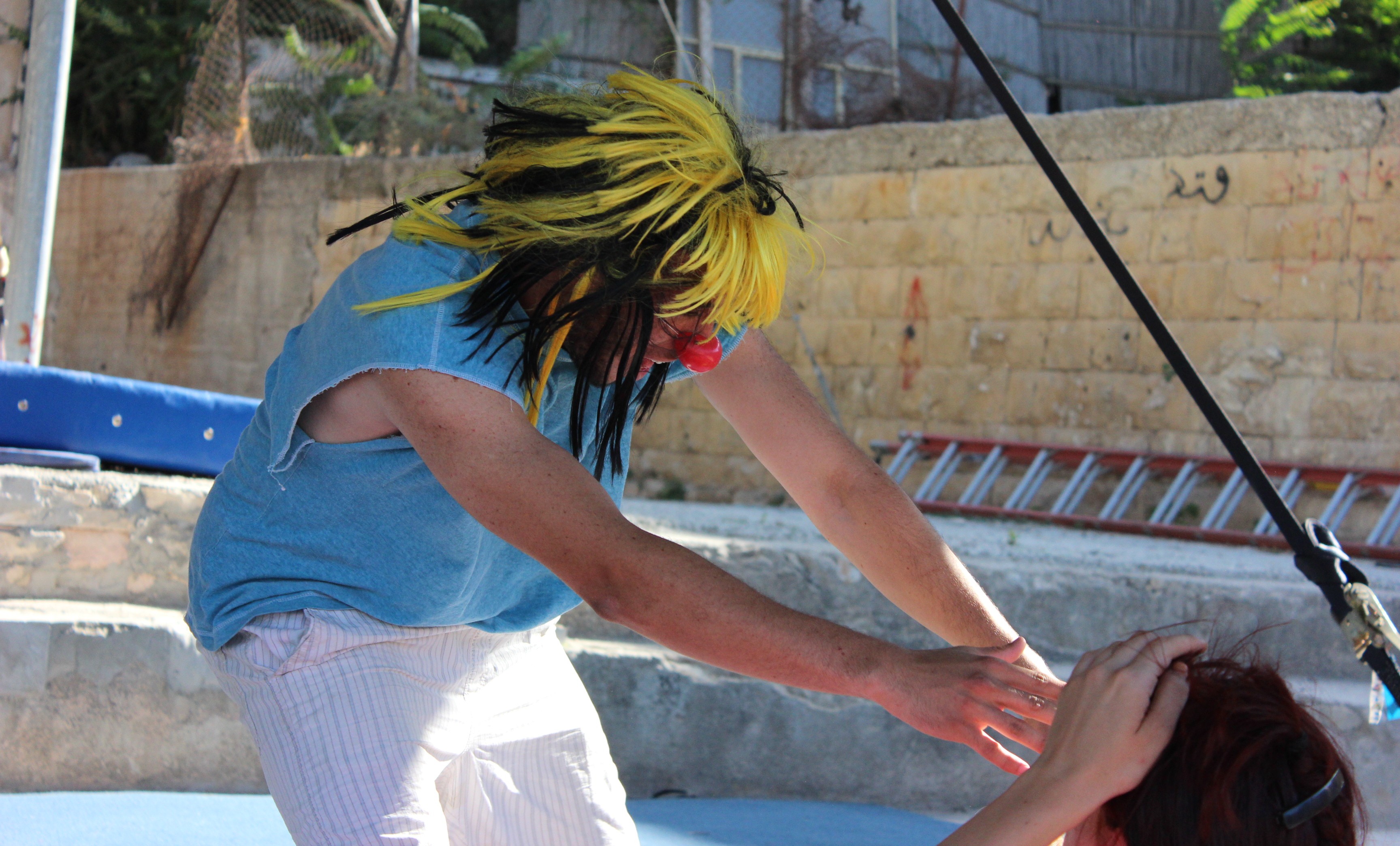 Taken in 2012, this is a colour photograph of a summer school that was organised by the Palestinian Circus School (PCS) in Birzeit, north of Israeli-occupied Ramallah.