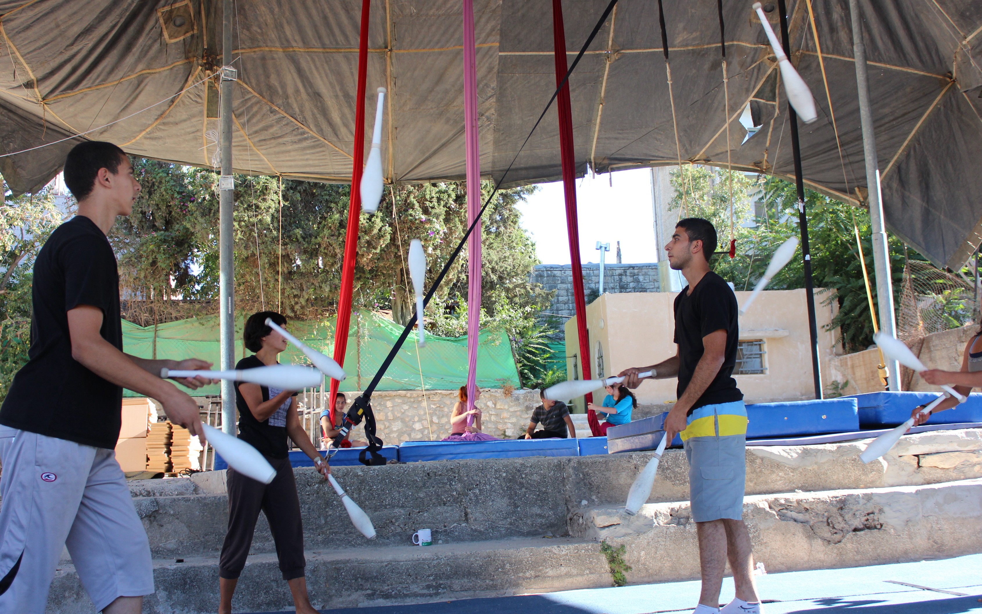 صورة ملوَّنة، التُقطت عام 2012، ترصد جانبًا من مدرسة صيفيَّة نظمتها مدرسة سيرك فلسطين في بلدة بيرزيت شماليّ مدينة رام الله المحتلَّة.