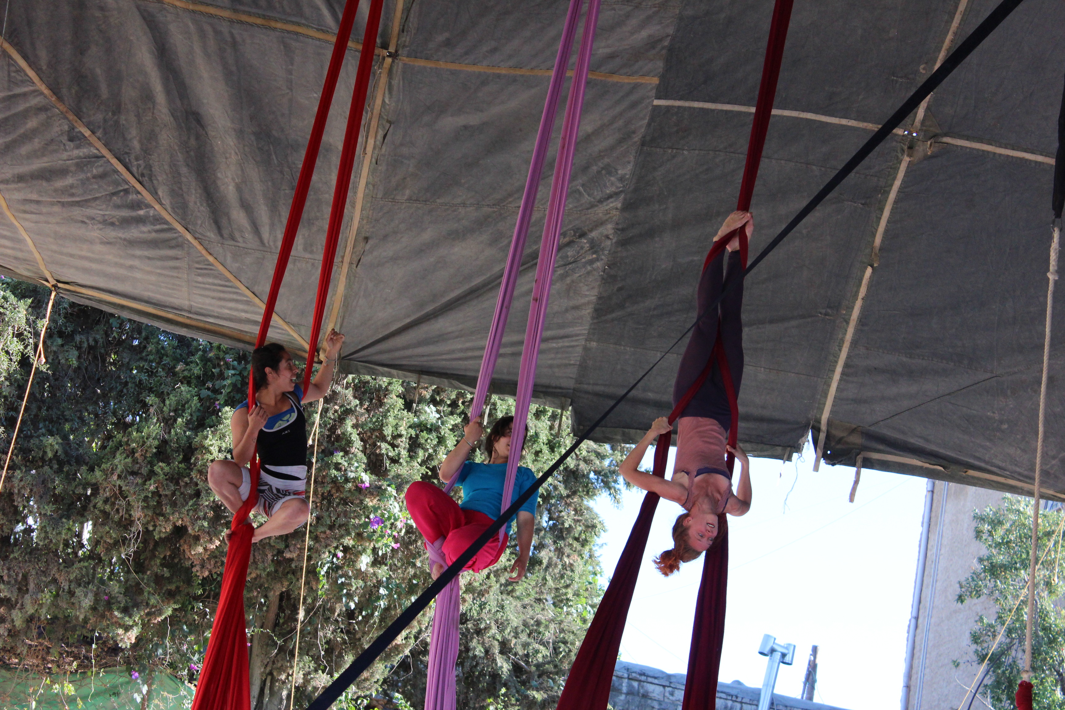 Taken in 2012, this is a colour photograph of a summer school that was organised by the Palestinian Circus School (PCS) in Birzeit, north of Israeli-occupied Ramallah.