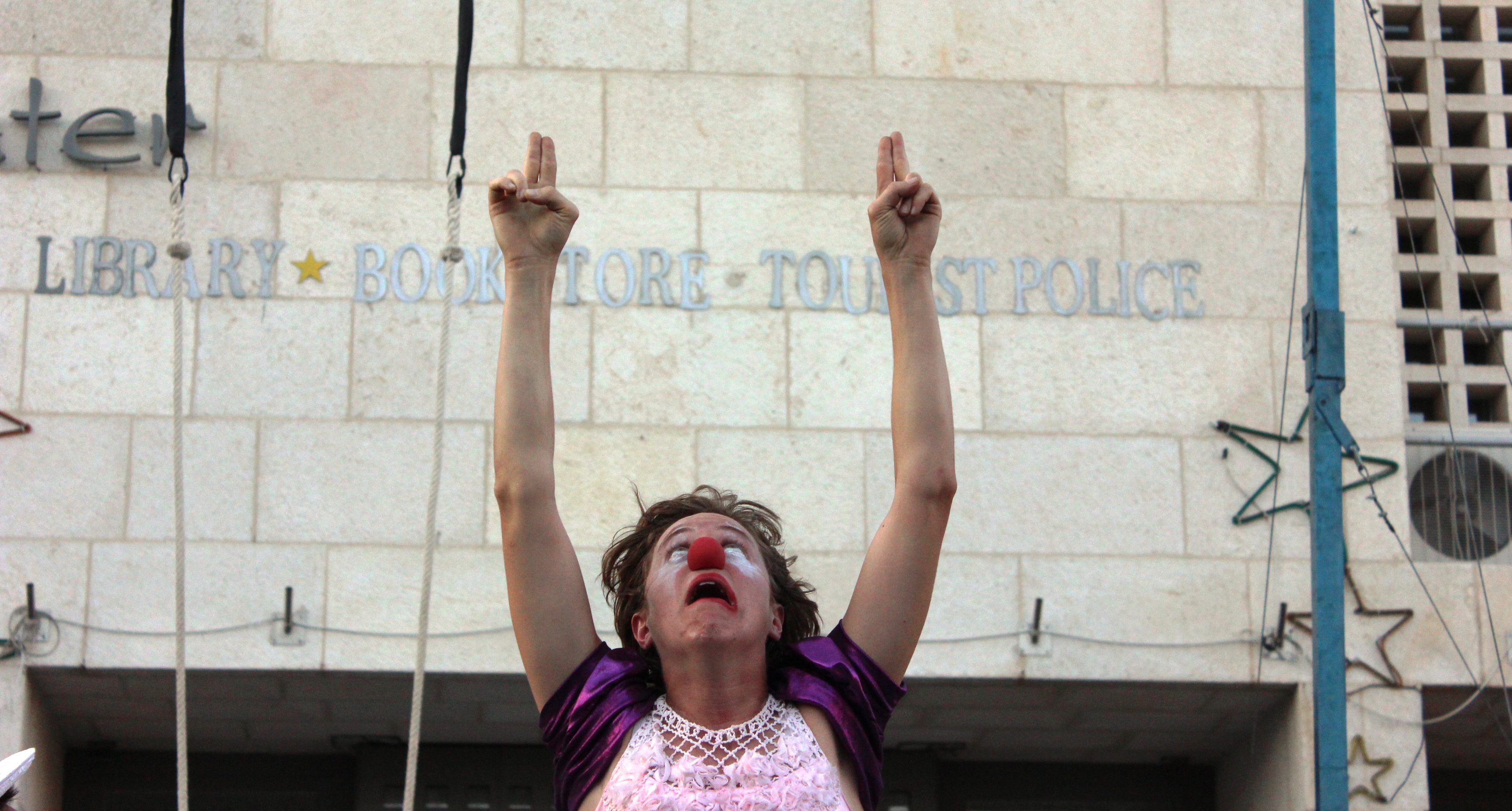 Taken in 2012, this is a colour photograph of a summer school that was organised by the Palestinian Circus School (PCS) in Birzeit, north of Israeli-occupied Ramallah.