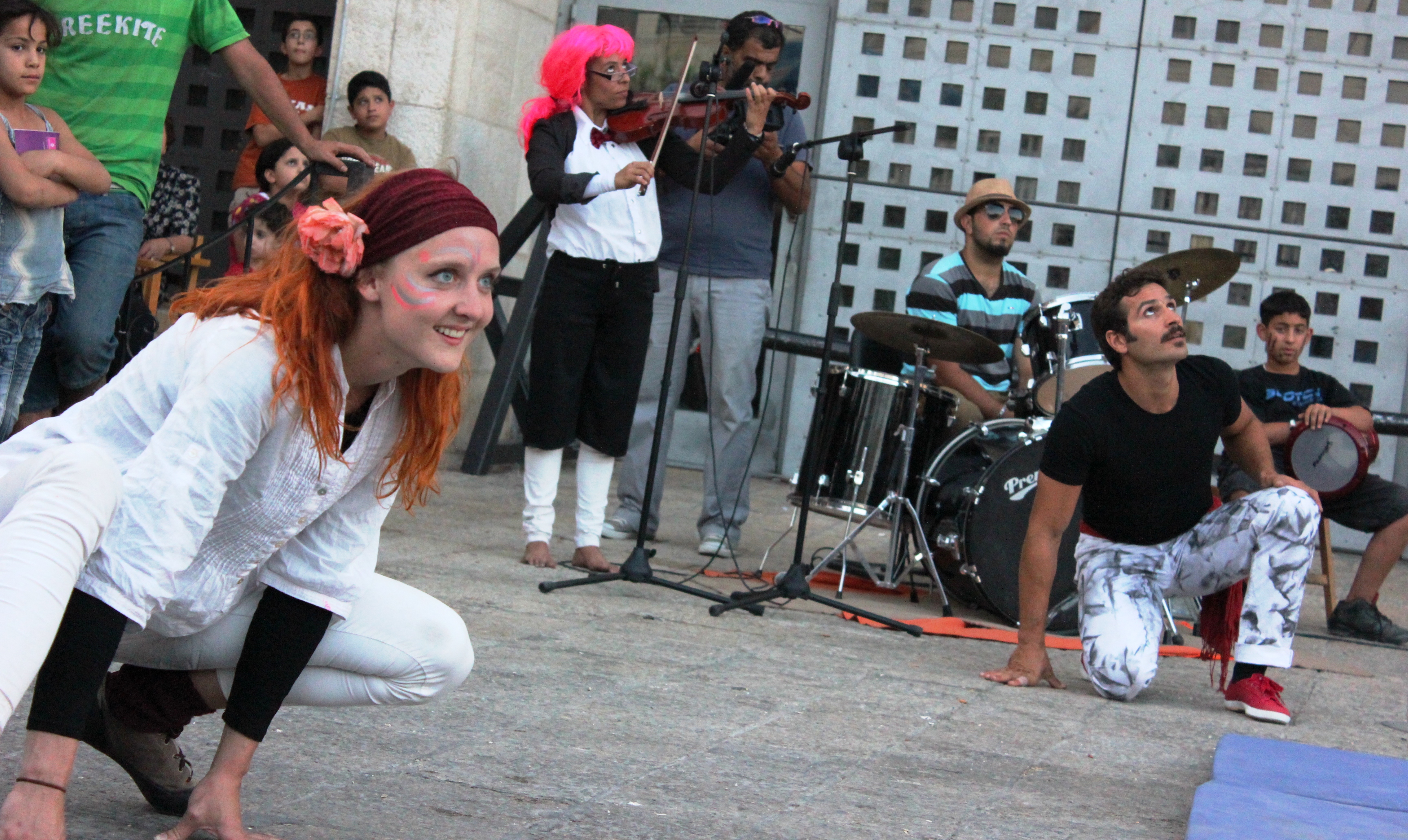 Taken in 2012, this is a colour photograph of a summer school that was organised by the Palestinian Circus School (PCS) in Birzeit, north of Israeli-occupied Ramallah.